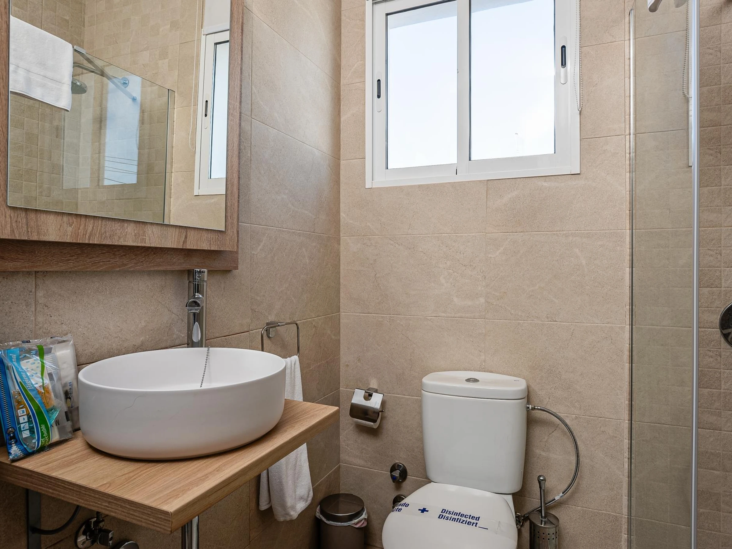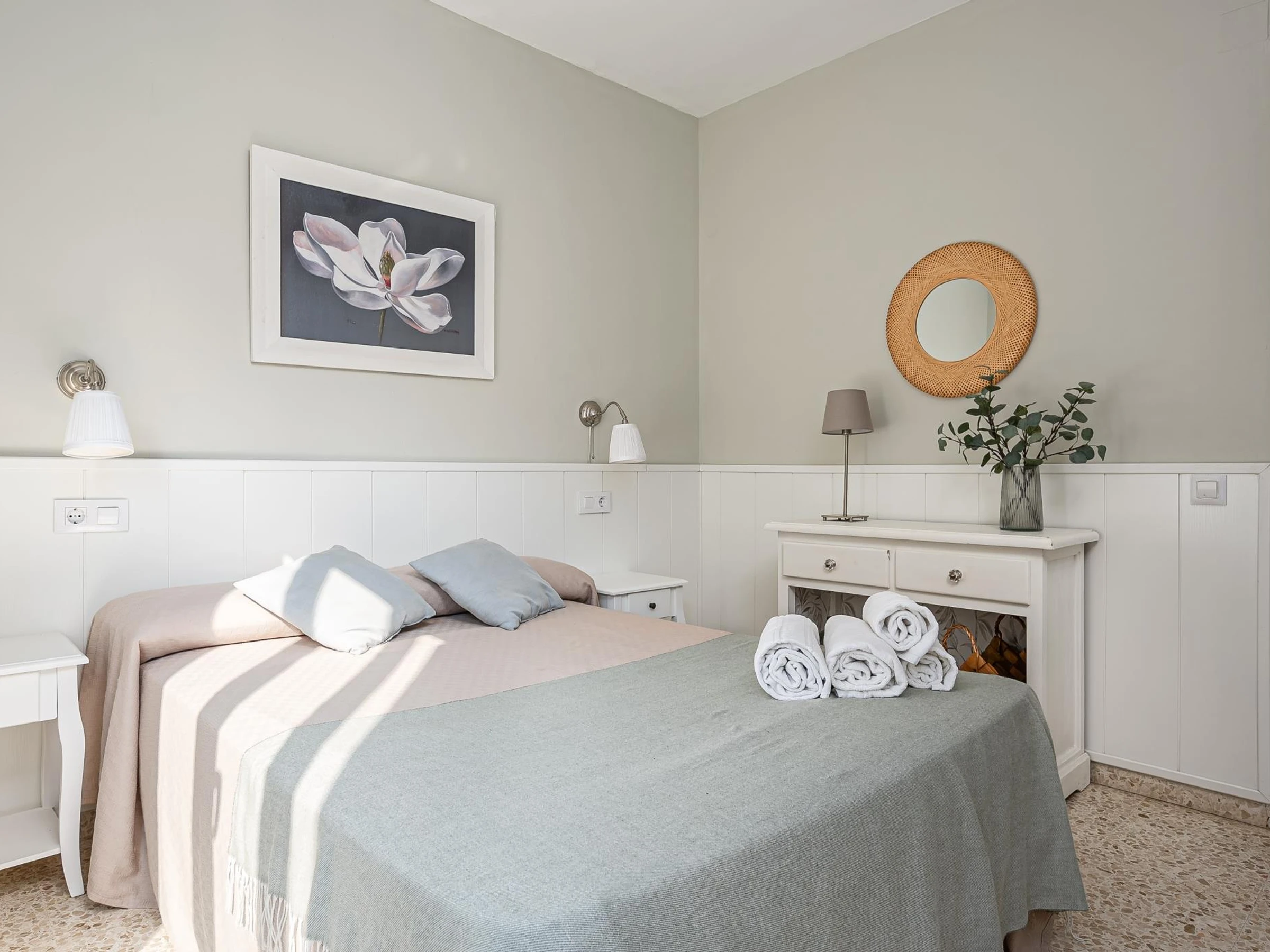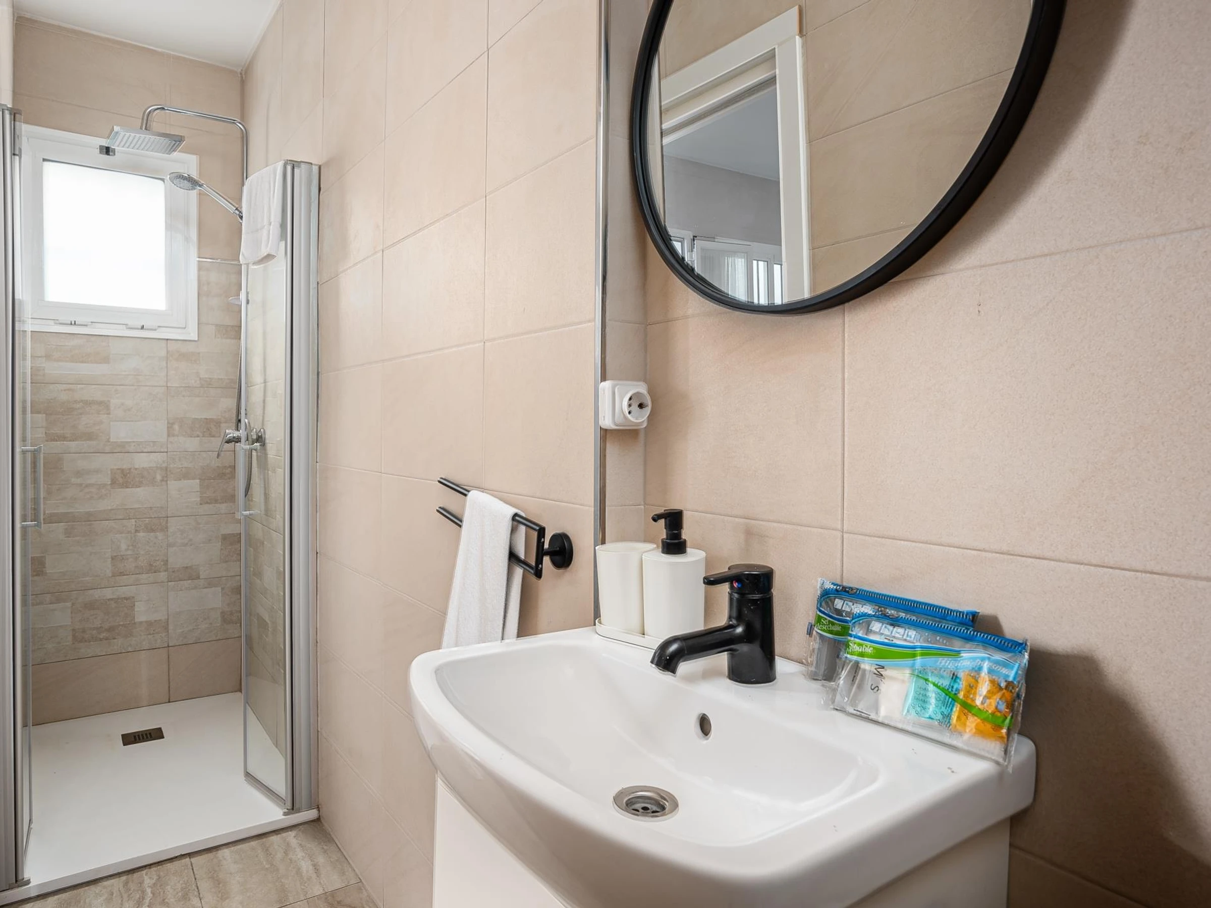 Im ersten Stock befinden sich zwei Schlafzimmer: das Hauptschlafzimmer mit einem 150 cm breiten Doppelbett, Klimaanlage und eigener Terrasse; und das zweite Schlafzimmer mit zwei Einzelbetten und einem großen Kleiderschrank. Zudem gibt es auf dieser Etage ein Badezimmer mit Dusche. Im Erdgeschoss gibt es eine Gästetoilette mit Waschbecken, was zusätzlichen Komfort für die Gäste bietet. Es ist der perfekte Ort, um einen entspannten Aufenthalt in der Nähe des Meeres zu genießen.