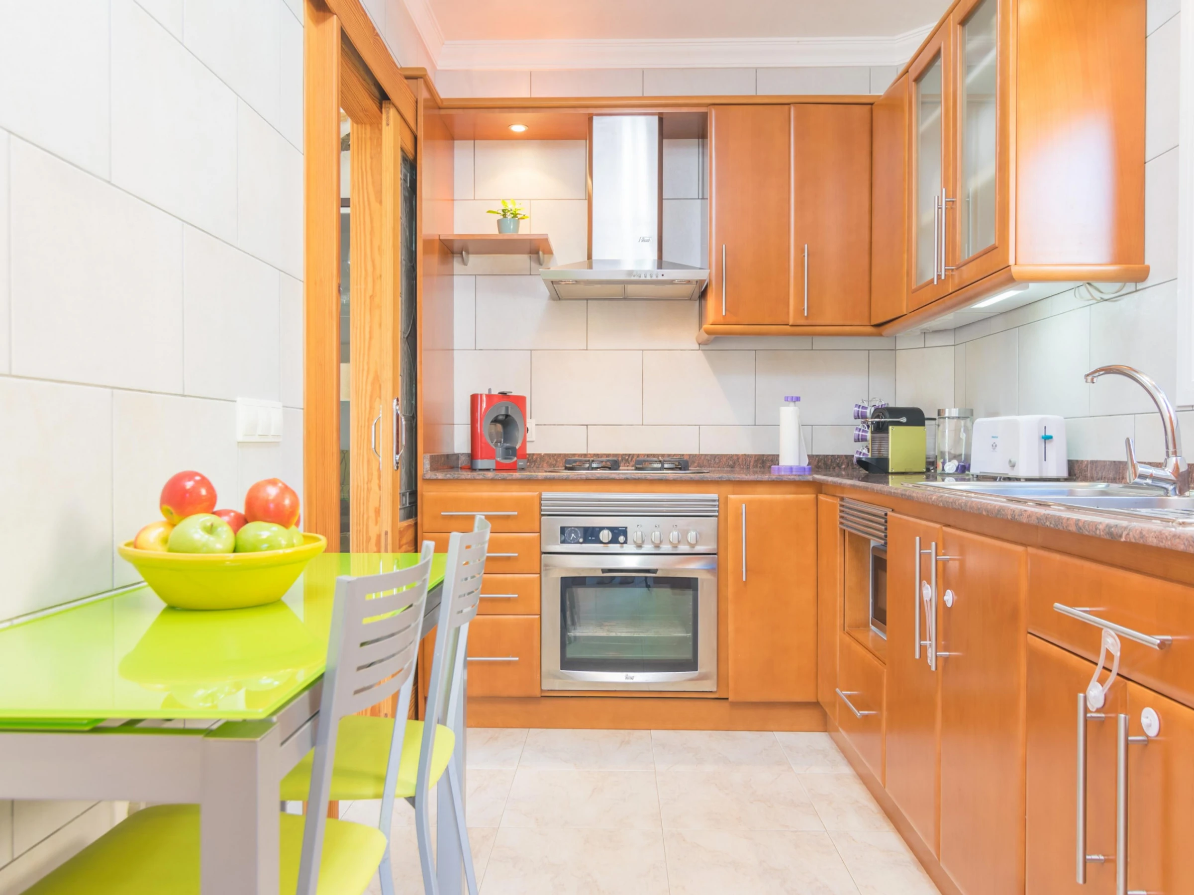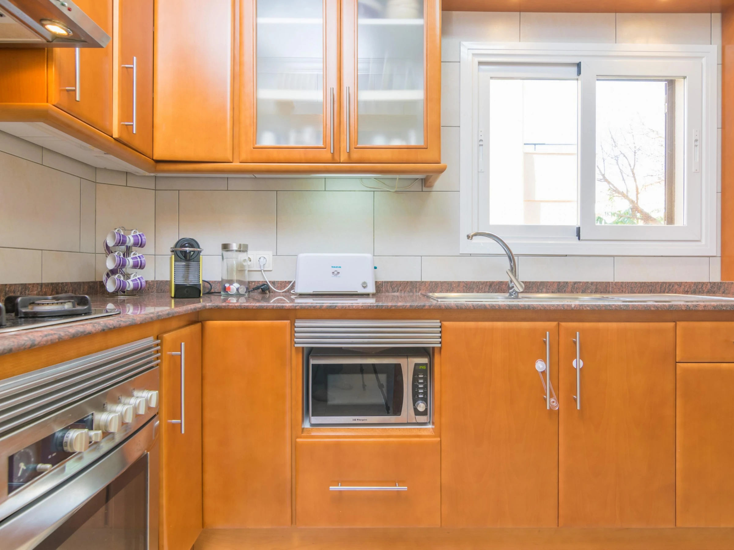Dieses küche, ist ausgestattet in kühlschrank, mikrowelle, backofen, gefrierschrank, spülmaschine, kaffeemaschine und toaster.