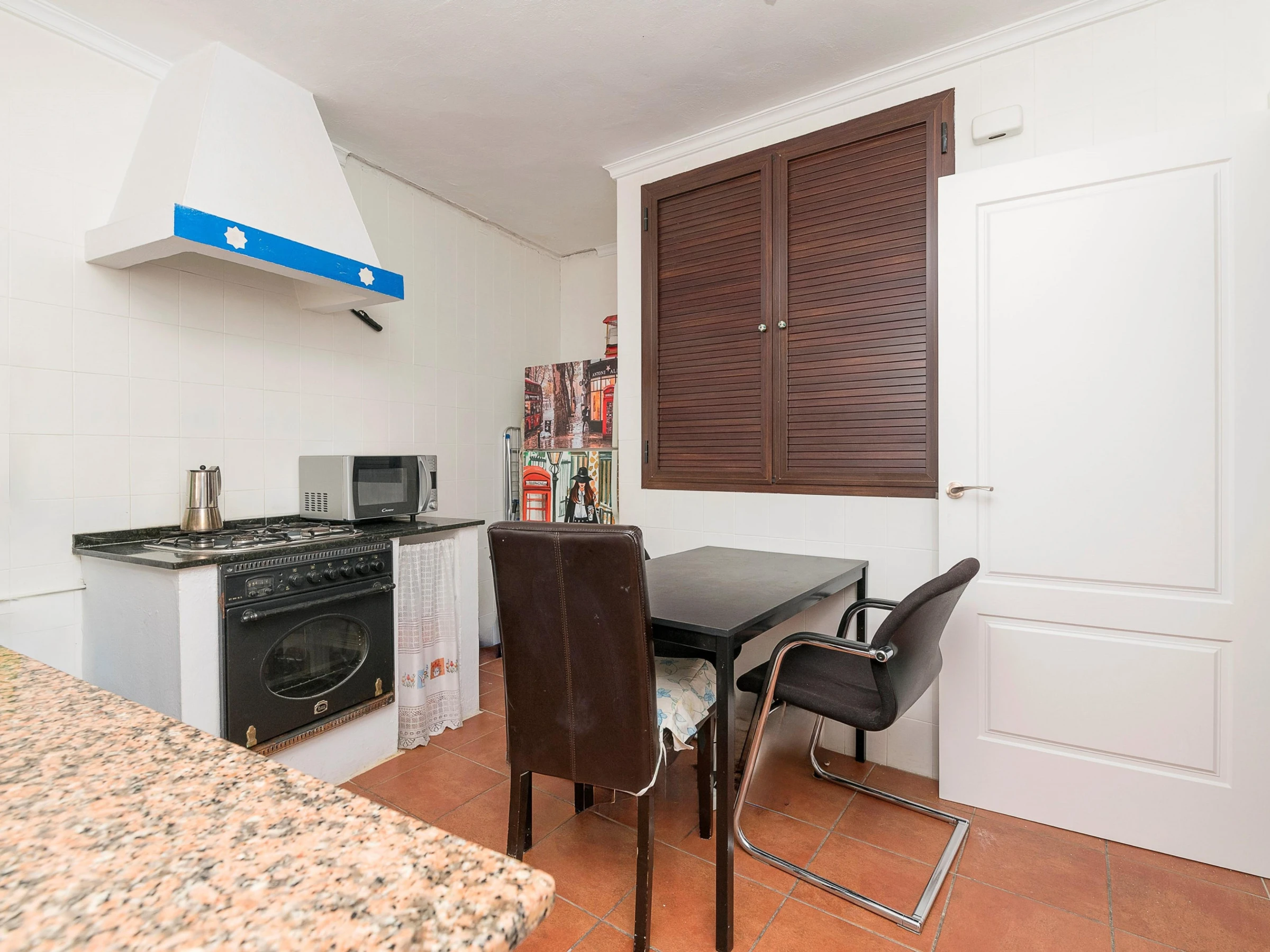 Dieses küche, ist ausgestattet in kühlschrank, mikrowelle, backofen, gefrierschrank, kaffeemaschine und toaster.