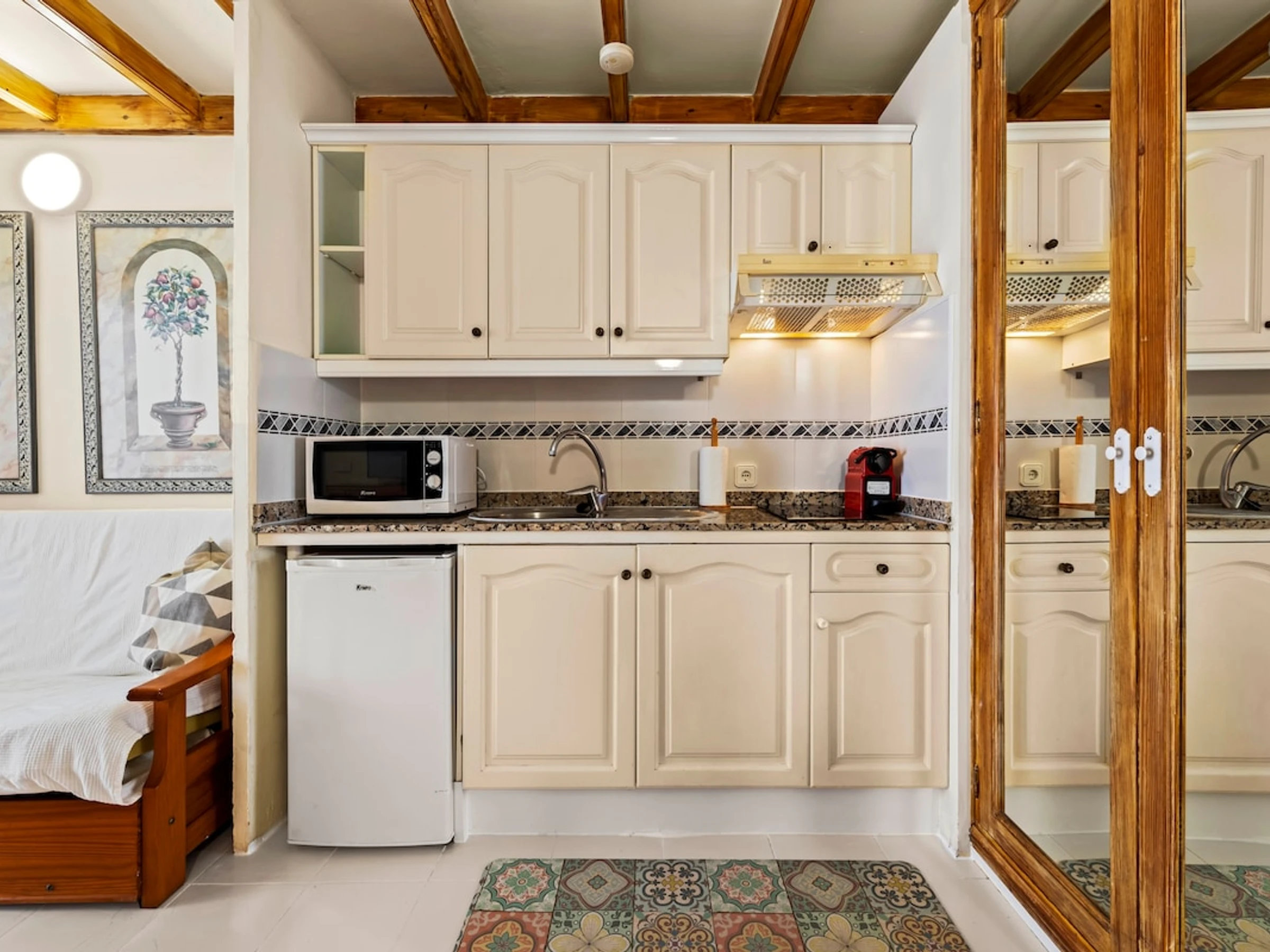 Dieses küche, ist ausgestattet in mikrowelle, kochutensilien und kaffeemaschine.