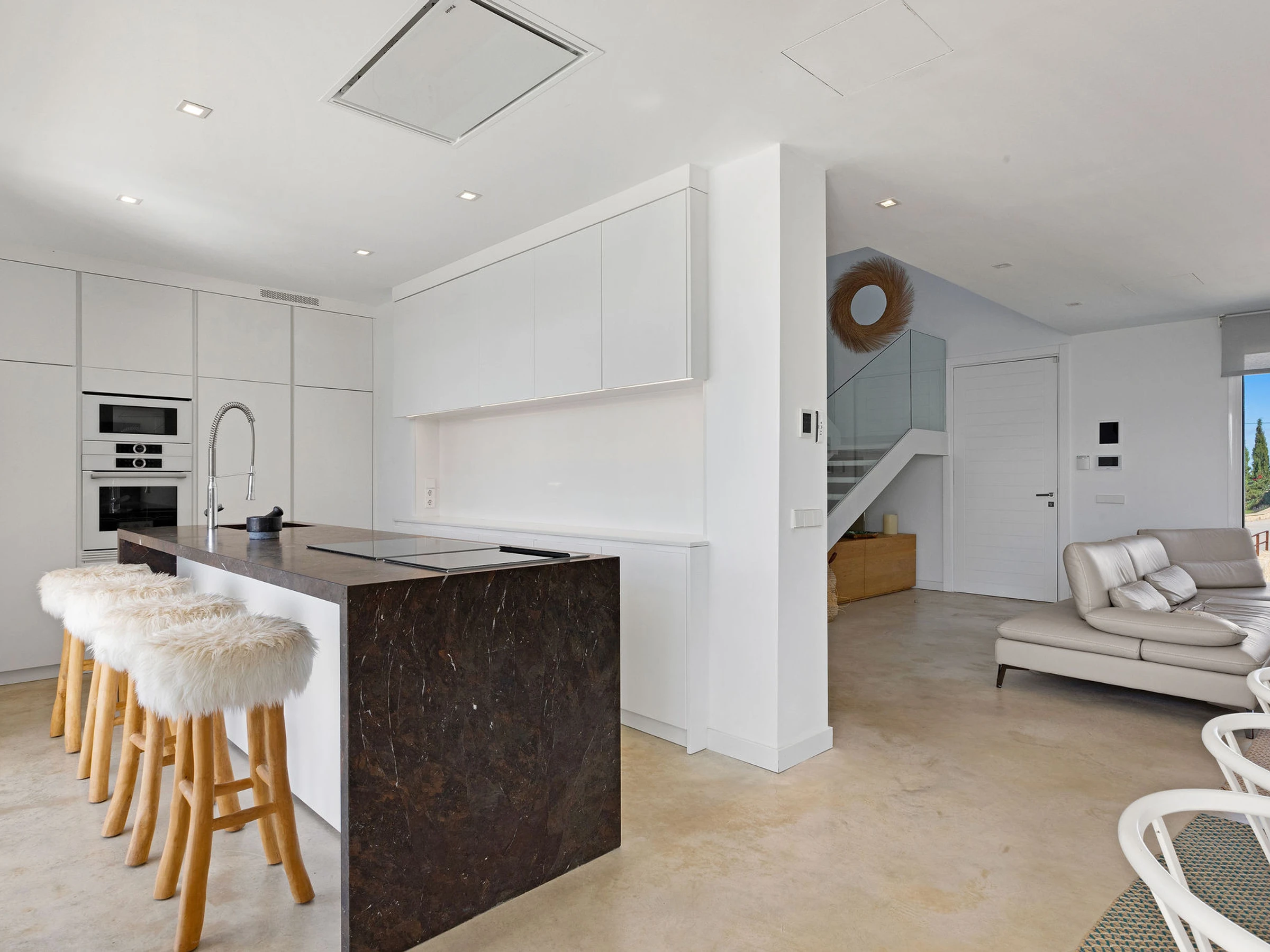 Dieses offene küche, mit induktions-kochfeld, ist ausgestattet in kühlschrank, mikrowelle, backofen, gefrierschrank, spülmaschine, geschirr/besteck, kochutensilien, kaffeemaschine, toaster, wasserkocher und saftpresse.