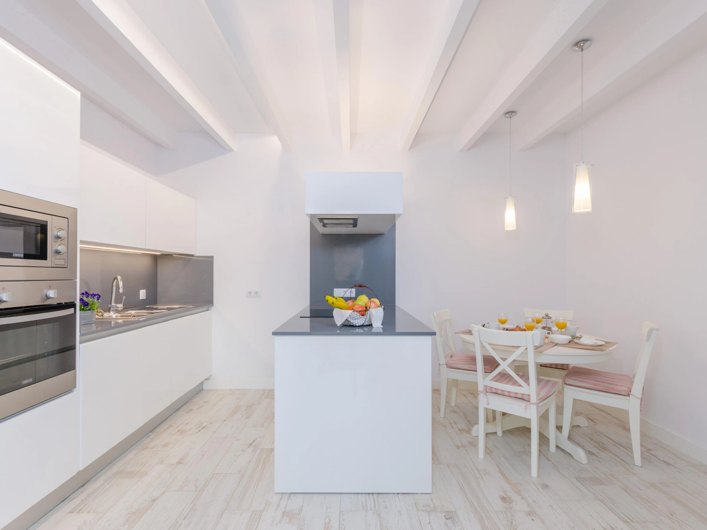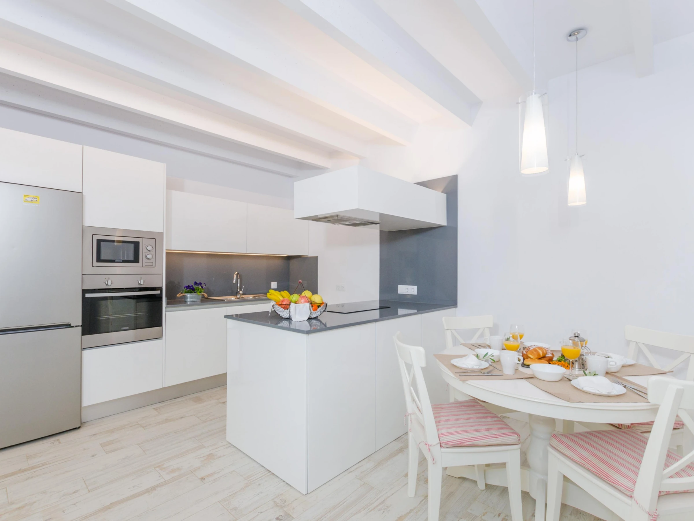 Dieses küche, ist ausgestattet in kühlschrank, mikrowelle, backofen, gefrierschrank, spülmaschine, kaffeemaschine und toaster.