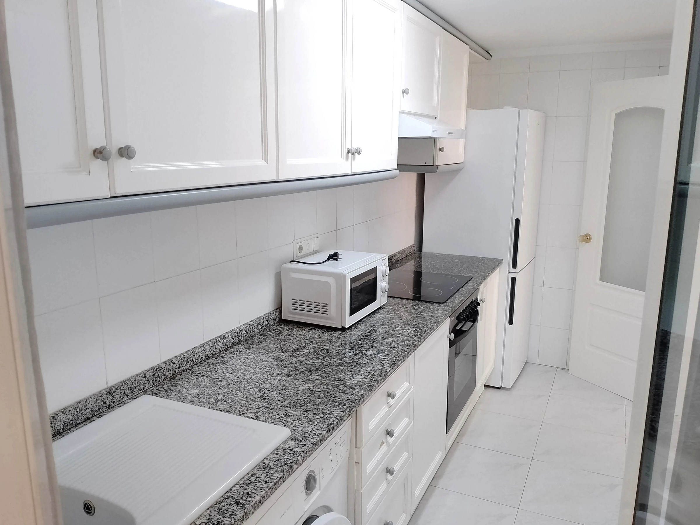 Dieses separate küche, mit ceranfeld, ist ausgestattet in kühlschrank, mikrowelle, backofen, gefrierschrank, geschirr/besteck, kochutensilien und kaffeemaschine.