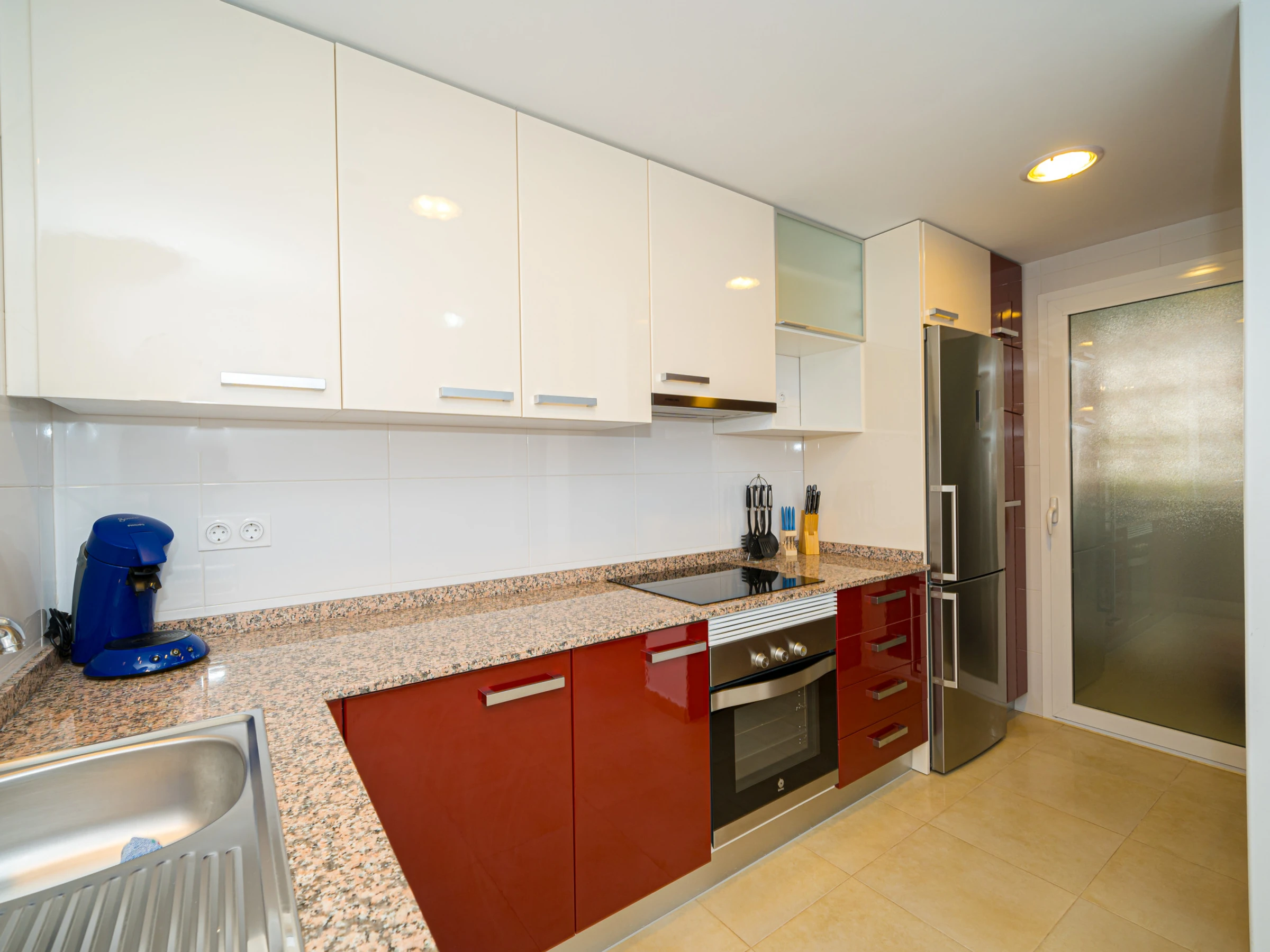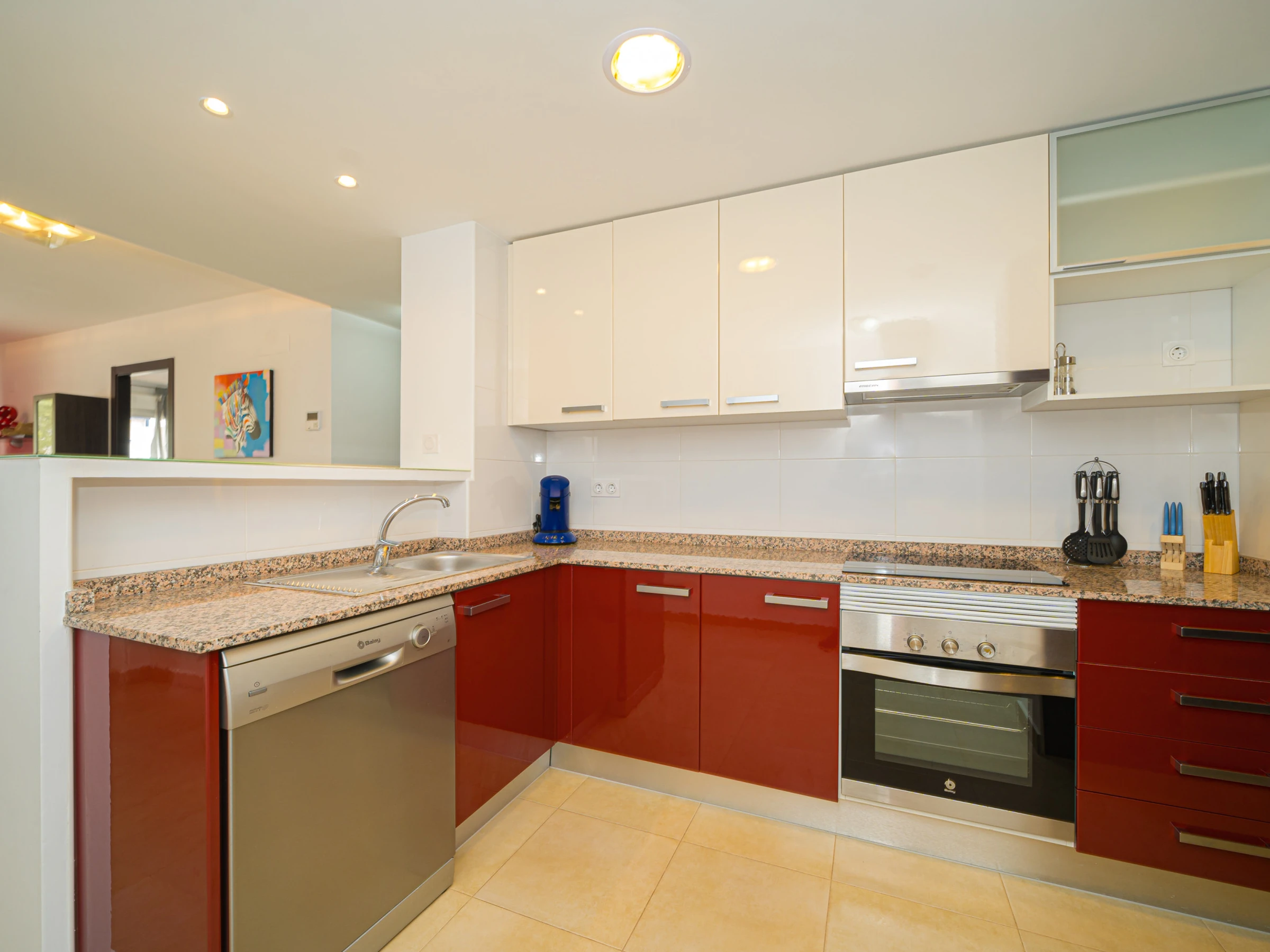 Dieses offene küche, mit ceranfeld, ist ausgestattet in kühlschrank, mikrowelle, backofen, gefrierschrank, spülmaschine, geschirr/besteck, kochutensilien, kaffeemaschine, toaster und wasserkocher.