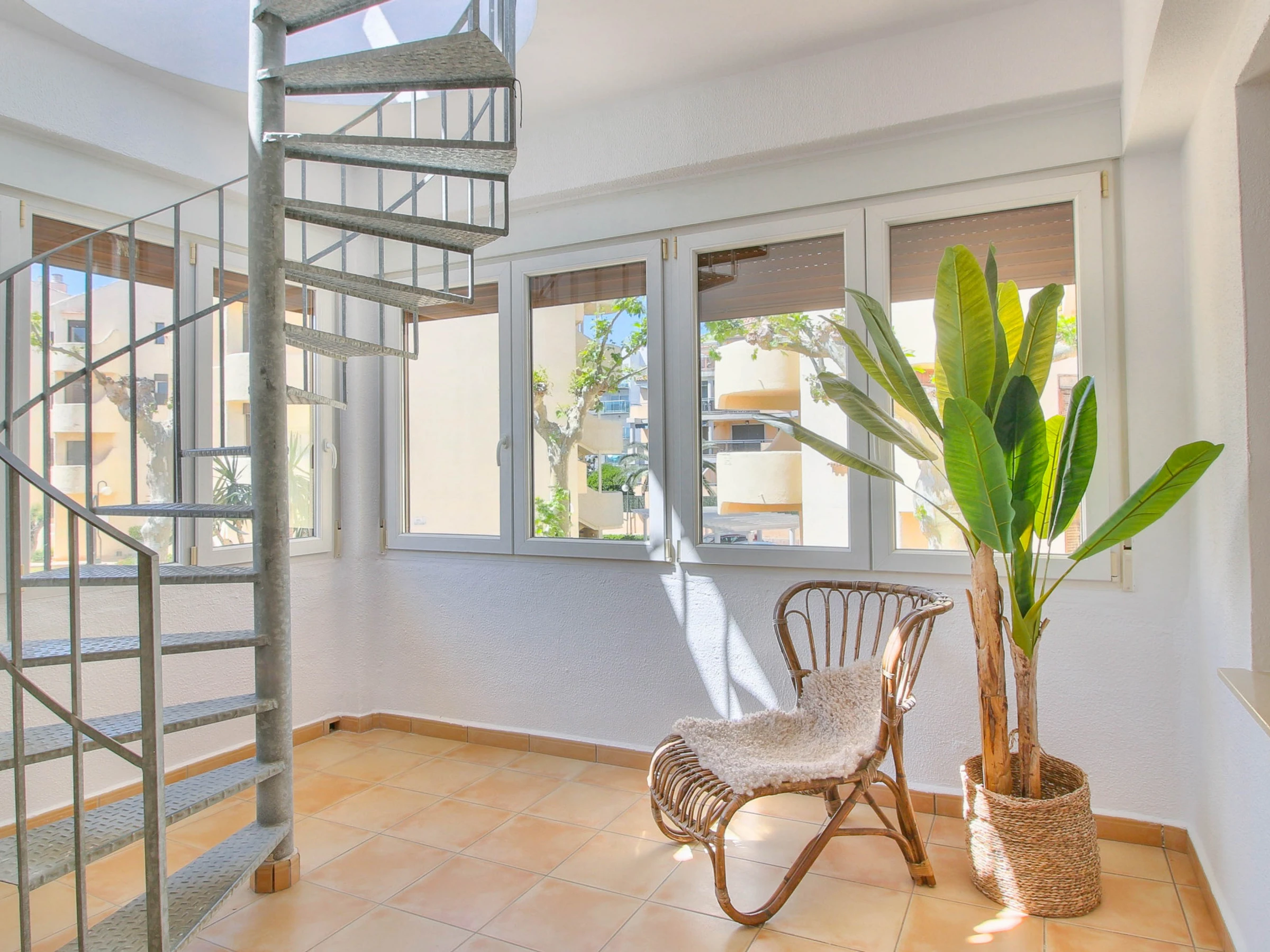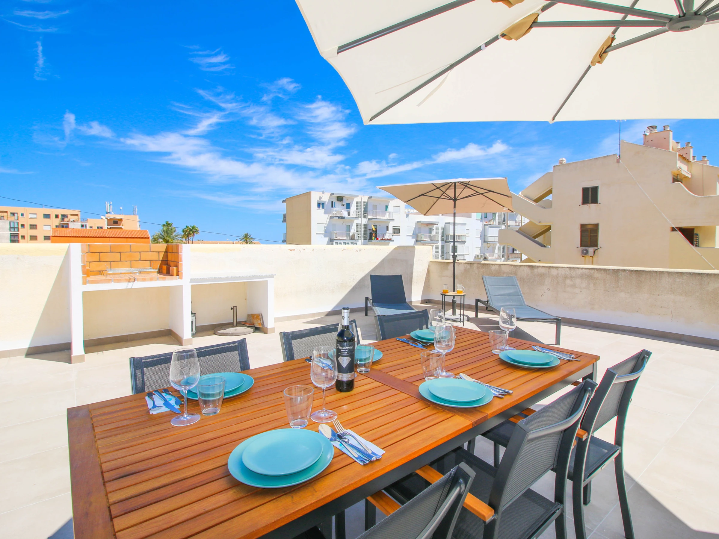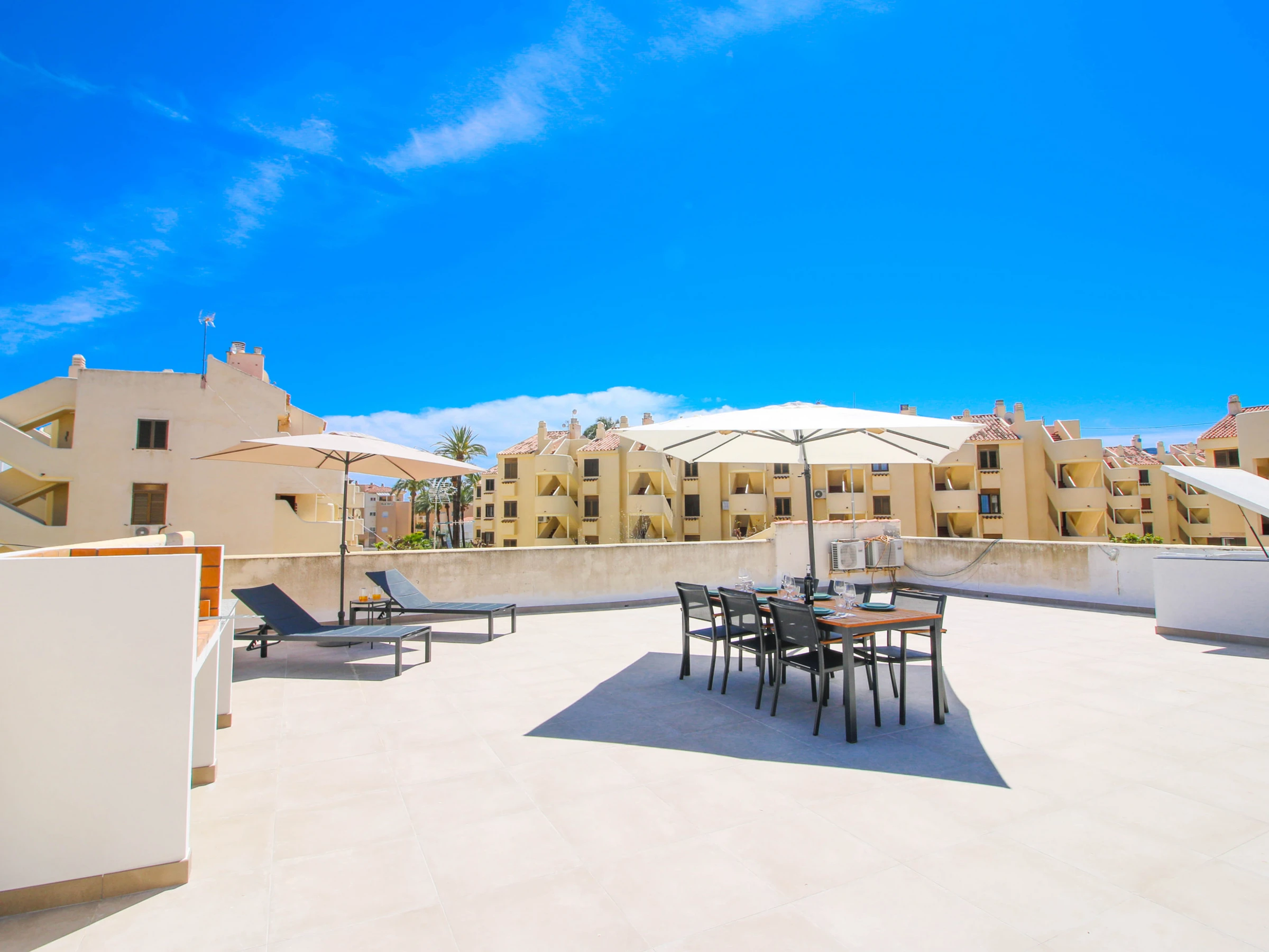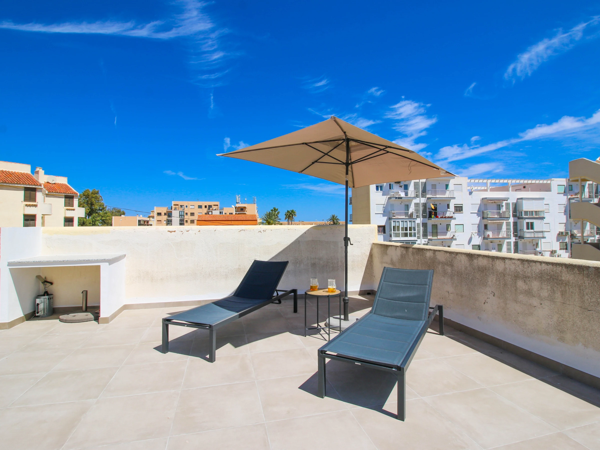 Von der Halle aus, die Wendeltreppe hinaufsteigend, befindet sich die Terrasse, die eine Luke mit hydraulischen Aufhängungen zum Öffnen hat. Diese fantastische Terrasse verfügt über einen Grill, Außenmöbel und Liegen, wo Sie die sonnigen Sommertage genießen können.