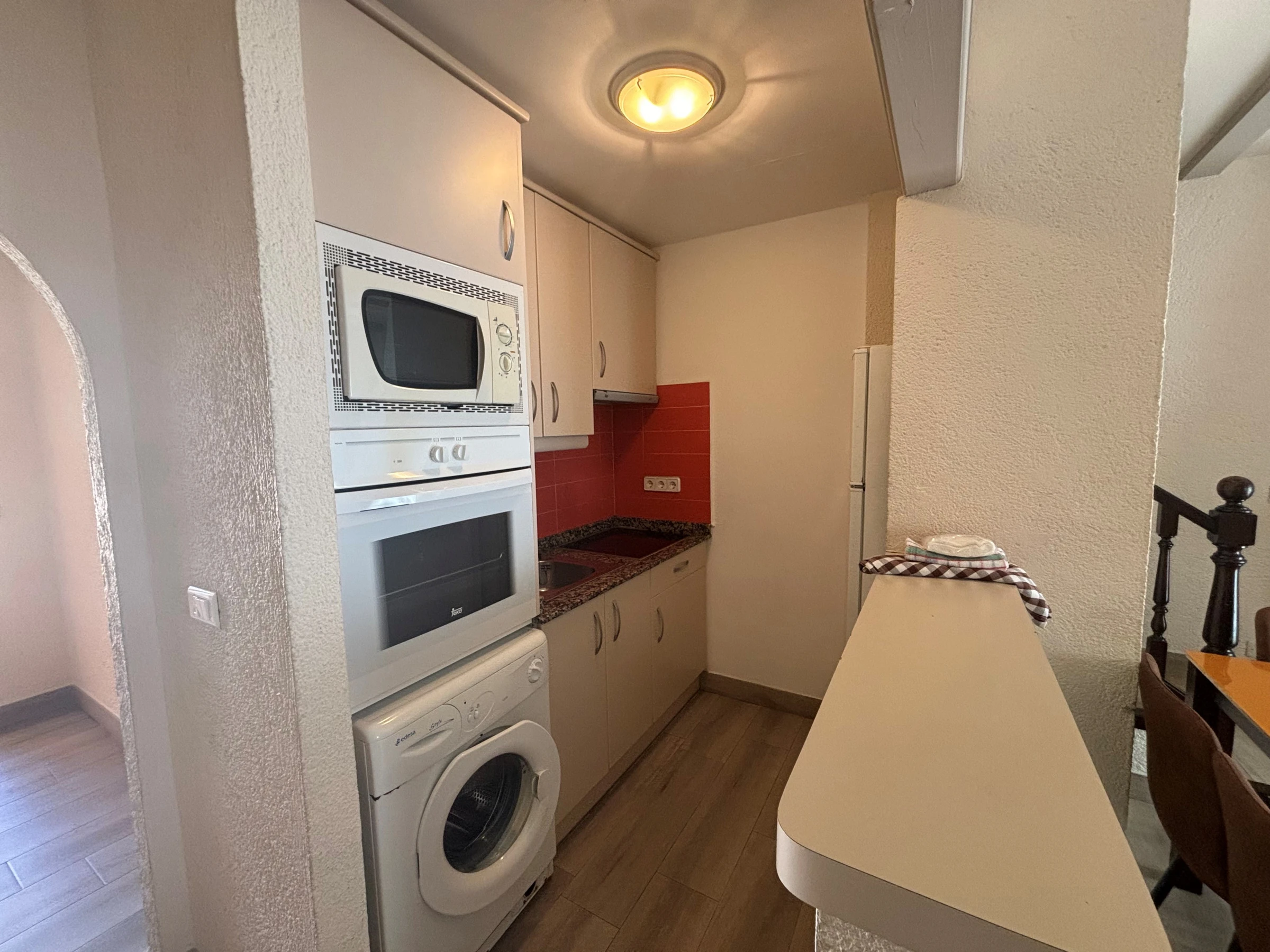 Die offene Küche mit Cerankochfeld ist mit einem Kühlschrank, einer Mikrowelle, einem Backofen, einem Gefrierschrank und einer Waschmaschine ausgestattet.