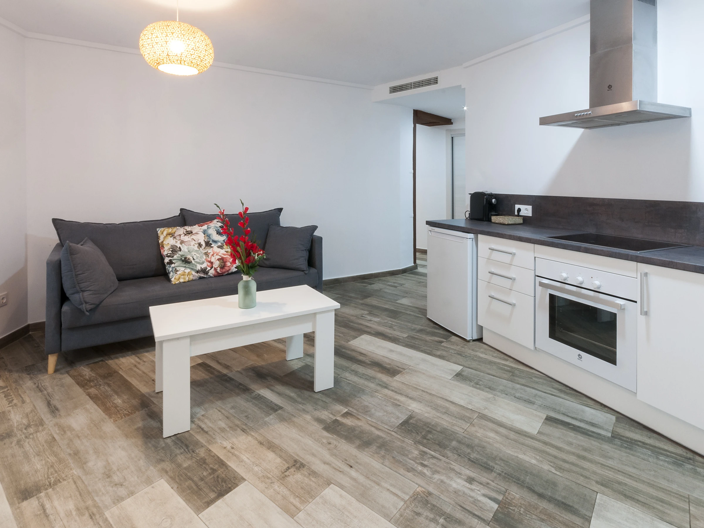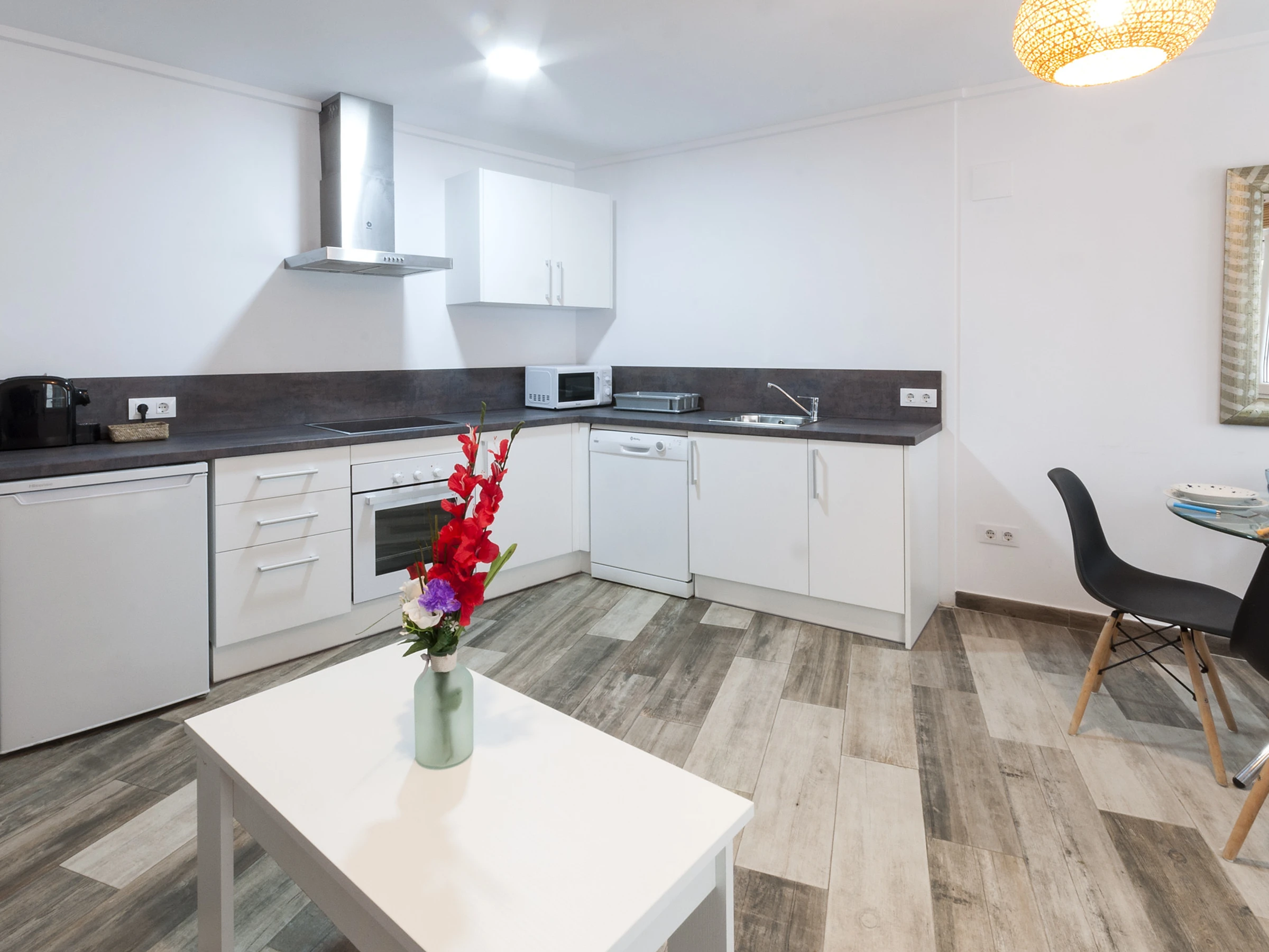 Dieses küche, ist ausgestattet in mikrowelle, gefrierschrank, kaffeemaschine und toaster.