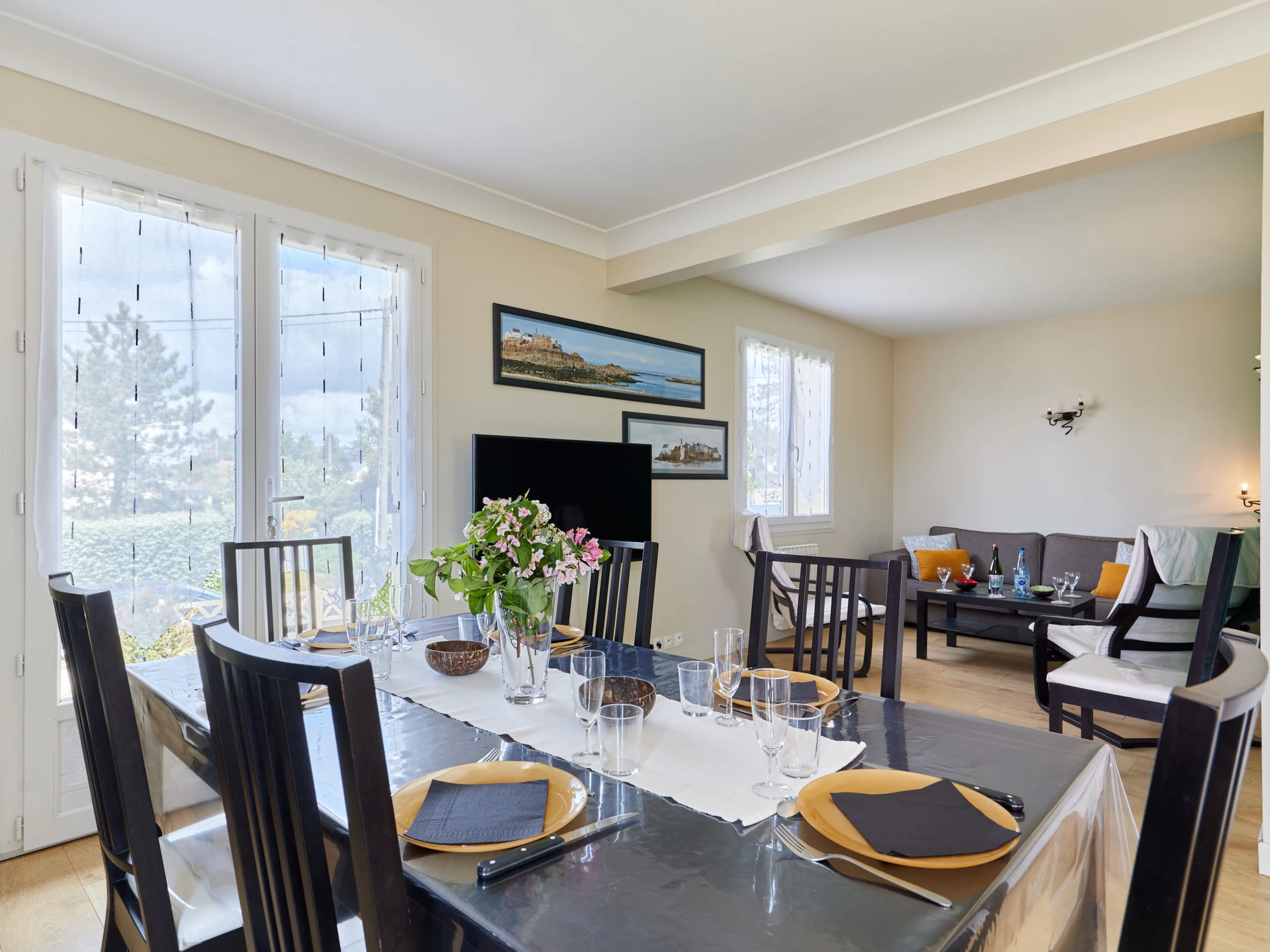 Einfamilienhaus "Bellevue". Im Ort, 200 m vom Zentrum, ruhige Lage, 150 m vom Meer, 150 m vom Strand. Zur Alleinbenutzung: Grundstück 400 m2 (eingezäunt), Parkplatz (für 2 Autos). Lebensmittelgeschäft 6 km, Restaurant 300 m, Bäckerei 6 km, Bushaltestelle "Mairie" 5 km, Sandstrand "Denneville" 300 m. Sporthafen 14 km, Golfplatz (18 Loch) 38 km, Segelschule 6 km, Reitstall 6 km. Nahe gelegene Sehenswürdigkeiten: Portbail 6 km, Carteret 14 km, Cherbourg 43 km, Granville 65 km, Coutances 39 km, Le Mont saint Michel 120 km.