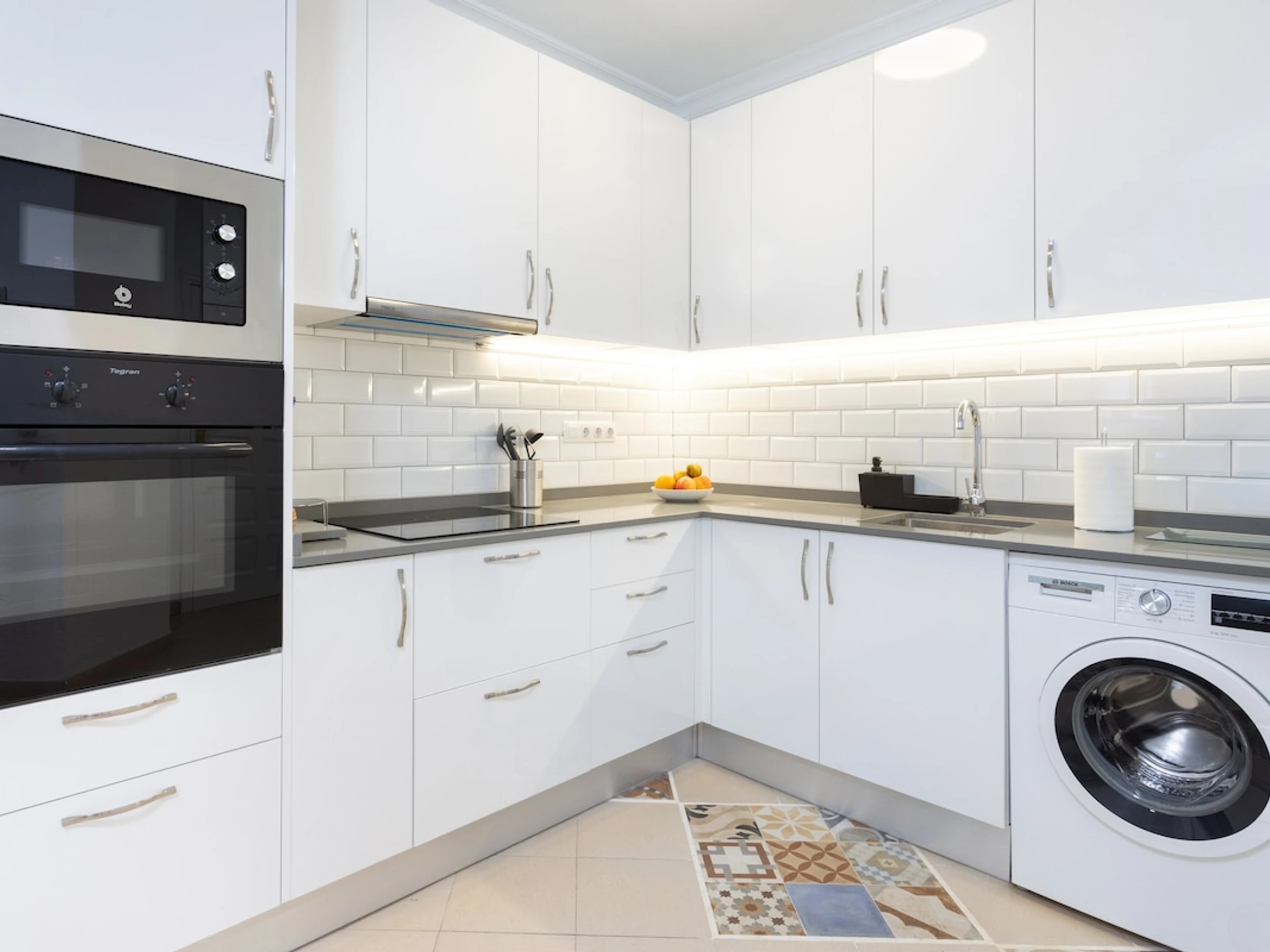 Dieses küche, ist ausgestattet in mikrowelle, backofen, kochutensilien und kaffeemaschine.