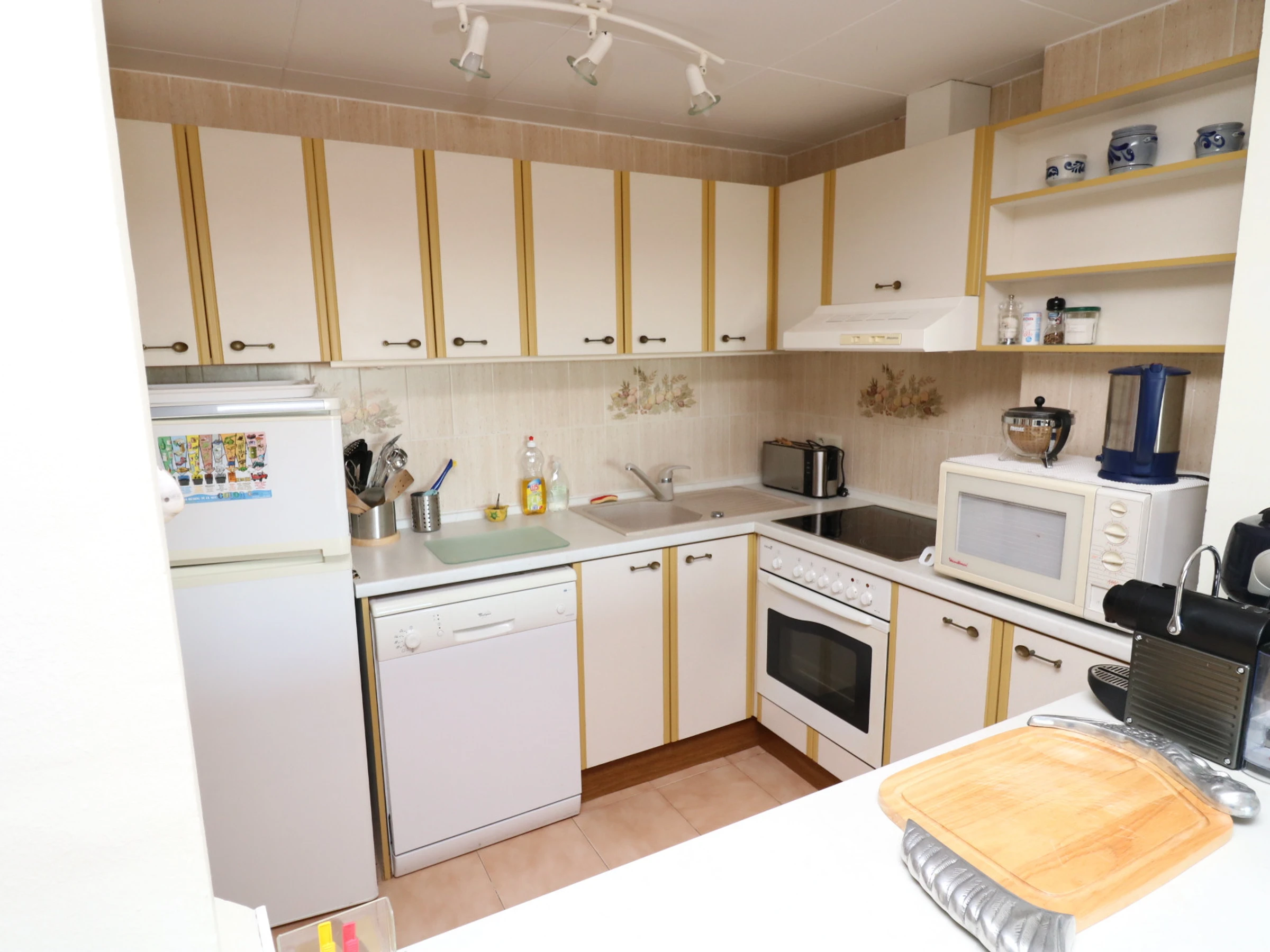 Die amerikanische Küche mit Induktionskochfeld ist mit Kühlschrank, Mikrowelle, Backofen, Gefrierschrank und Waschmaschine ausgestattet.