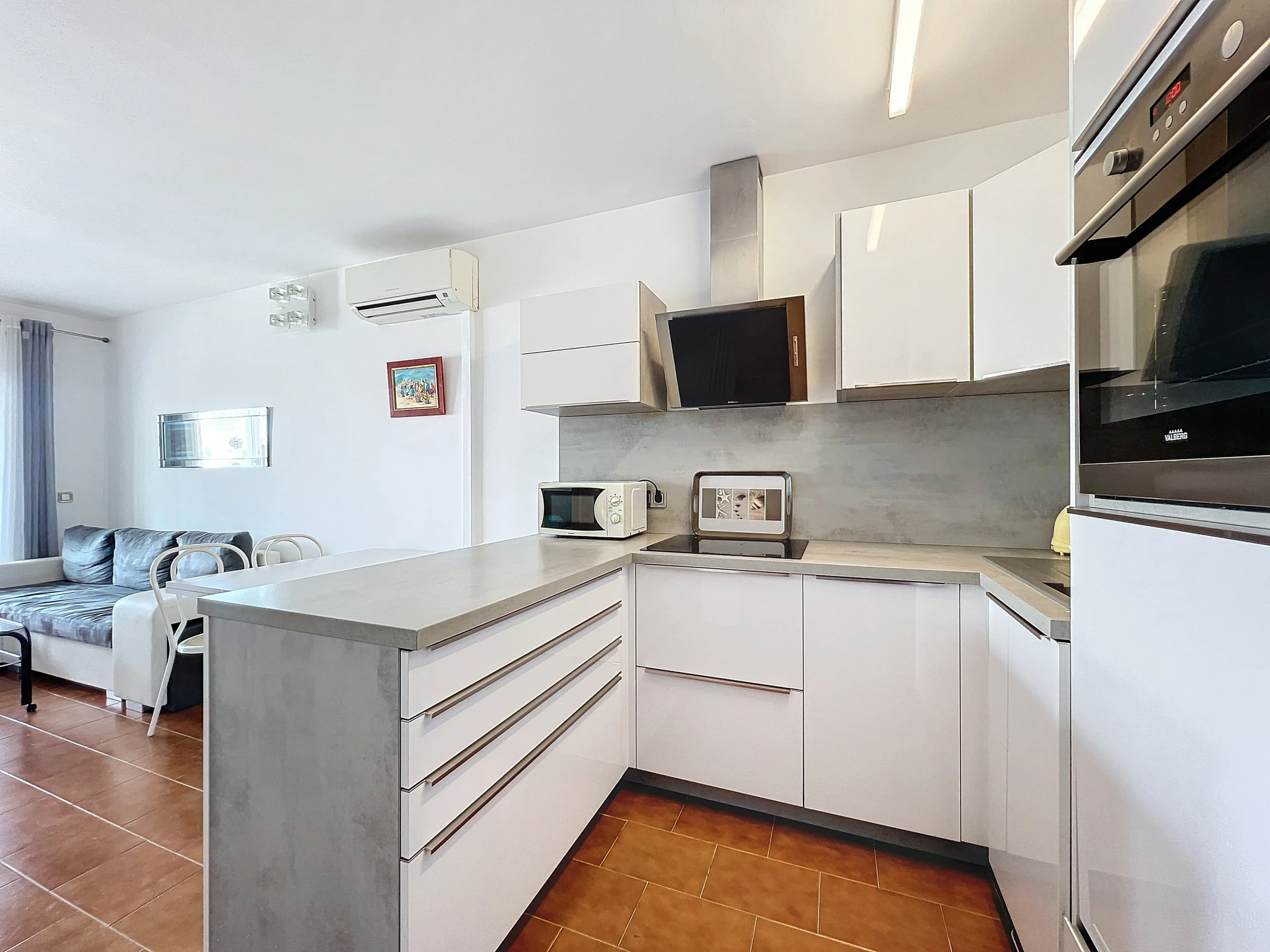 Die voll ausgestattete Küche ermöglicht es Ihnen, Ihre Mahlzeiten wie zu Hause zuzubereiten: Kühlschrank, Gefrierschrank, Geschirr, Küchenutensilien und Kaffeemaschine stehen Ihnen zur Verfügung.
