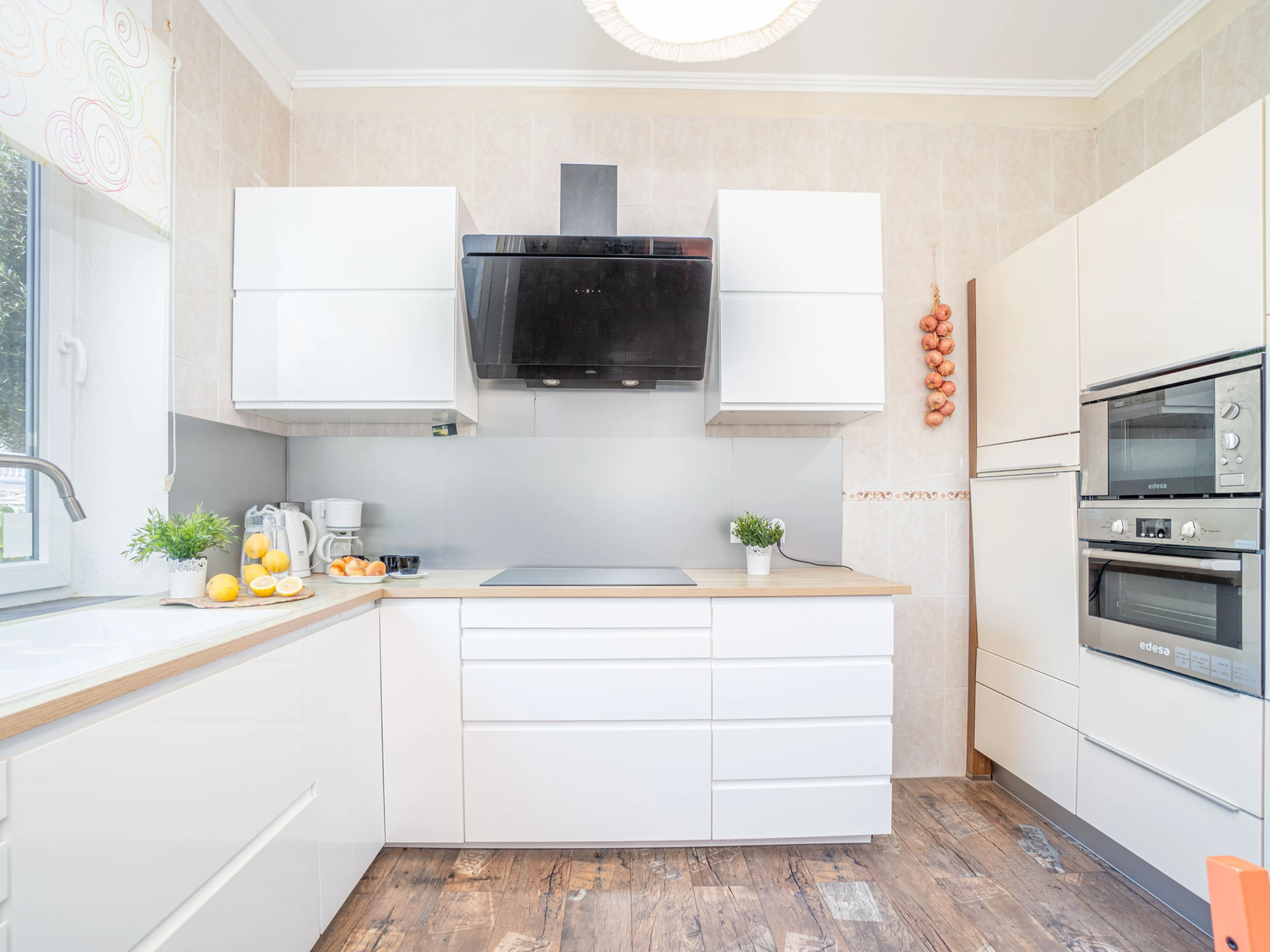 Die separate Küche mit Glaskeramikkochfeld ist mit Kühlschrank, Mikrowelle, Backofen, Gefrierschrank, Geschirrspüler, Geschirr/Besteck, Küchenutensilien, Kaffeemaschine, Toaster und Wasserkocher ausgestattet.