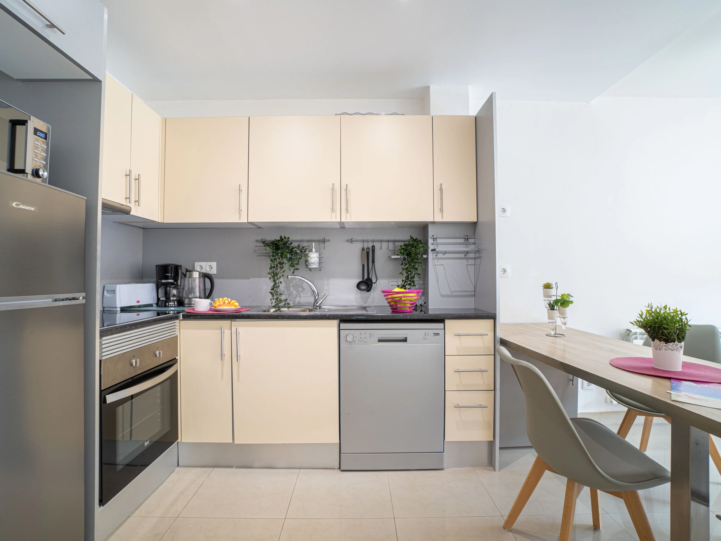 Die offene Küche mit Glaskeramikkochfeld ist mit Kühlschrank, Mikrowelle, Backofen, Gefrierschrank, Waschmaschine, Geschirrspüler, Geschirr/Besteck, Küchenutensilien, Kaffeemaschine, Toaster, Wasserkocher und Zitruspresse ausgestattet.