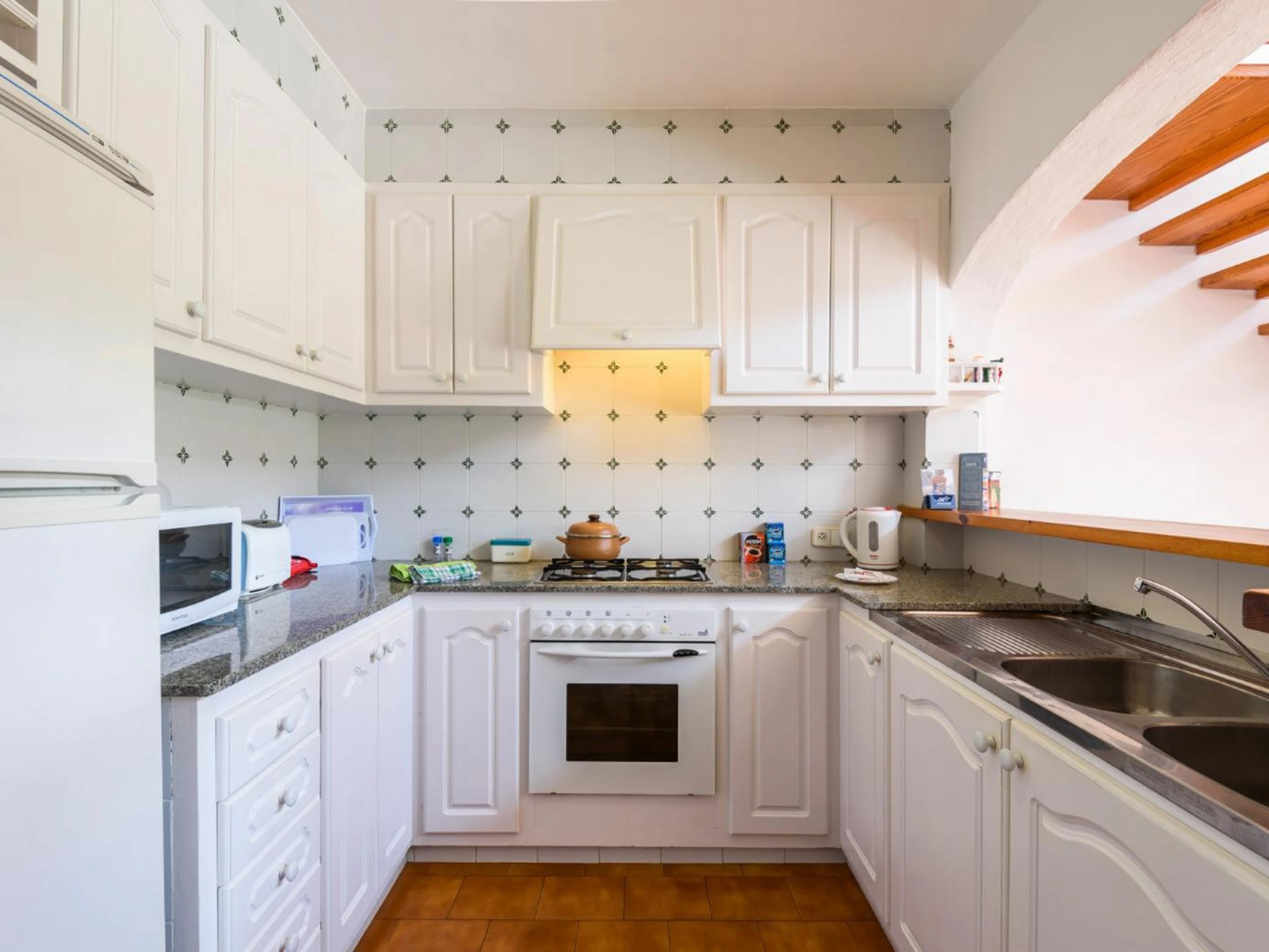 Dieses küche, ist ausgestattet in kühlschrank, mikrowelle, backofen, gefrierschrank, kaffeemaschine und toaster.