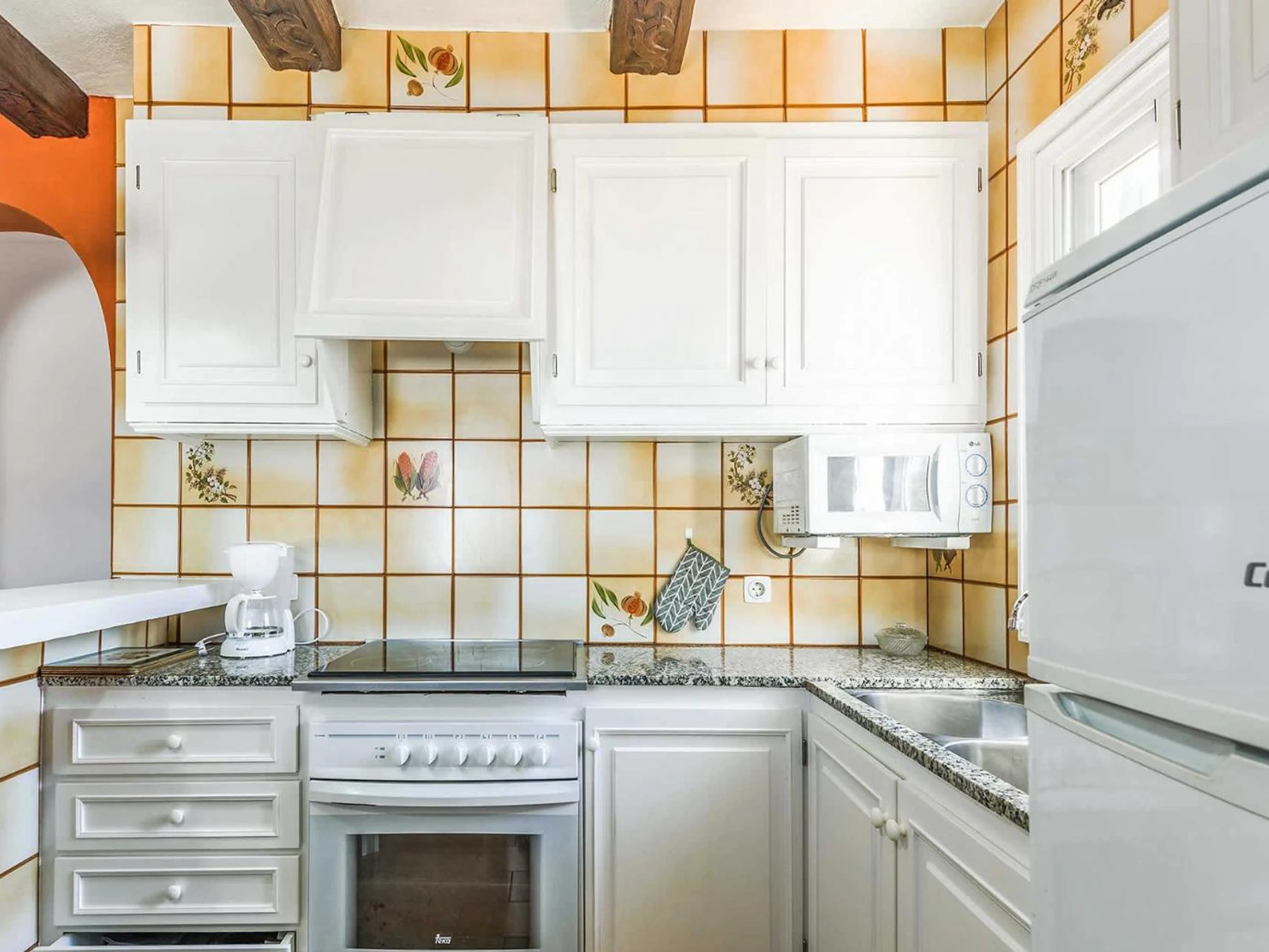Dieses küche, ist ausgestattet in kühlschrank, mikrowelle, backofen, gefrierschrank, kaffeemaschine und toaster.