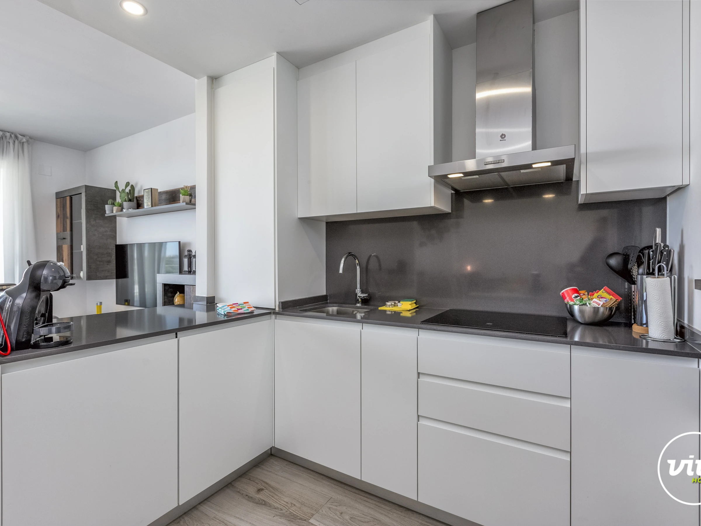 Dieses offene küche, mit induktions-kochfeld, ist ausgestattet in kühlschrank, mikrowelle, backofen, gefrierschrank, spülmaschine, geschirr/besteck, kochutensilien, kaffeemaschine, wasserkocher, küchengeschirr, teller und schüsseln.