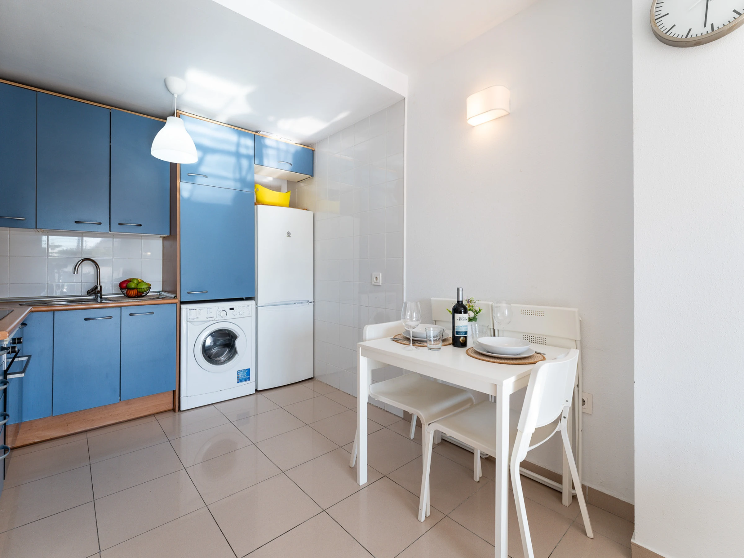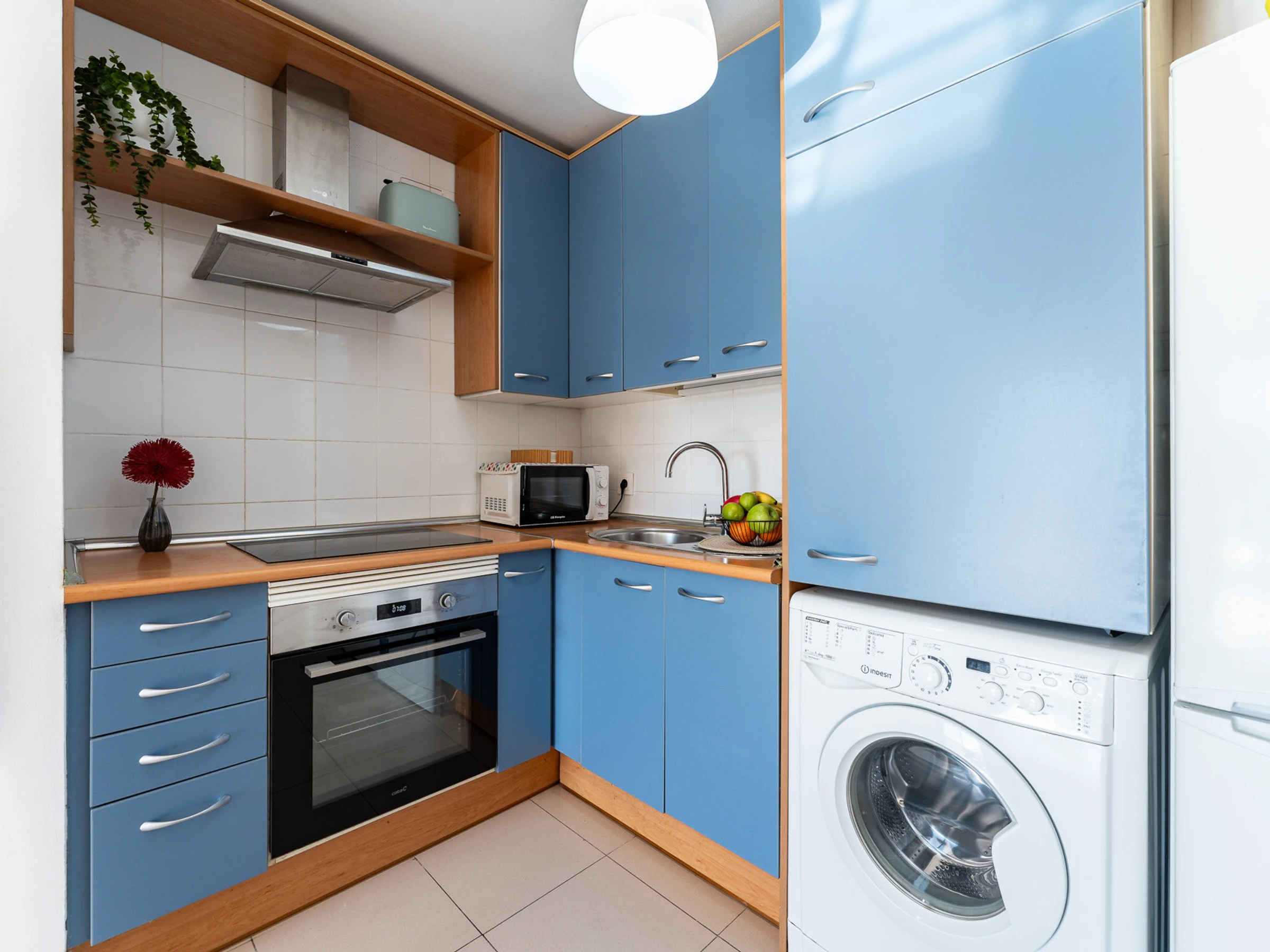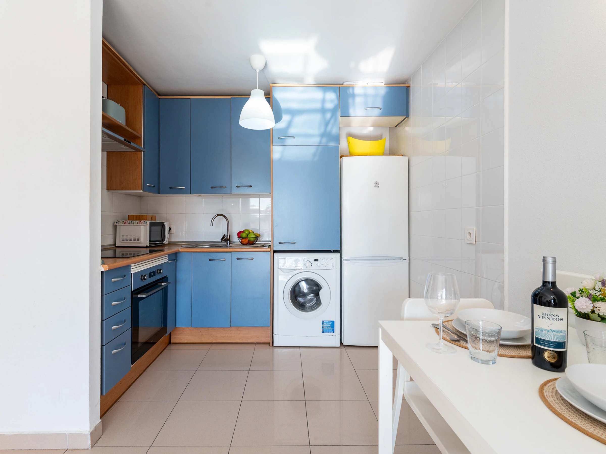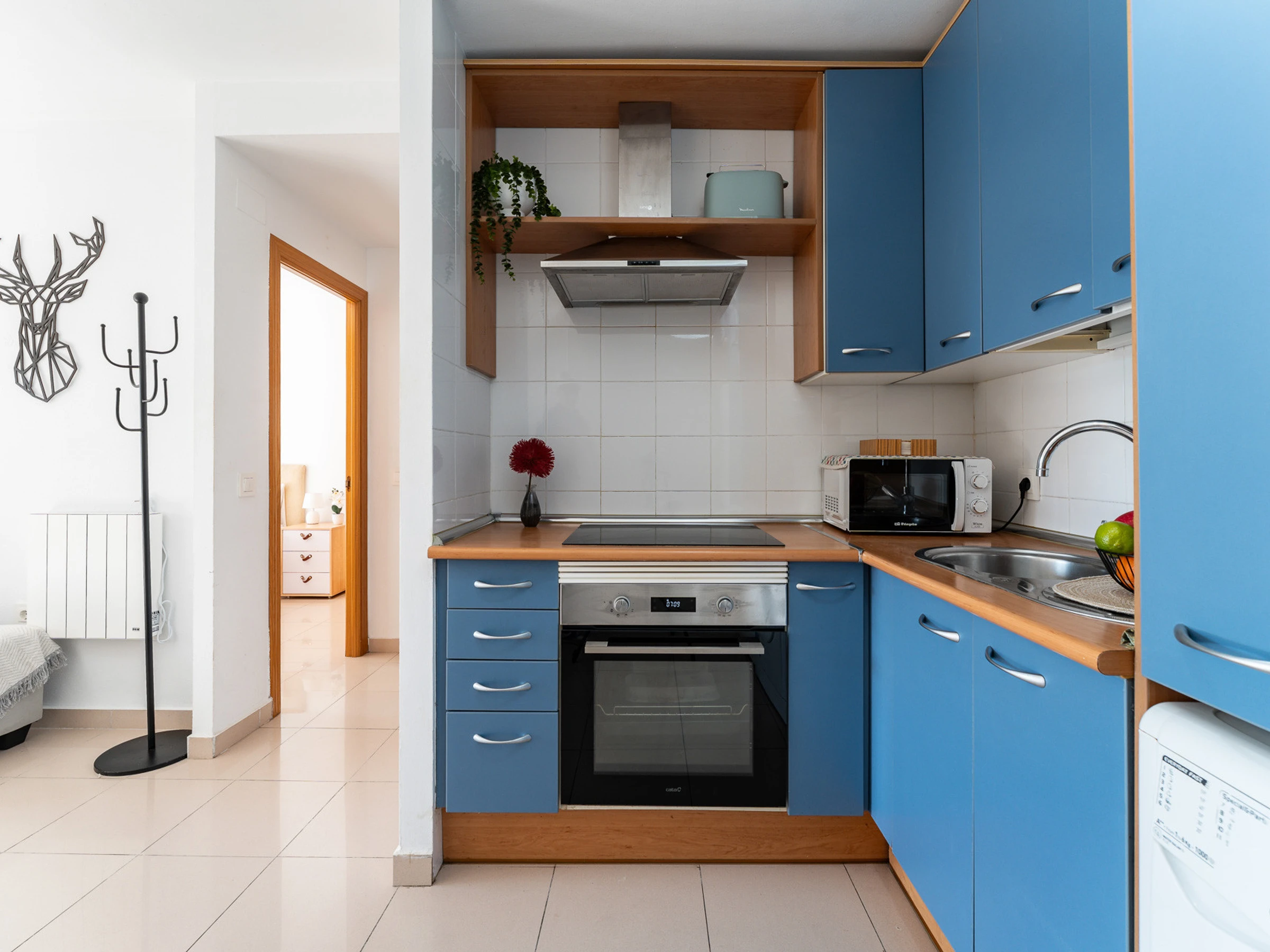 Dieses offene küche, mit ceranfeld, ist ausgestattet in kühlschrank, mikrowelle, backofen, gefrierschrank, geschirr/besteck, kochutensilien, kaffeemaschine, toaster und saftpresse.