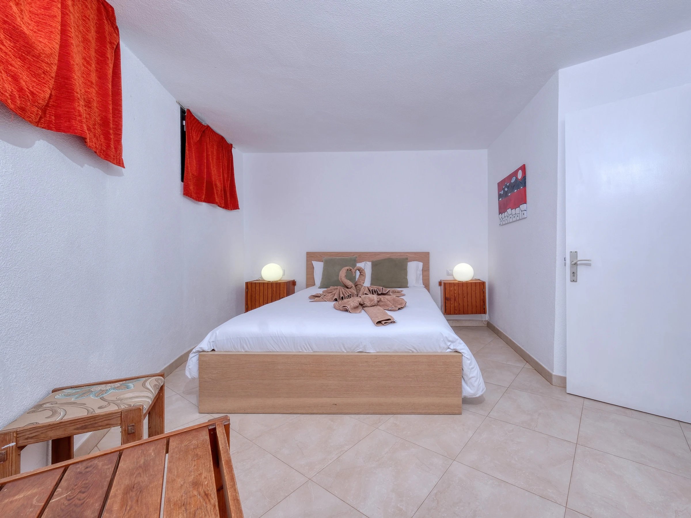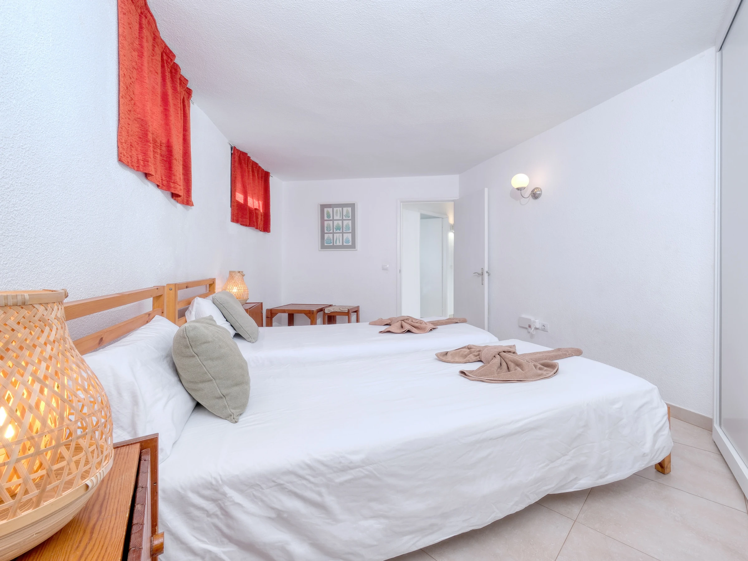 Die Unterkunft verfügt über zwei sorgfältig eingerichtete Zimmer, die darauf ausgelegt sind, Ruhe und Entspannung zu gewährleisten. Ein Zimmer hat ein Doppelbett, das andere verfügt über zwei Einzelbetten. Beide bieten helle und funktionale Räume mit Kleiderschränken und einer zeitgemäßen Einrichtung, die Komfort und Einfachheit kombiniert.
