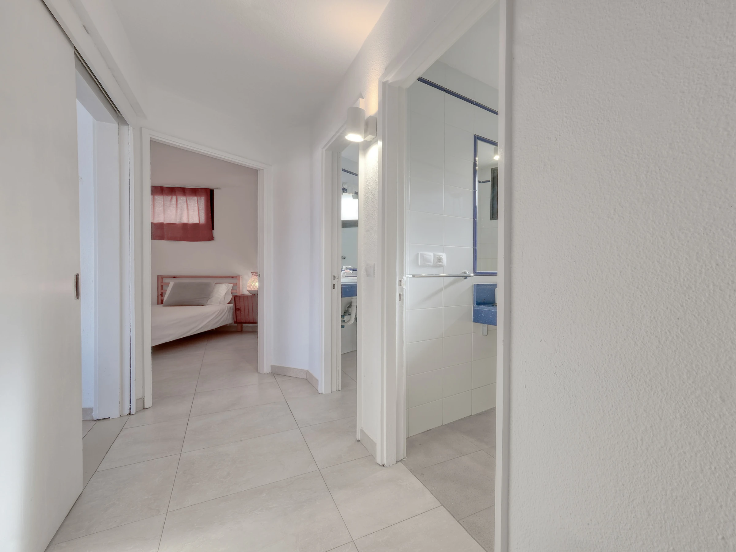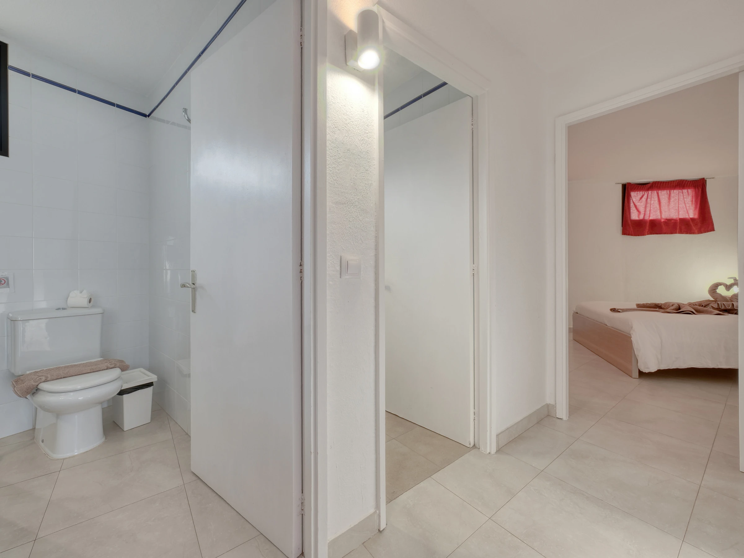 Das Badezimmer ist in zwei unabhängige Räume unterteilt, was während des Aufenthalts mehr Komfort bietet. Ein Bereich verfügt über eine Dusche und ein Waschbecken, während der zweite Raum eine Toilette, ein zusätzliches Waschbecken und eine Waschmaschine enthält, was eine gleichzeitige Nutzung ermöglicht und mehr Funktionalität für Familien oder Gruppen bietet.
