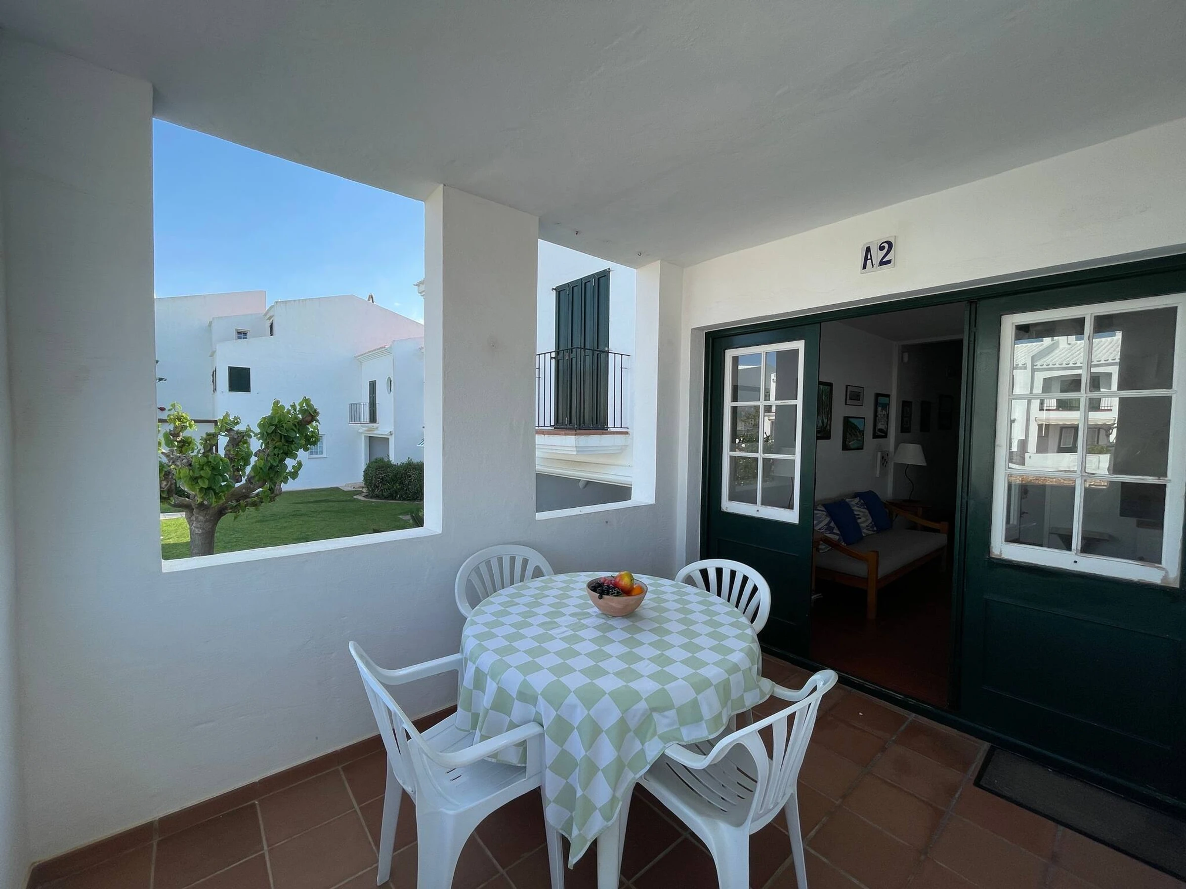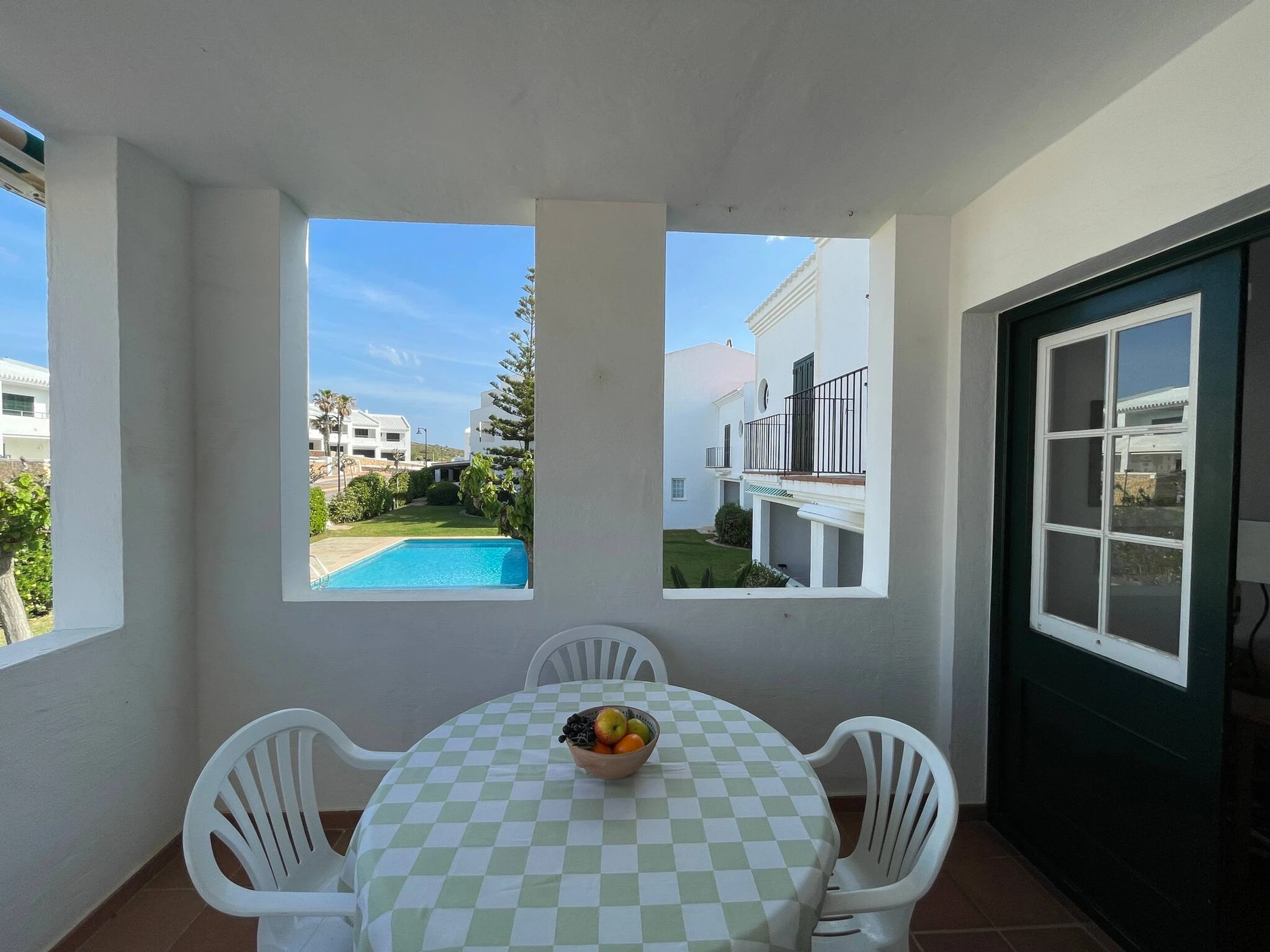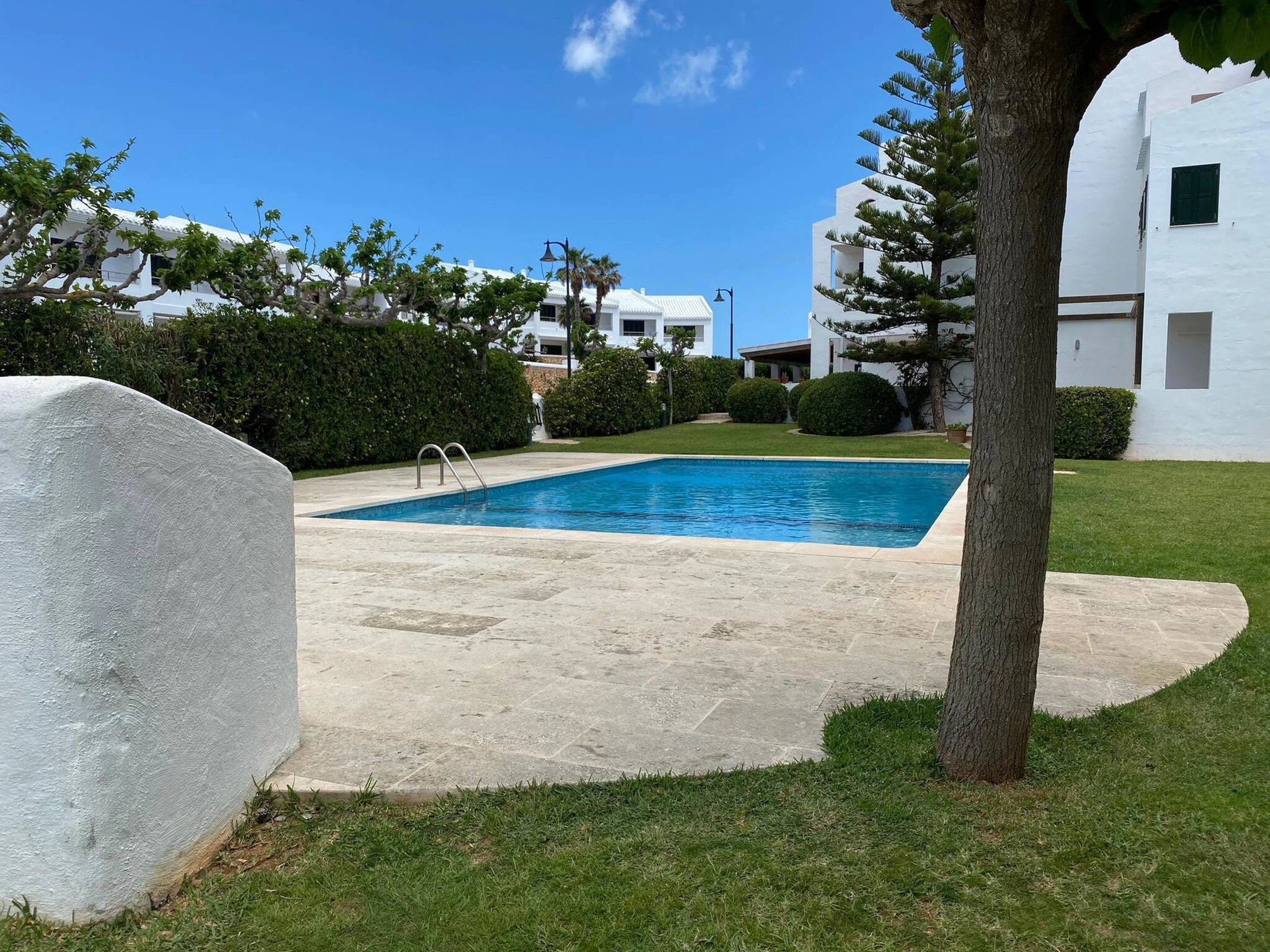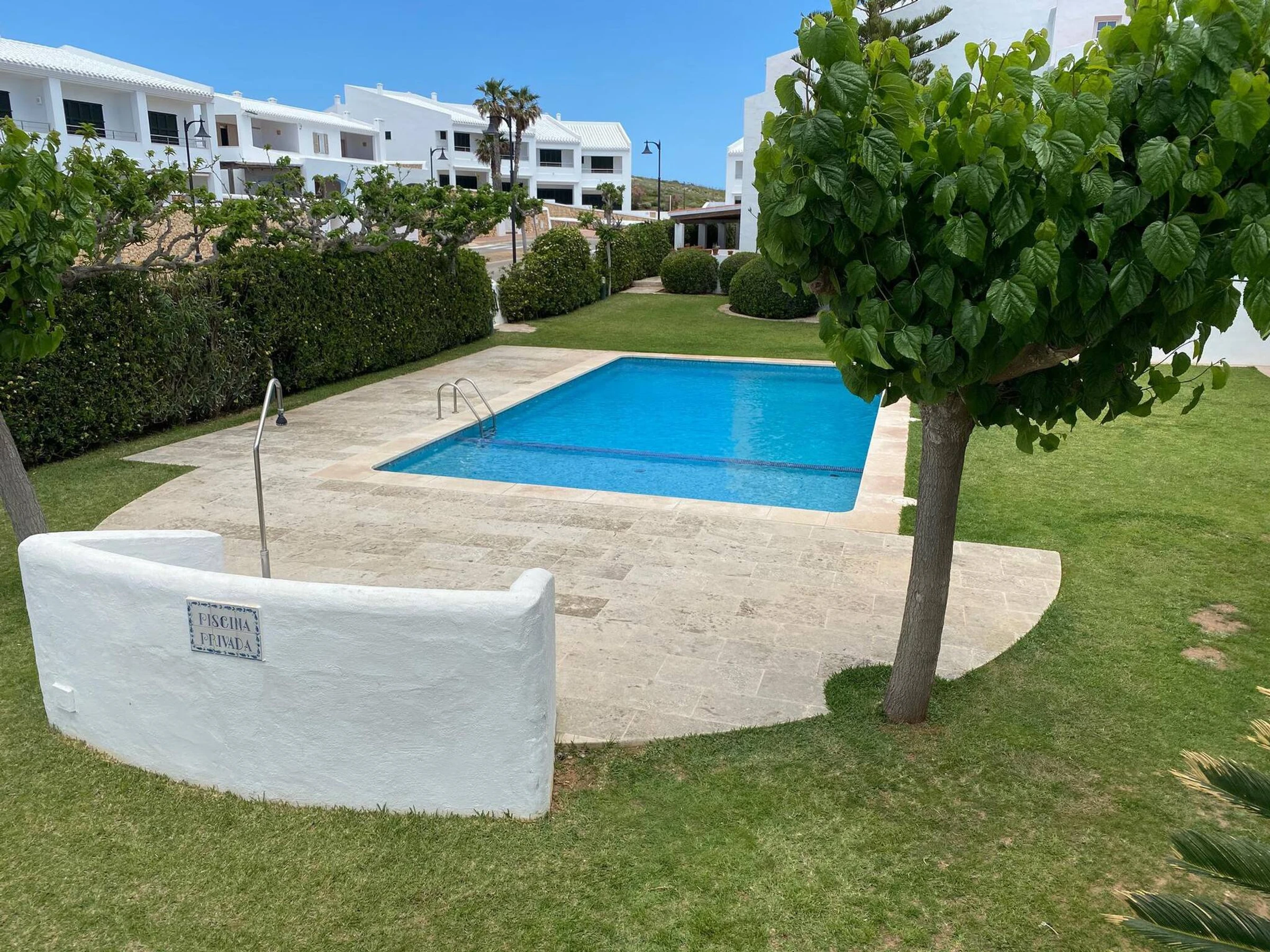 Die Wohnung verfügt über ein Schlafzimmer mit Doppelbett, ein Zimmer mit zwei Einzelbetten, ein vollständiges Badezimmer, ein geräumiges Wohn-Esszimmer, eine vollständig ausgestattete Küche mit Geschirrspüler, Mikrowelle usw. und eine Terrasse mit Tisch und Außenstühlen mit Blick auf den herrlichen Pool und Garten.