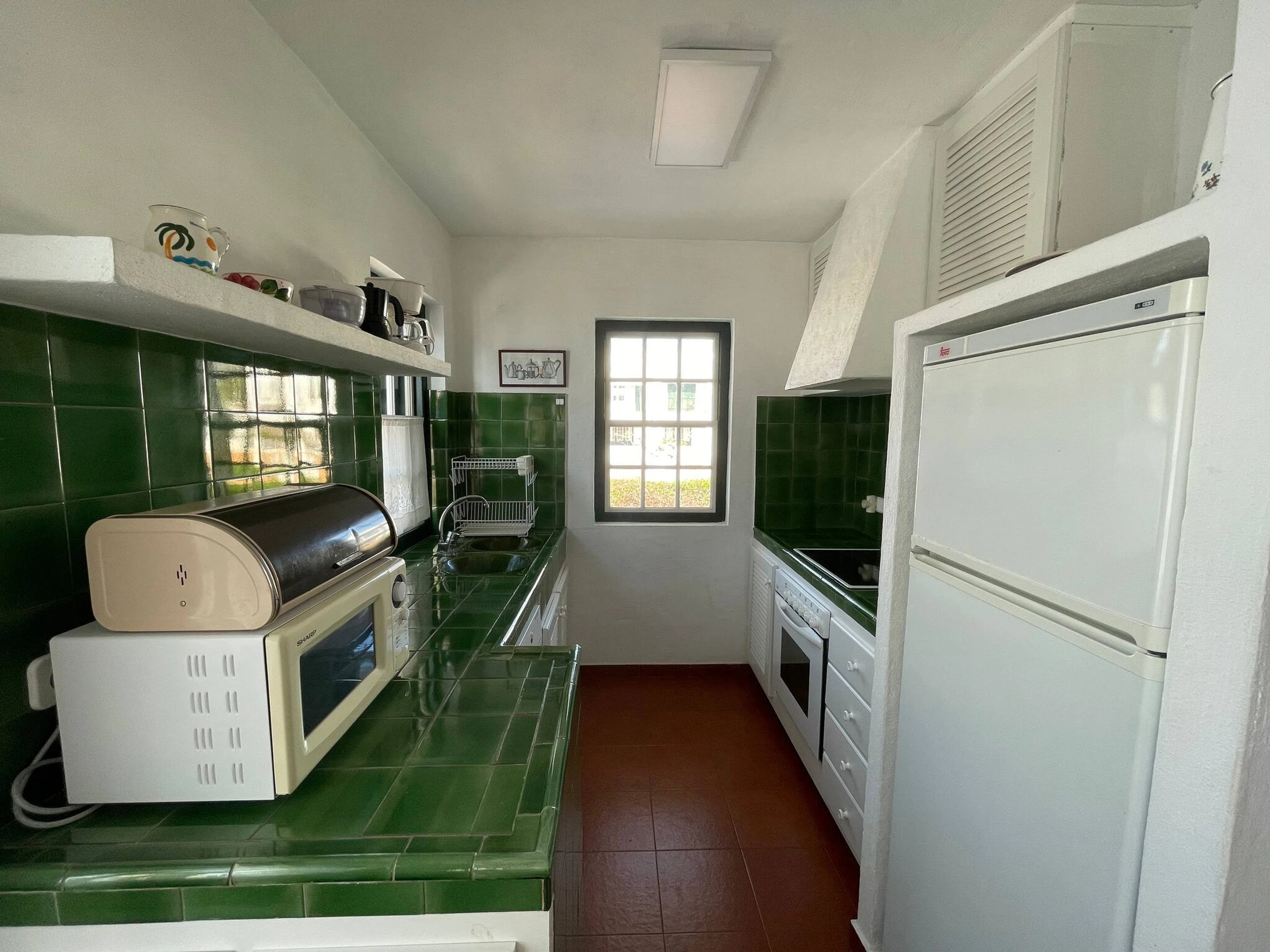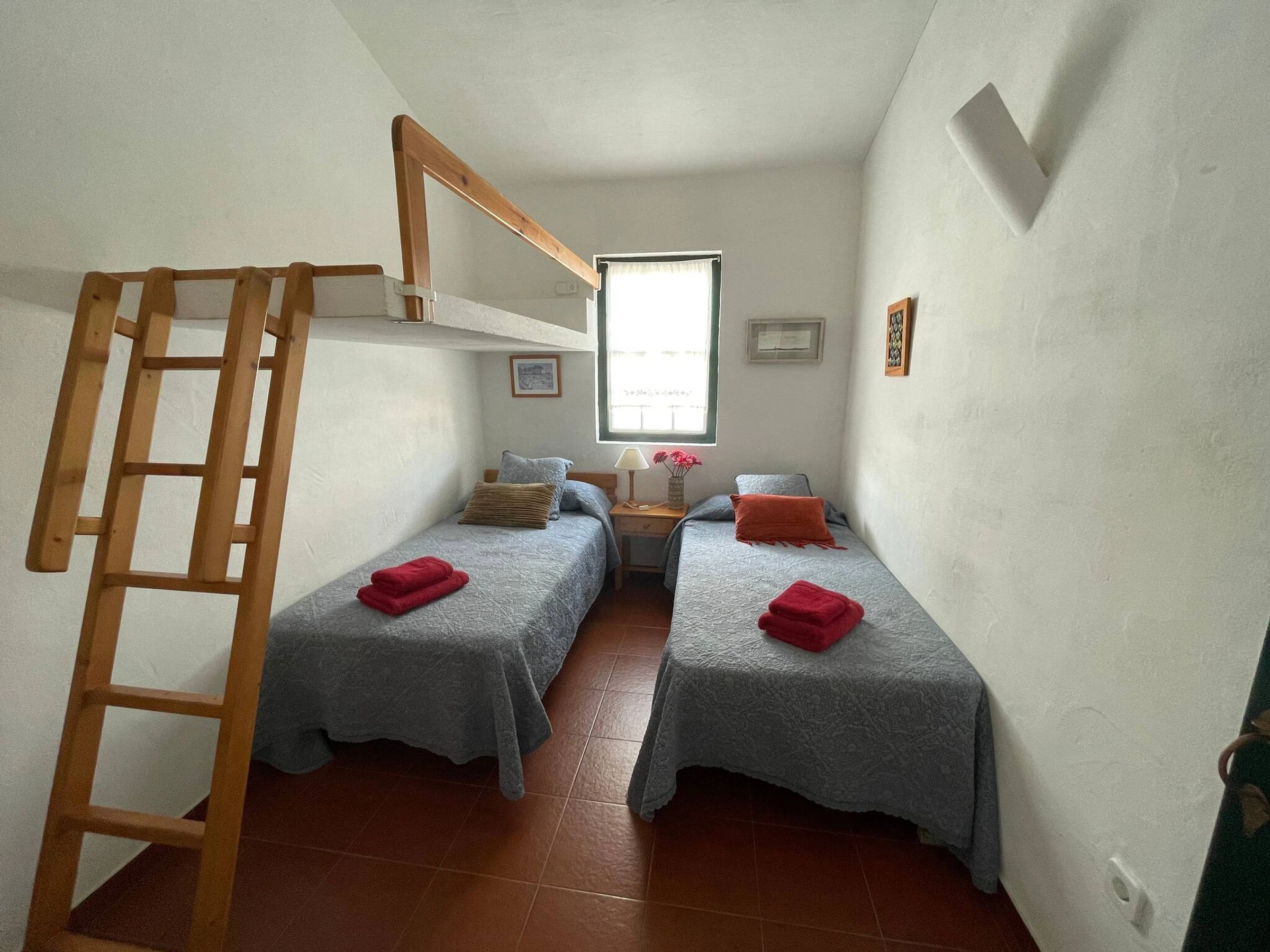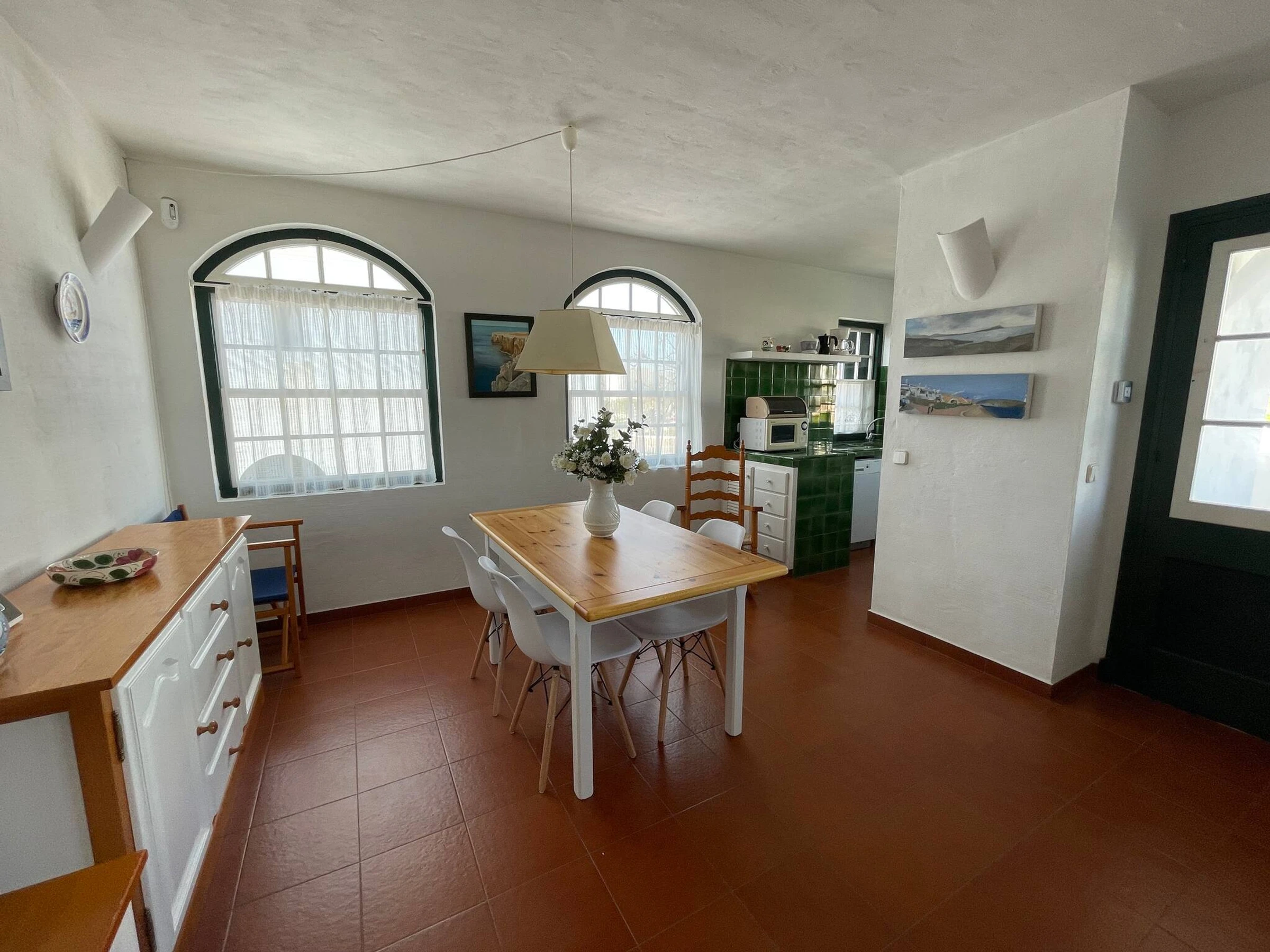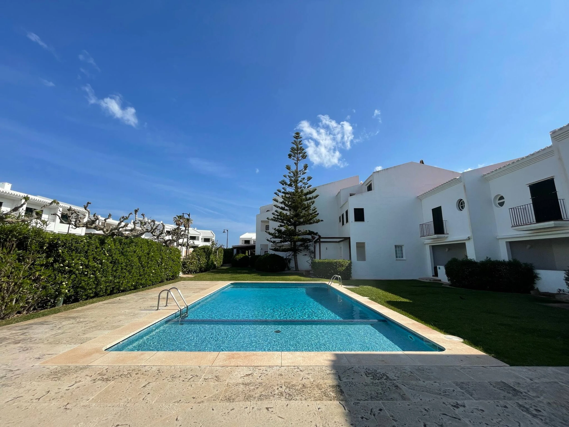 Die Wohnung verfügt über ein Schlafzimmer mit Doppelbett, ein Zimmer mit zwei Einzelbetten, ein vollständiges Badezimmer, ein geräumiges Wohn-Esszimmer, eine vollständig ausgestattete Küche mit Geschirrspüler, Mikrowelle usw. und eine Terrasse mit Tisch und Außenstühlen mit Blick auf den herrlichen Pool und Garten.
