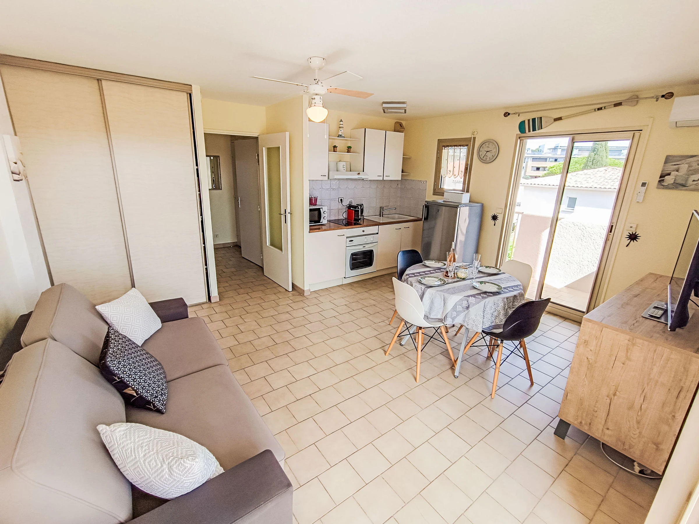 1-Zimmer-Studio 30 m2 im 2. Stock. Objekt geeignet für 2 Erwachsene + 2 Kinder. Wohn-/Esszimmer mit 1 Doppeldiwanbett (1 x 160 cm, Länge 190 cm), TV, E-Heizofen und Klimaanlage. Schlafnische mit 1 Ausziehbett (2 Pers. 2 x 90 cm, Länge 190 cm), Klimaanlage. Kochnische (2 Glaskeramikplatten, Toaster, Wasserkocher, Mikrowelle, elektrische Kaffeemaschine, Kapseln für die Kaffeemaschine (Nespresso) extra). Bad/Dusche, sep. WC. Terrasse 6 m2, Südostlage. Terrassenmöbel. Sicht auf den Hafen. Zur Verfügung: Waschmaschine. Internet (WLAN, extra). Parkplatz Nr. 37. Bitte beachten: Nichtraucher-Unterkunft. Rauchmelder. Inserat einer Privatperson nach Artikel 155, IV, CGI.