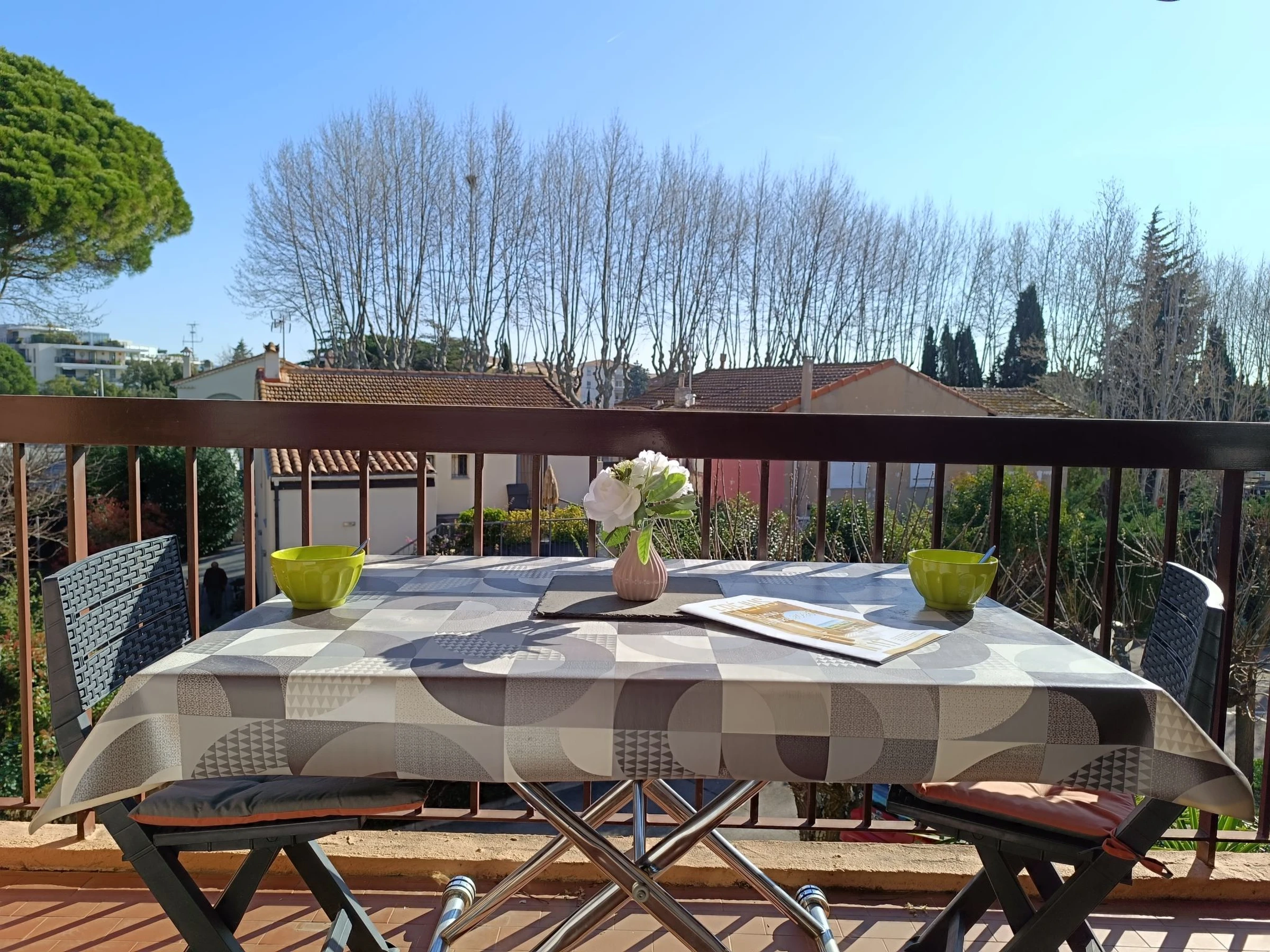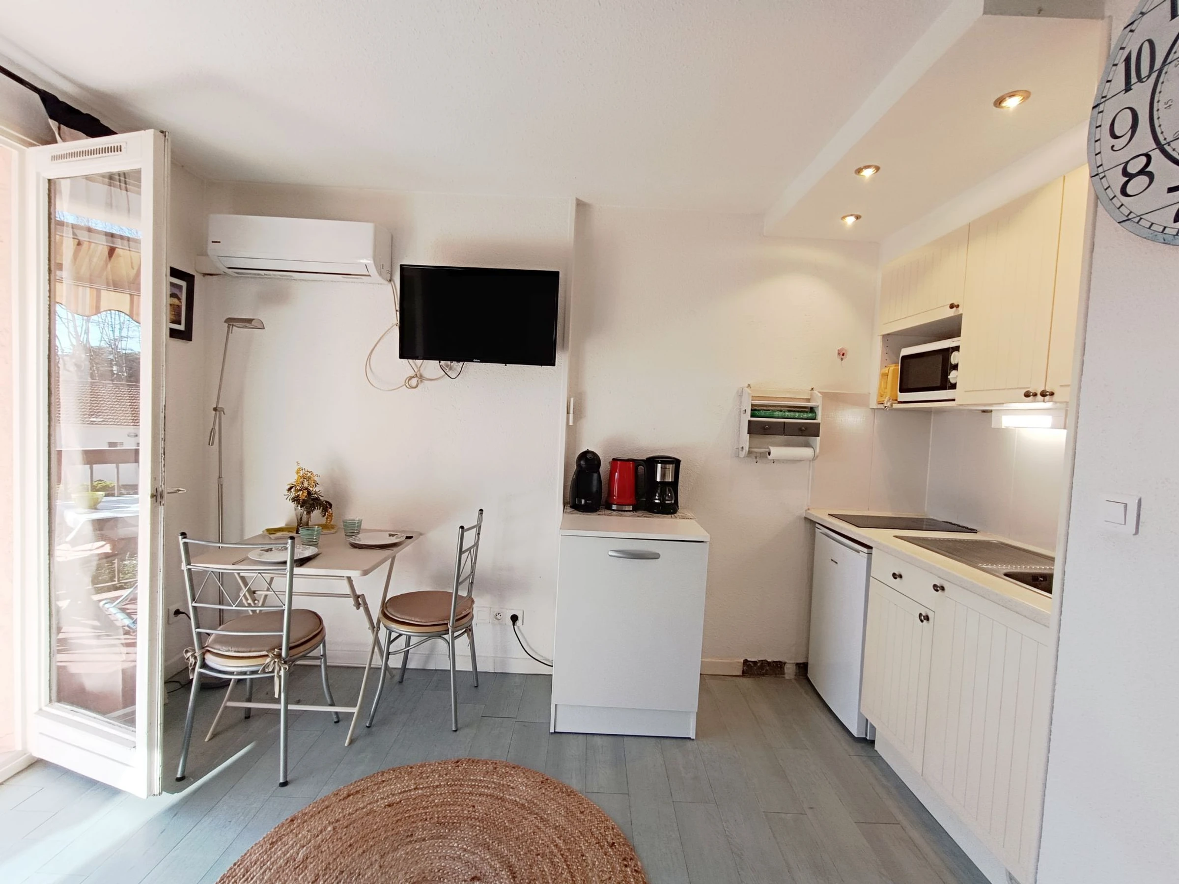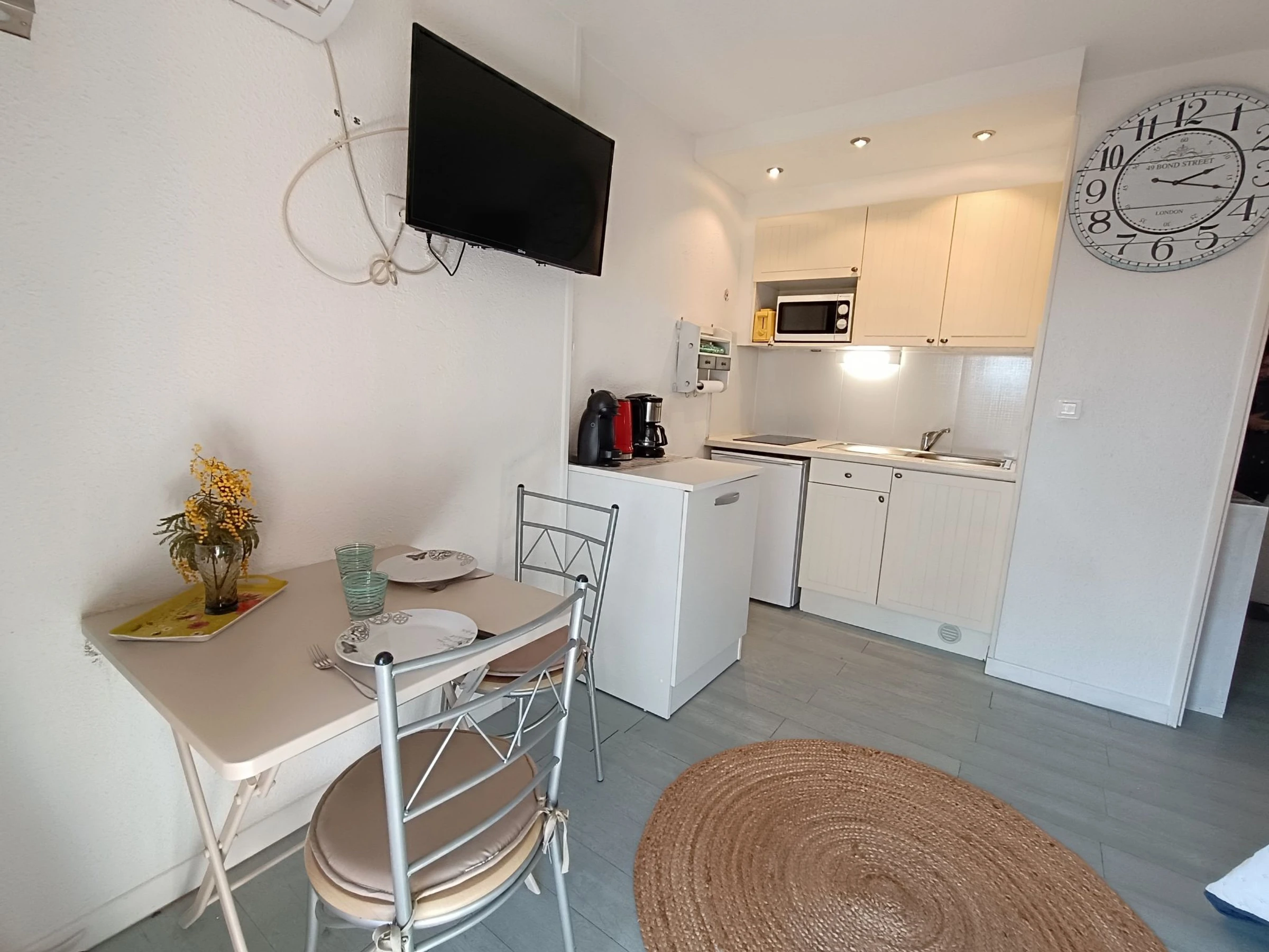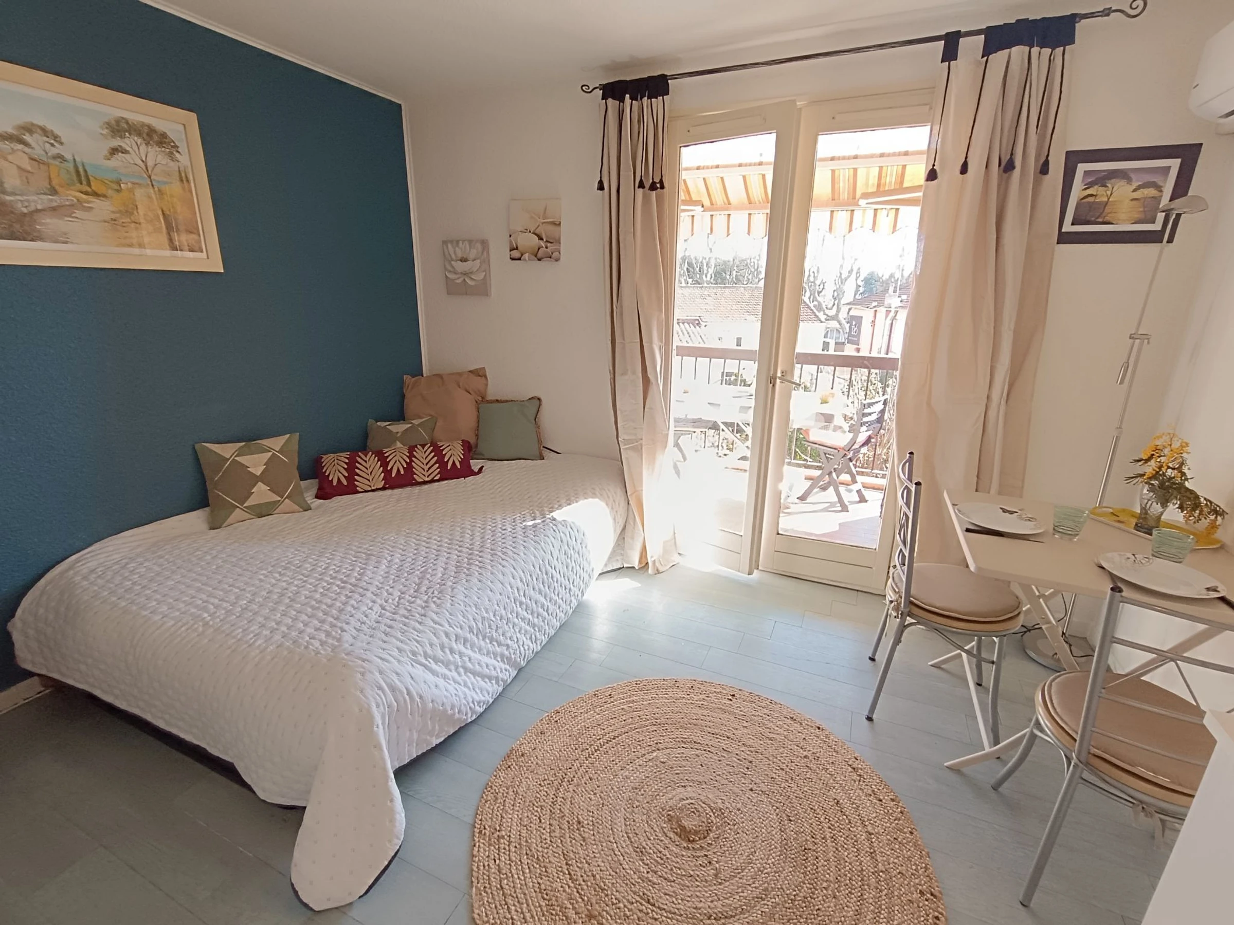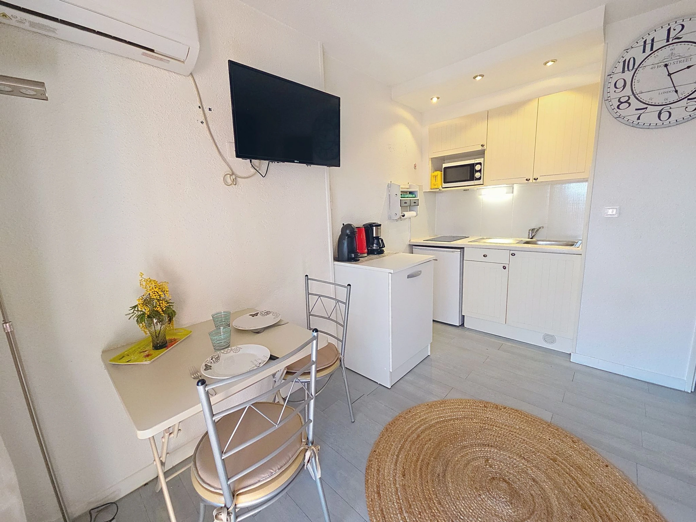 1-Zimmer-Studio 20 m2 im 2. Stock. Wohn-/Schlafzimmer mit 1 Doppeldiwanbett (1 x 140 cm, Länge 190 cm), TV und Klimaanlage. Ausgang zur Terrasse. Kochnische (2 Induktionskochplatten, Toaster, Wasserkocher, Mikrowelle, elektrische Kaffeemaschine, Kapseln für die Kaffeemaschine (Dolce Gusto) extra) mit Esstisch. Dusche/WC. E-Heizung. Terrasse 6 m2, Ostlage. Terrassenmöbel. Zur Verfügung: Bügeleisen, Haartrockner. Internet (WLAN, extra). Parkplatz Nr. 30. Bitte beachten: Maximal 1 kleines Haustier/Hund erlaubt. TV nur FR. Rauchmelder. Inserat einer Privatperson nach Artikel 155, IV, CGI. [hidden]