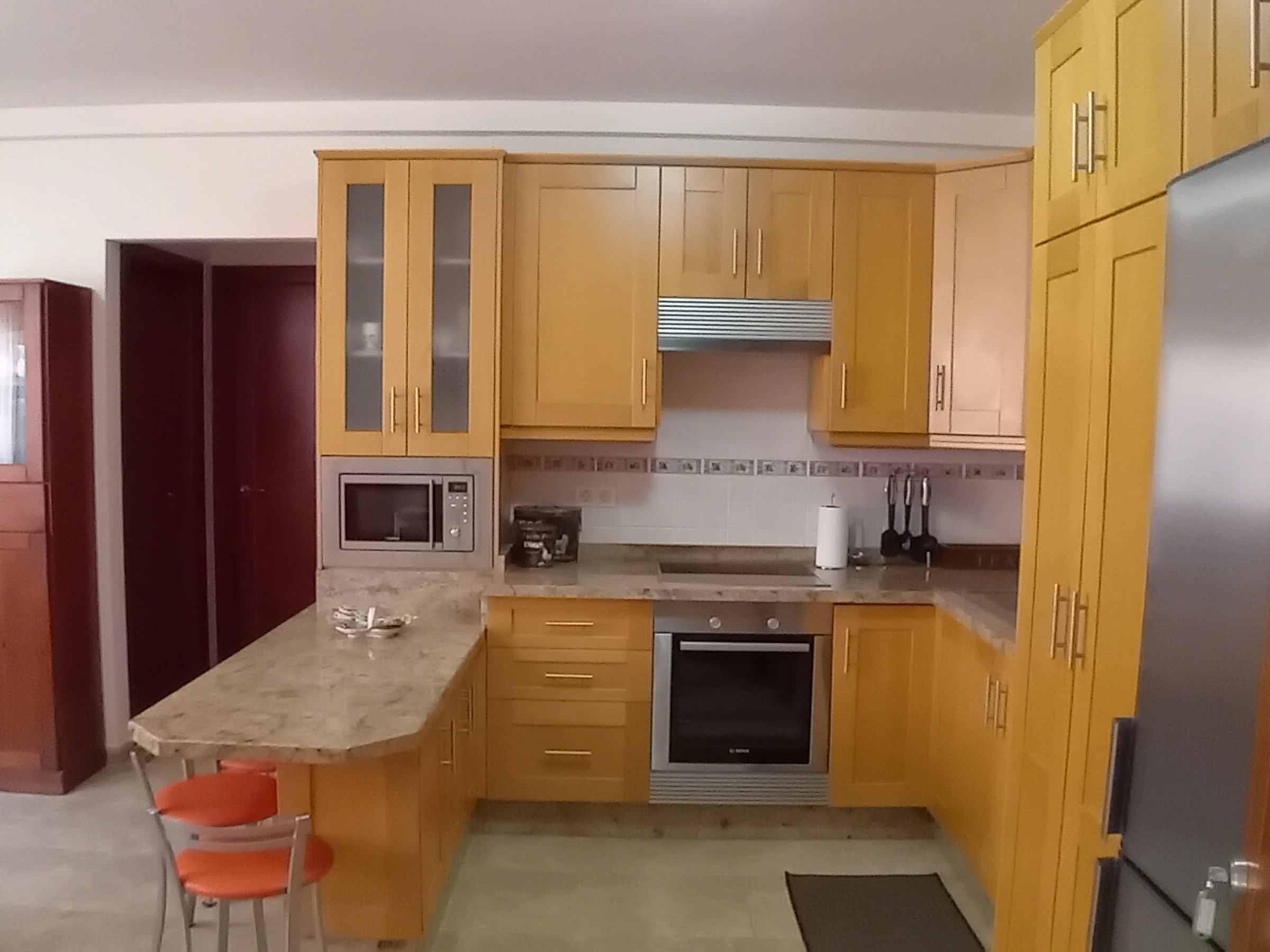 Dieses küche, ist ausgestattet in mikrowelle, backofen, kochutensilien und kaffeemaschine.