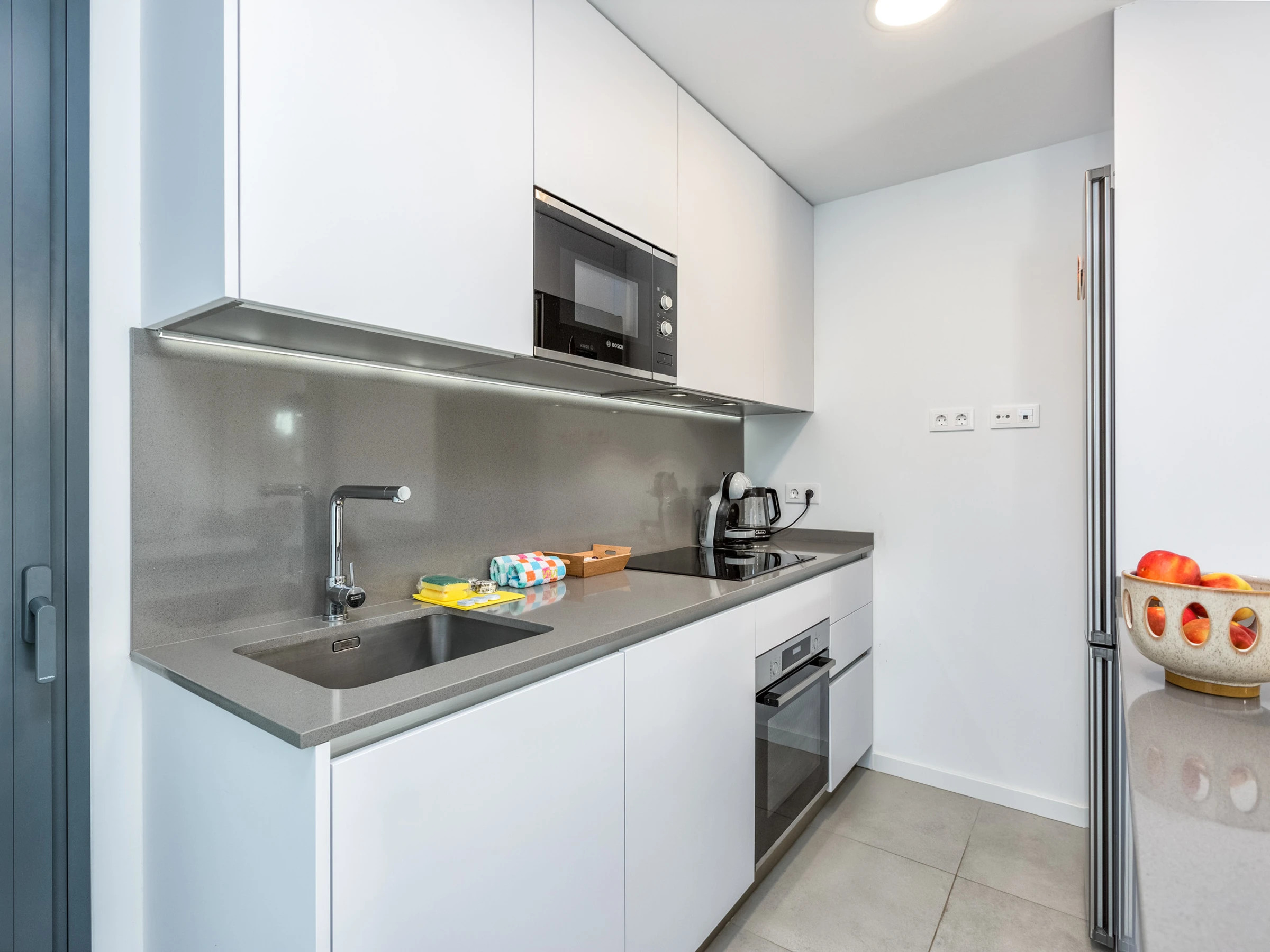 Dieses offene küche, elektrisches kochfeld, ist ausgestattet in kühlschrank, mikrowelle, backofen, gefrierschrank, spülmaschine, geschirr/besteck, kochutensilien, kaffeemaschine, toaster und wasserkocher.