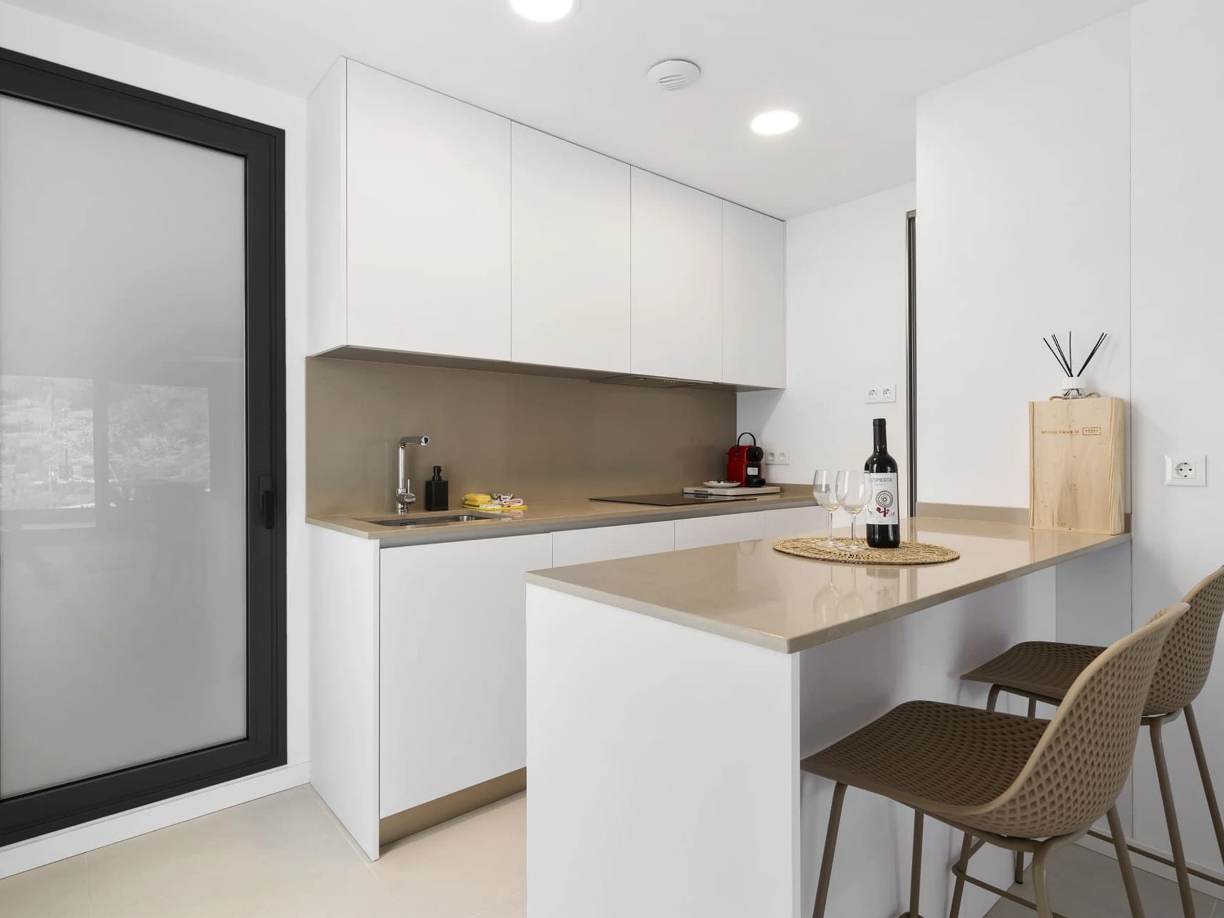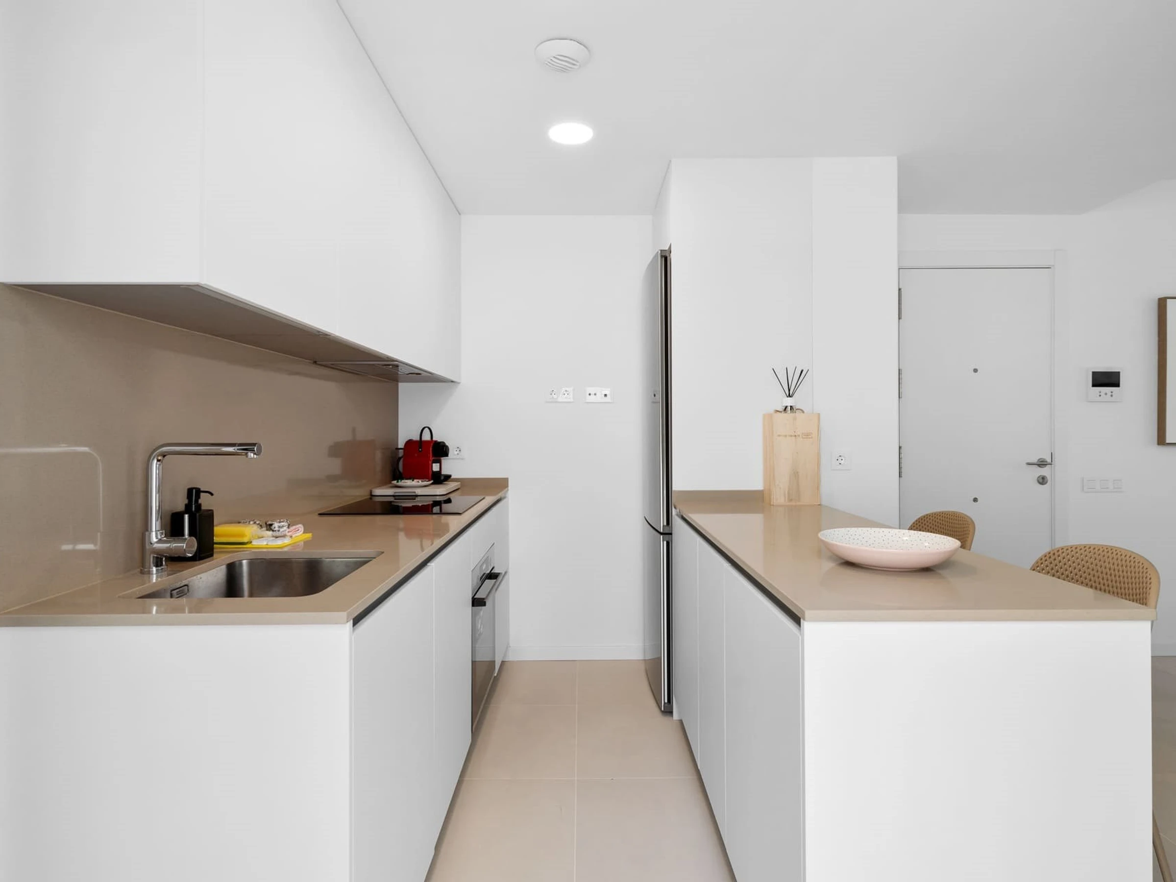 Dieses offene küche, mit induktions-kochfeld, ist ausgestattet in kühlschrank, mikrowelle, backofen, gefrierschrank, spülmaschine, geschirr/besteck, kochutensilien, kaffeemaschine, toaster, wasserkocher und küchengeschirr.