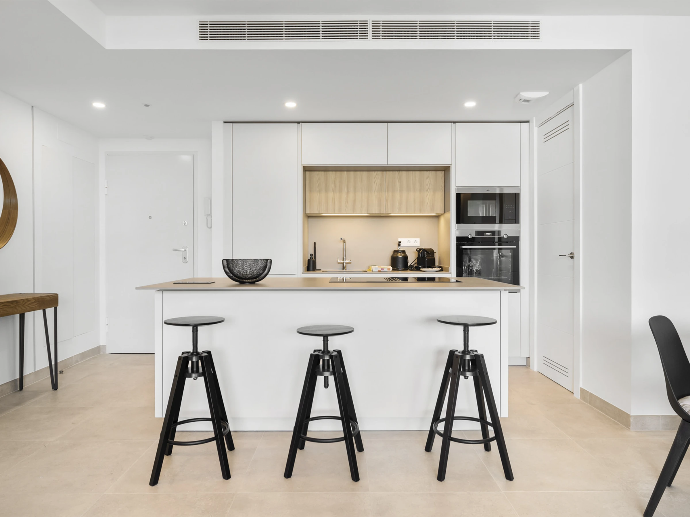 Dieses offene küche, mit induktions-kochfeld, ist ausgestattet in kühlschrank, mikrowelle, backofen, gefrierschrank, spülmaschine, geschirr/besteck, kochutensilien, kaffeemaschine, toaster, wasserkocher, saftpresse und küchengeschirr.