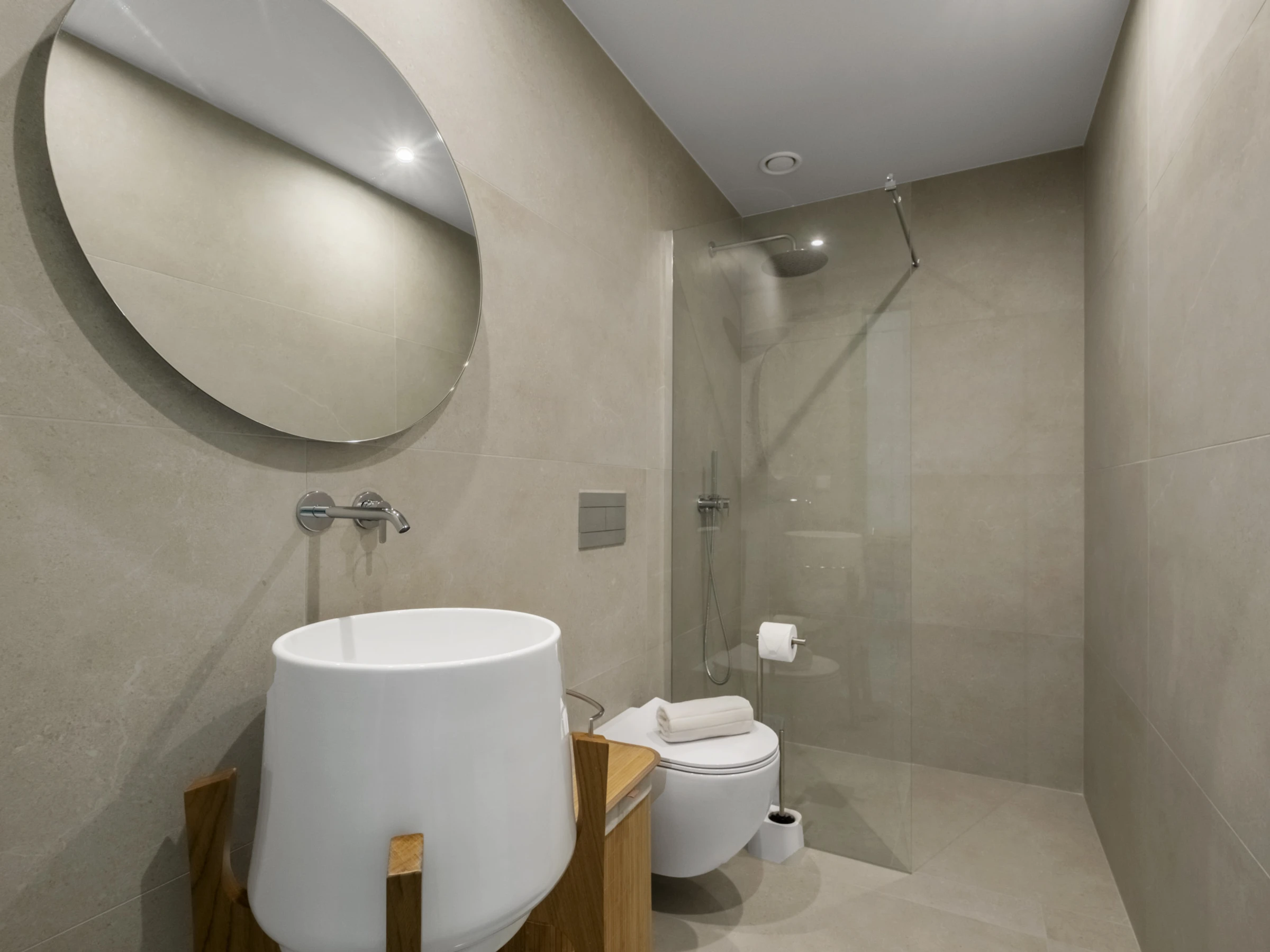 Das moderne und funktionale Badezimmer bietet eine geräumige Dusche, die auf Komfort und Praktikabilität ausgelegt ist.