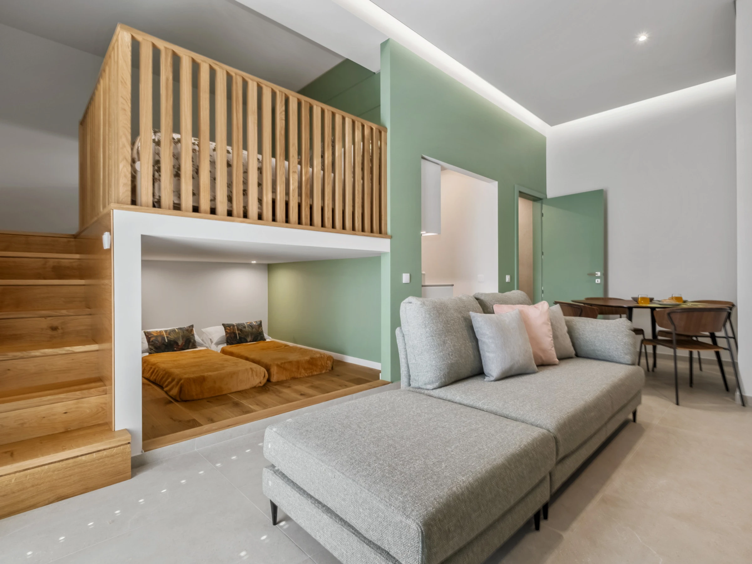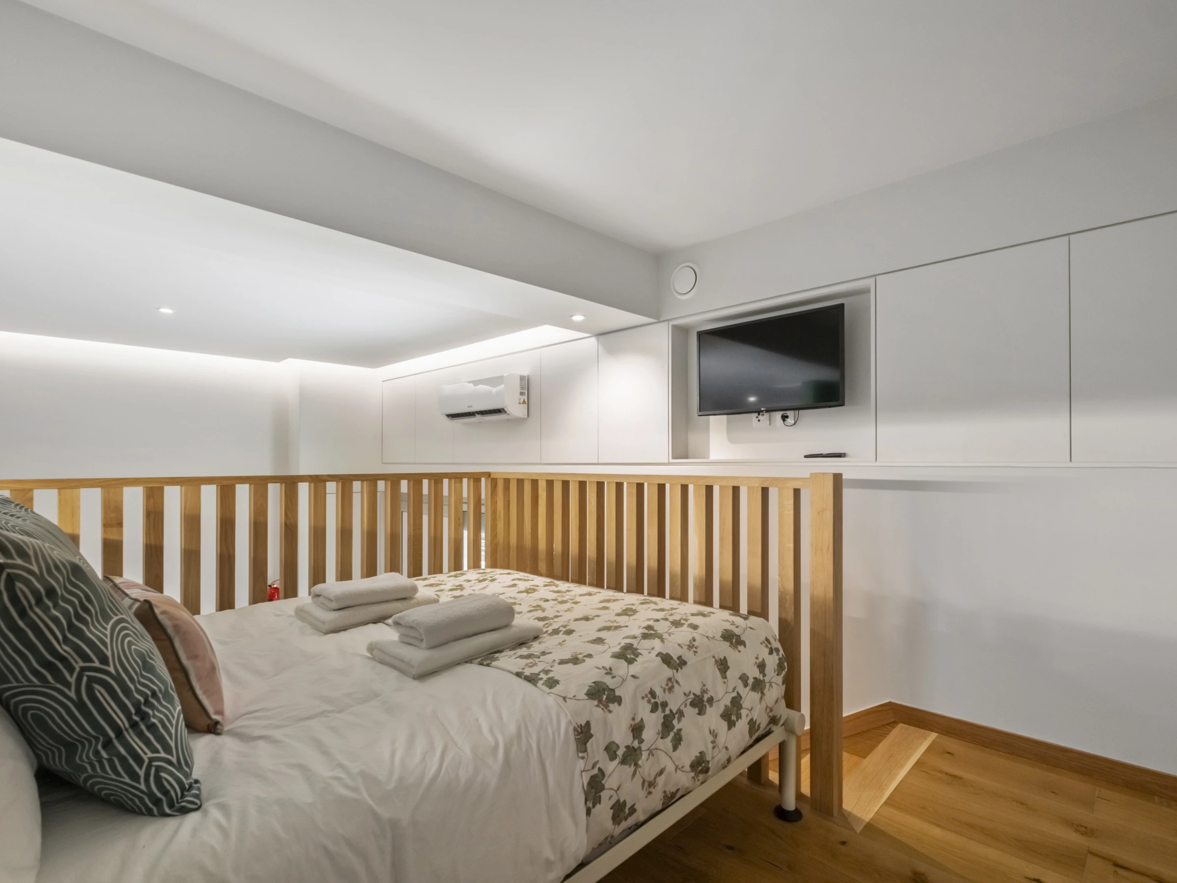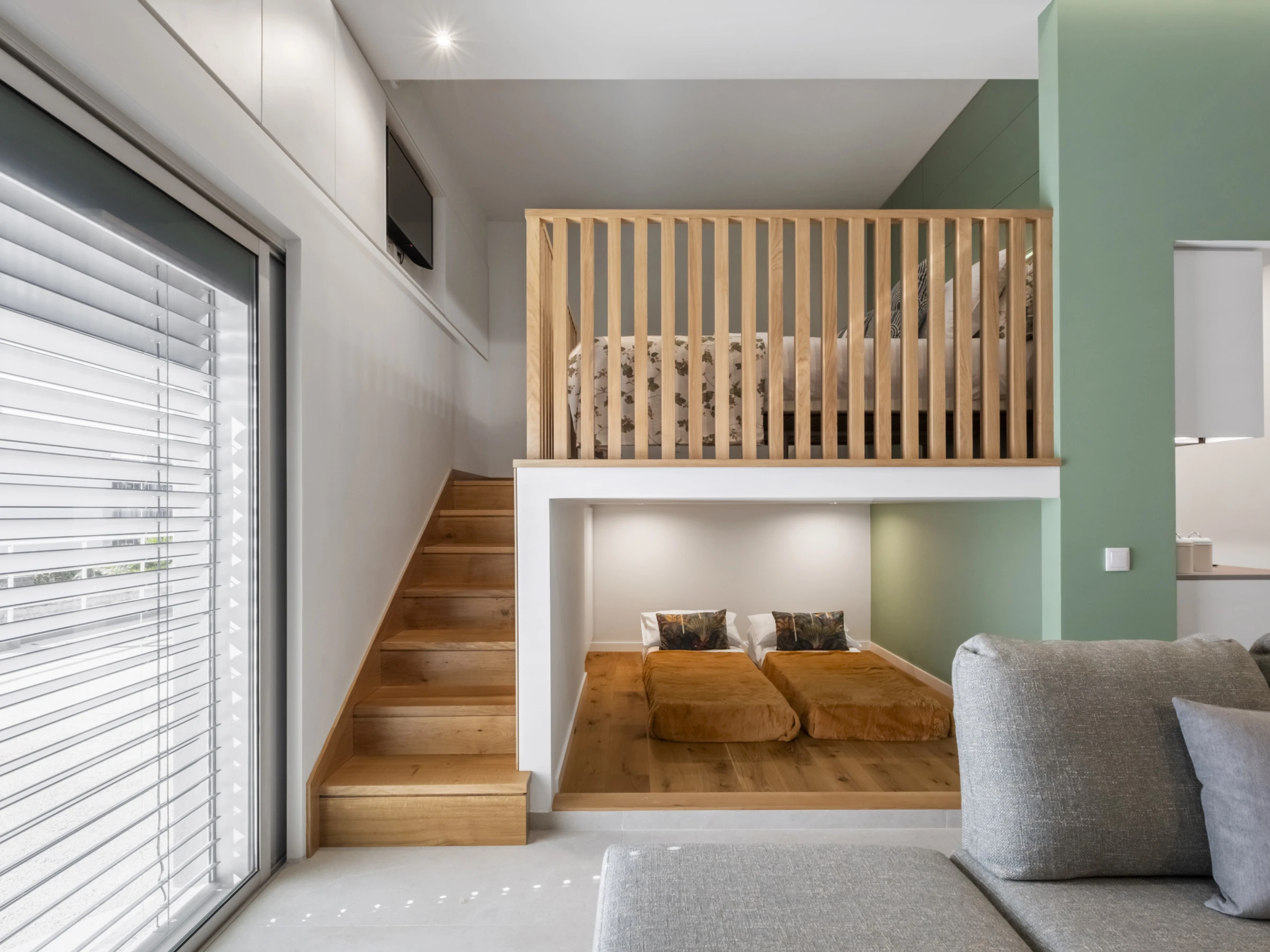 Im Schlafbereich wurde die Umgebung so gestaltet, dass absolute Ruhe gewährleistet ist, mit sanfter Beleuchtung und Fernsehen, ideal für Paare. Das Studio verfügt zudem über zwei zusätzliche Betten, die perfekt für kleine Kinder sind, ohne den Komfort zu beeinträchtigen.