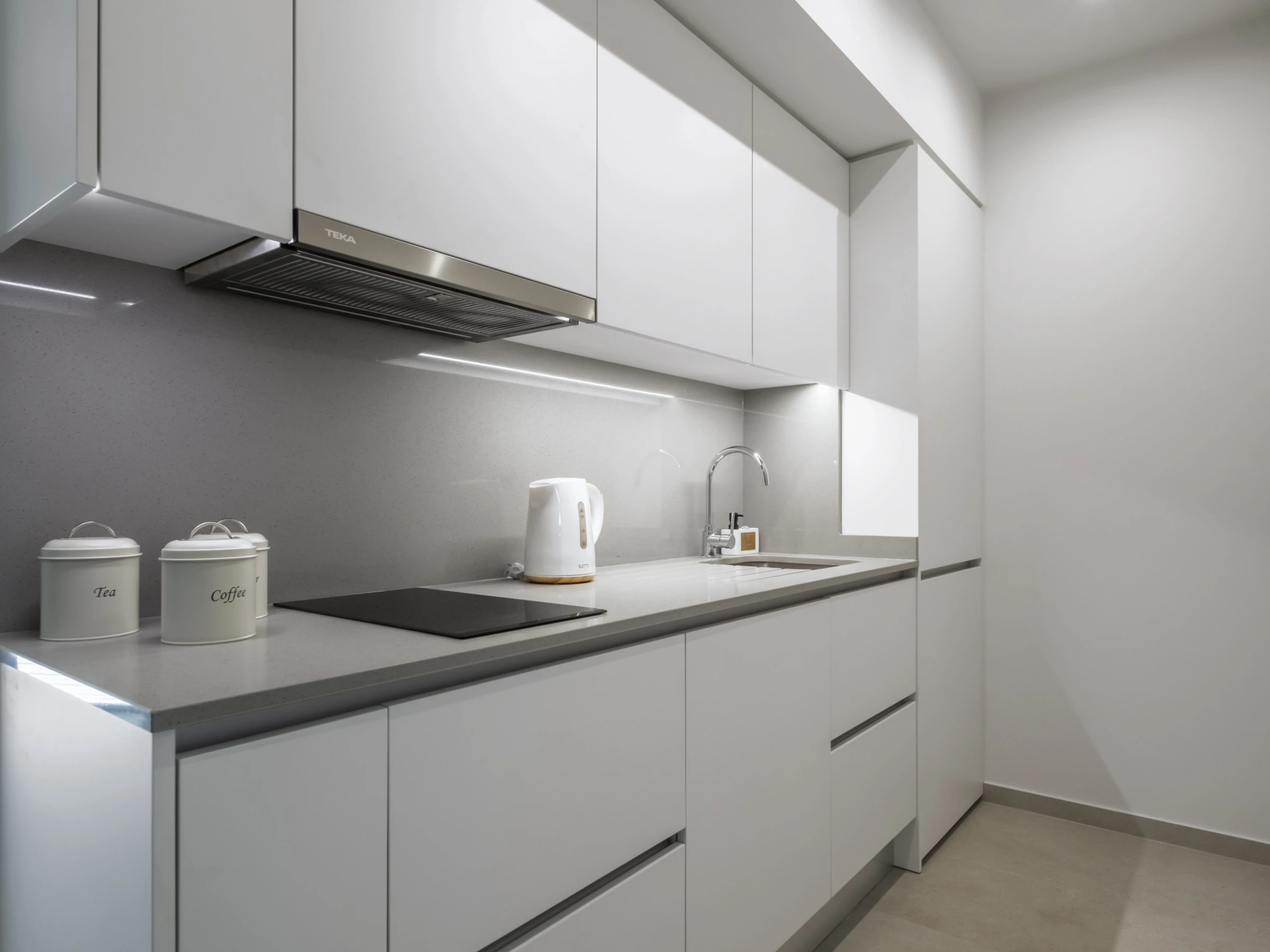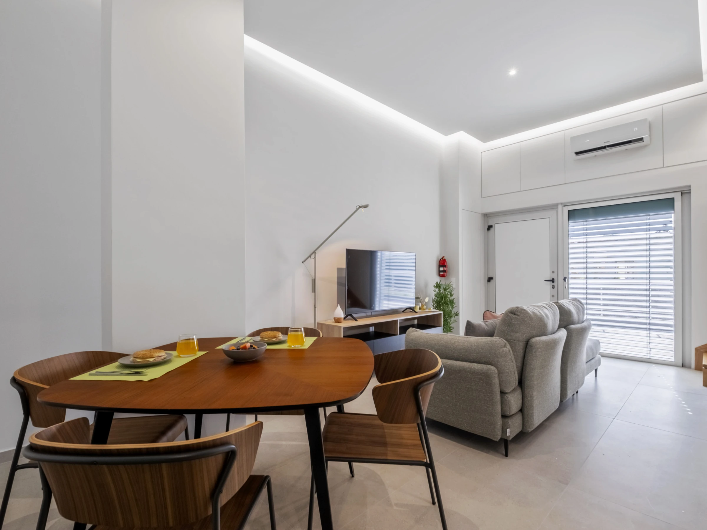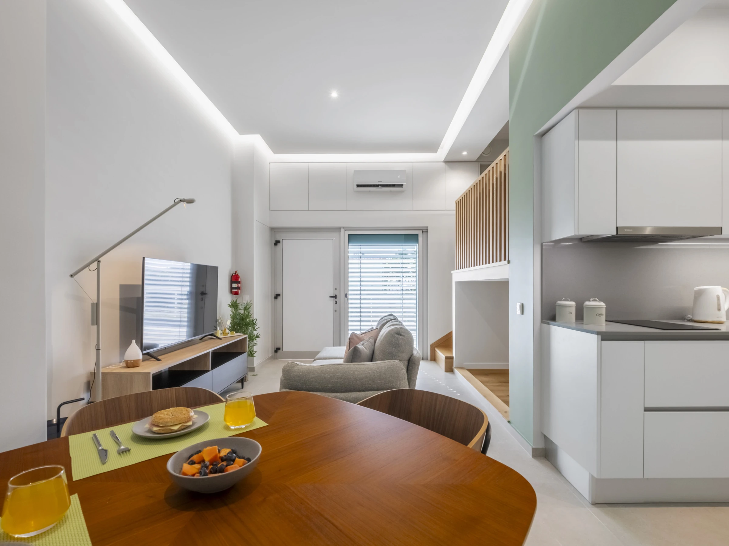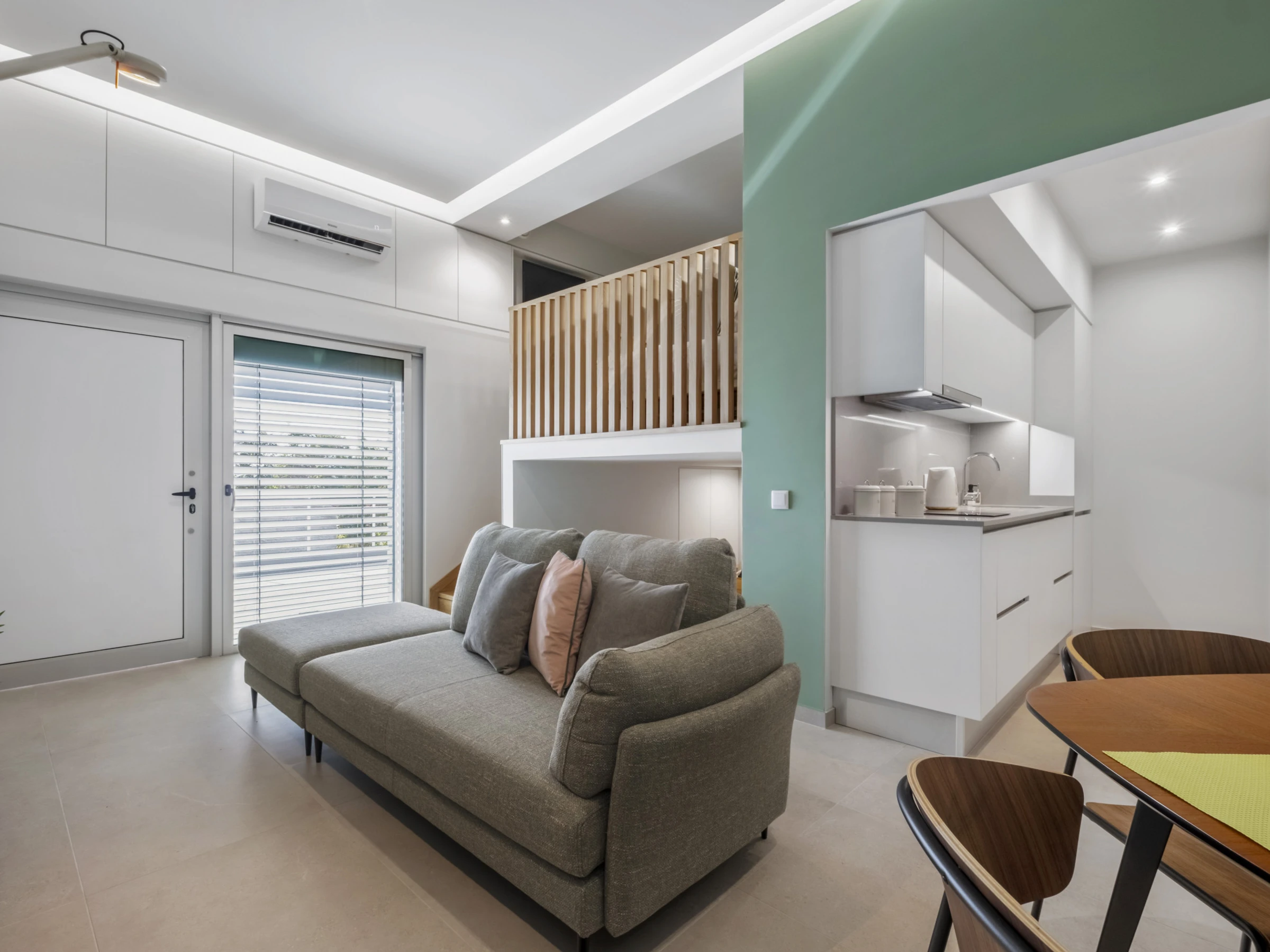 Der Wohnbereich ist geräumig und einladend, mit einem bequemen Sofa, das dazu einlädt, nach einem Tag der Erkundung der Insel zu entspannen. In diesen Raum integriert, verfügt die voll ausgestattete Küche über alles, was man benötigt - von Grundutensilien bis hin zu Elektrogeräten wie Mikrowelle, Herd und Kühlschrank -, was es ermöglicht, von schnellen Frühstücken bis hin zu gemütlichen Abendessen zuzubereiten, mit dem Gefühl, zu Hause zu sein.