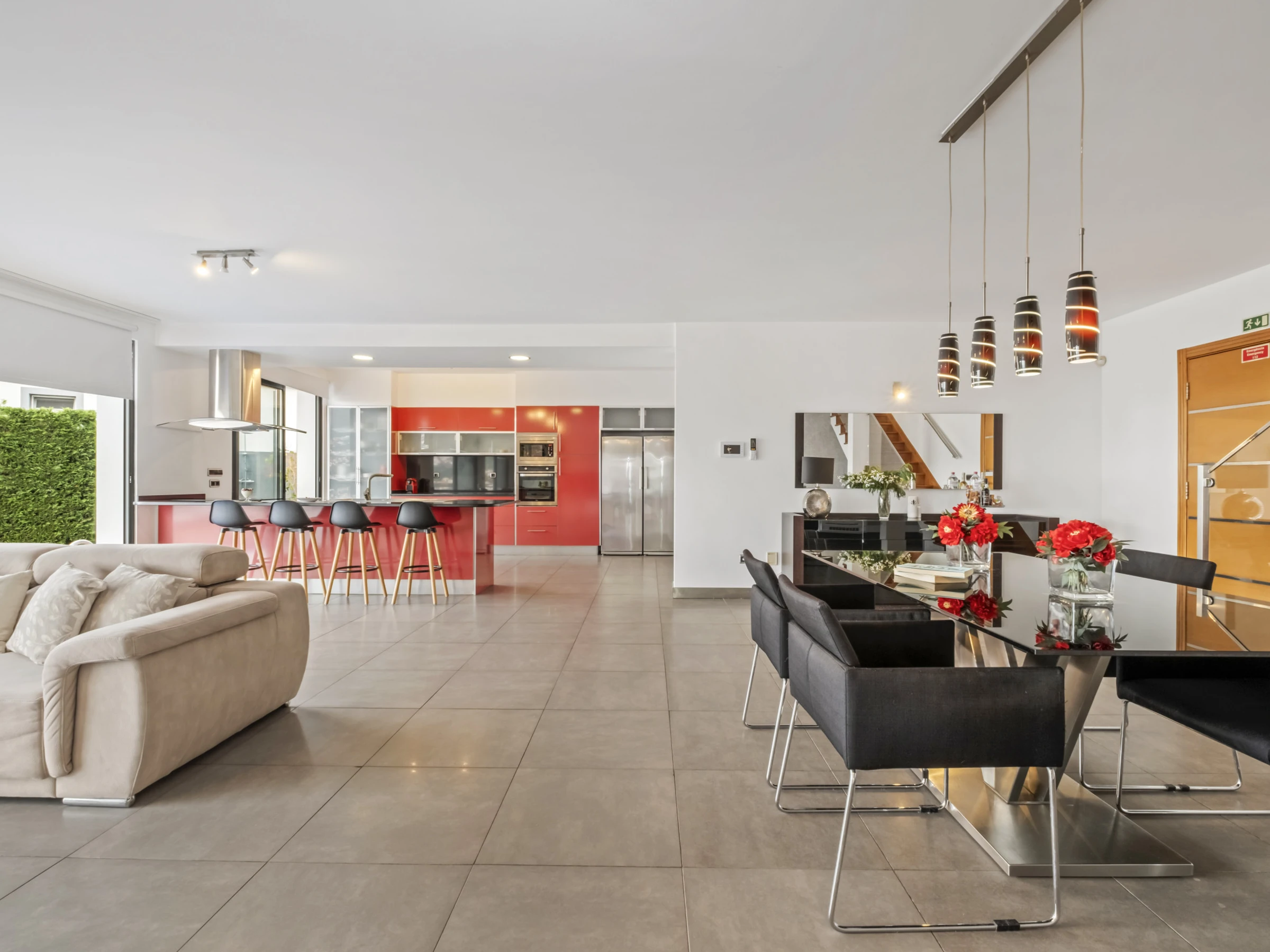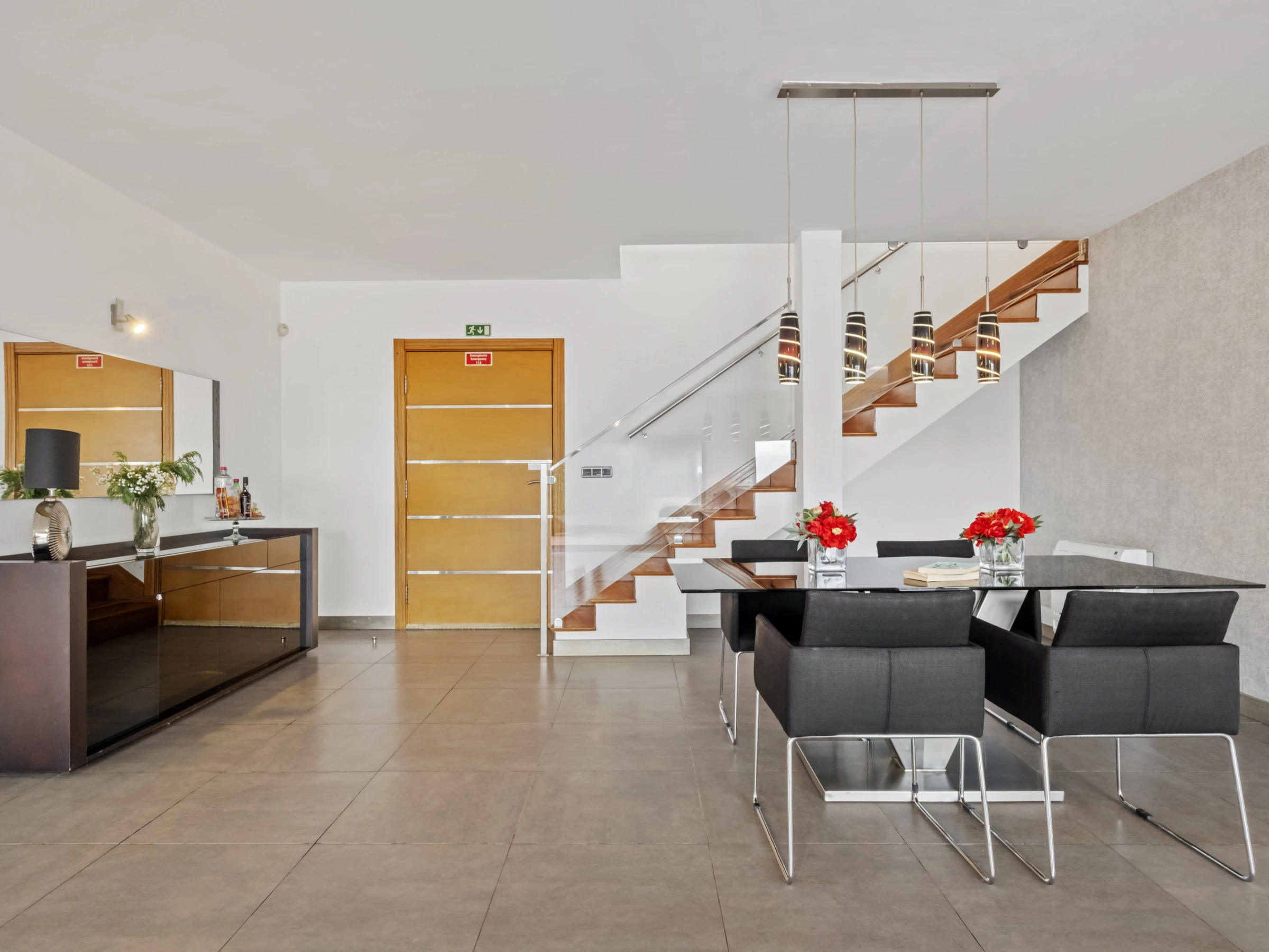 Im Erdgeschoss erwachen Momente mit Familie oder Freunden in einem offenen Sozialbereich zum Leben, der eine voll ausgestattete Küche mit einer eleganten zentralen Insel, einen geräumigen Essbereich und einen komfortablen und einladenden Wohnbereich kombiniert. Dieser Stock verfügt auch über ein Gemeinschaftsbadezimmer und Räume, die dem Wohlbefinden und der Freizeit gewidmet sind: ein Raum mit Fitnessgeräten und einem Billardtisch und sogar ein Büro mit einem Schlafsofa, ideal für diejenigen, die im Homeoffice arbeiten oder einen zusätzlichen Raum benötigen.