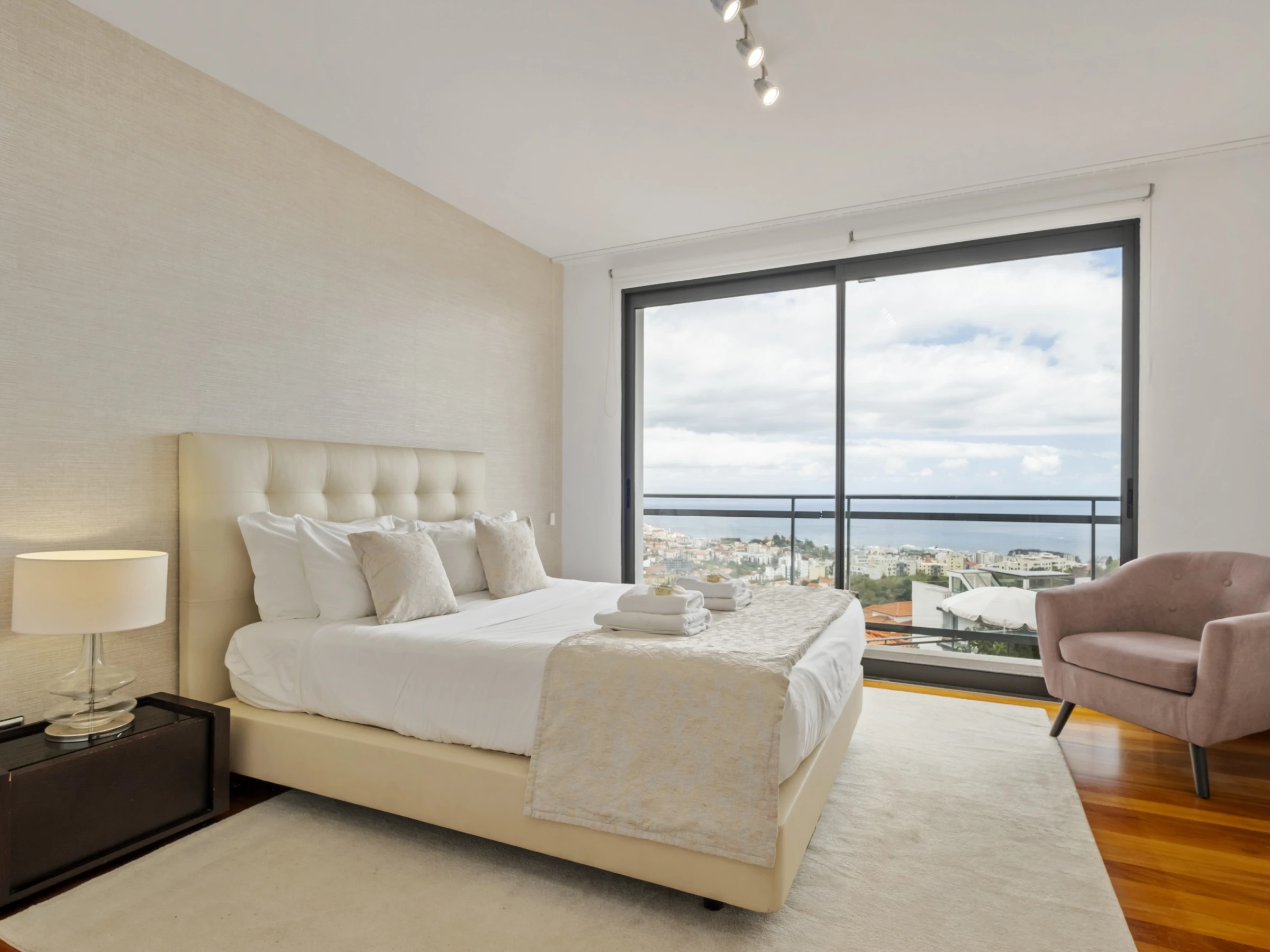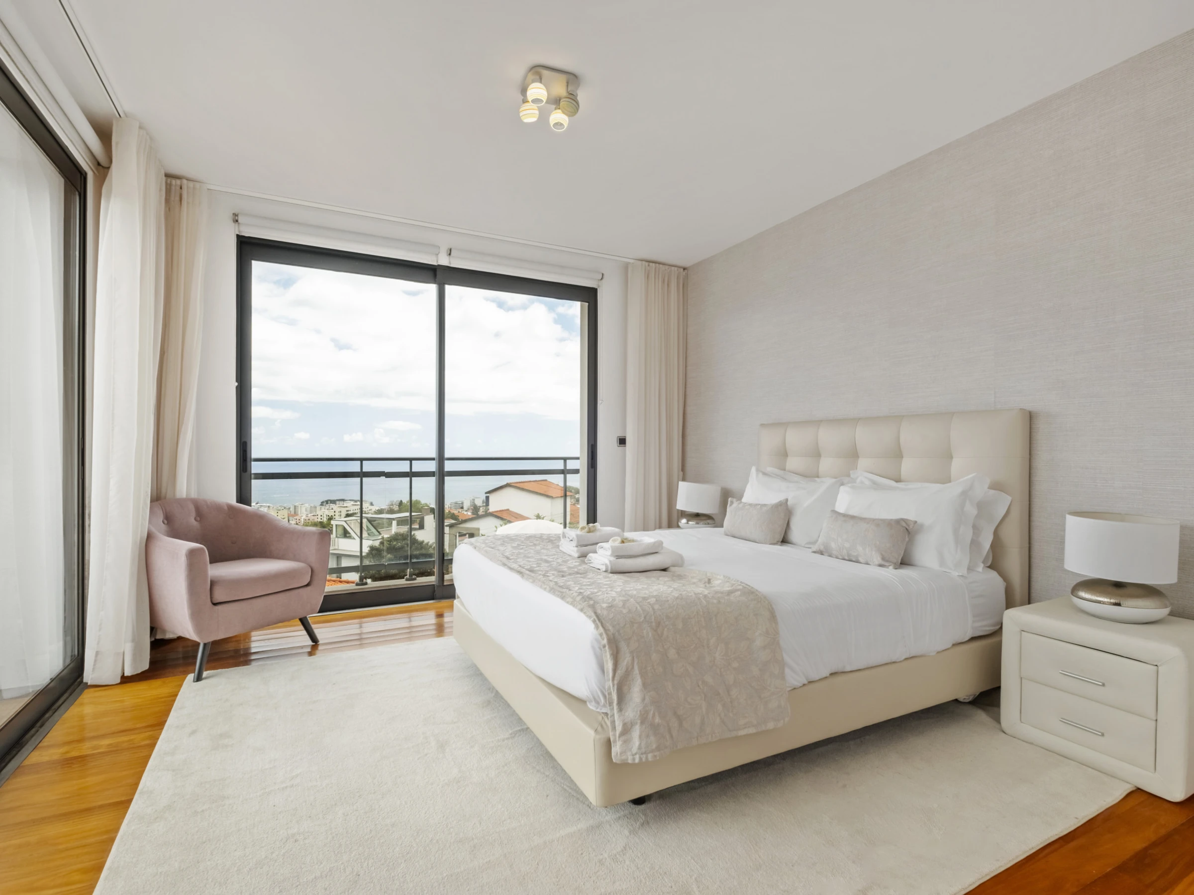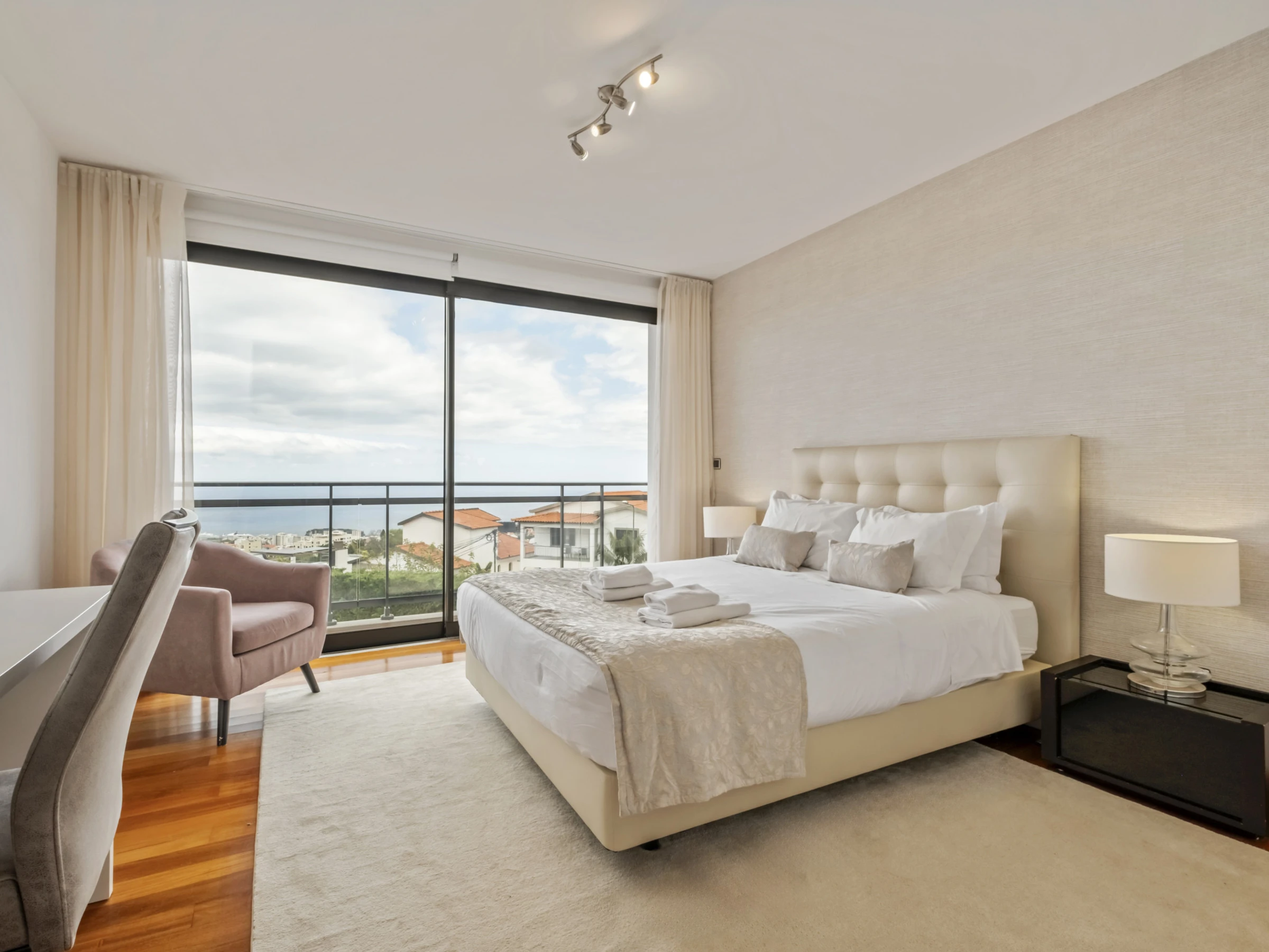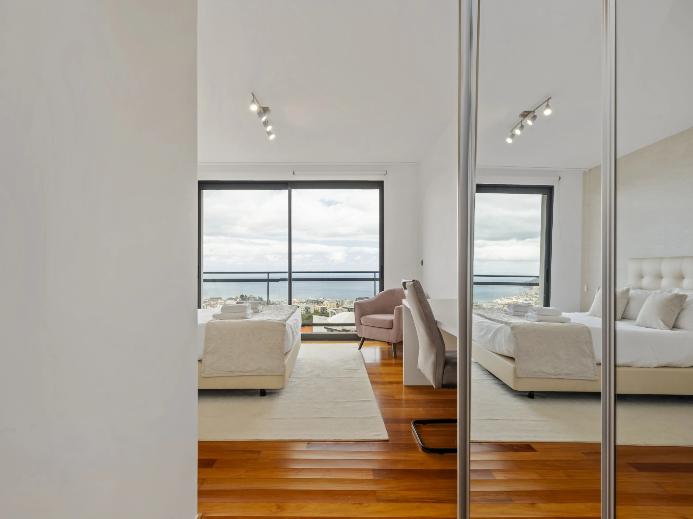 Im Obergeschoss finden Sie vier wunderschöne Suiten, alle mit eigenem Badezimmer, Balkon und Panoramablick über die Stadt und den Ozean. Jedes Zimmer wurde sorgfältig gestaltet, um maximalen Komfort und Ruhe zu bieten, und lädt zur Entspannung in einer absolut inspirierenden Umgebung ein.