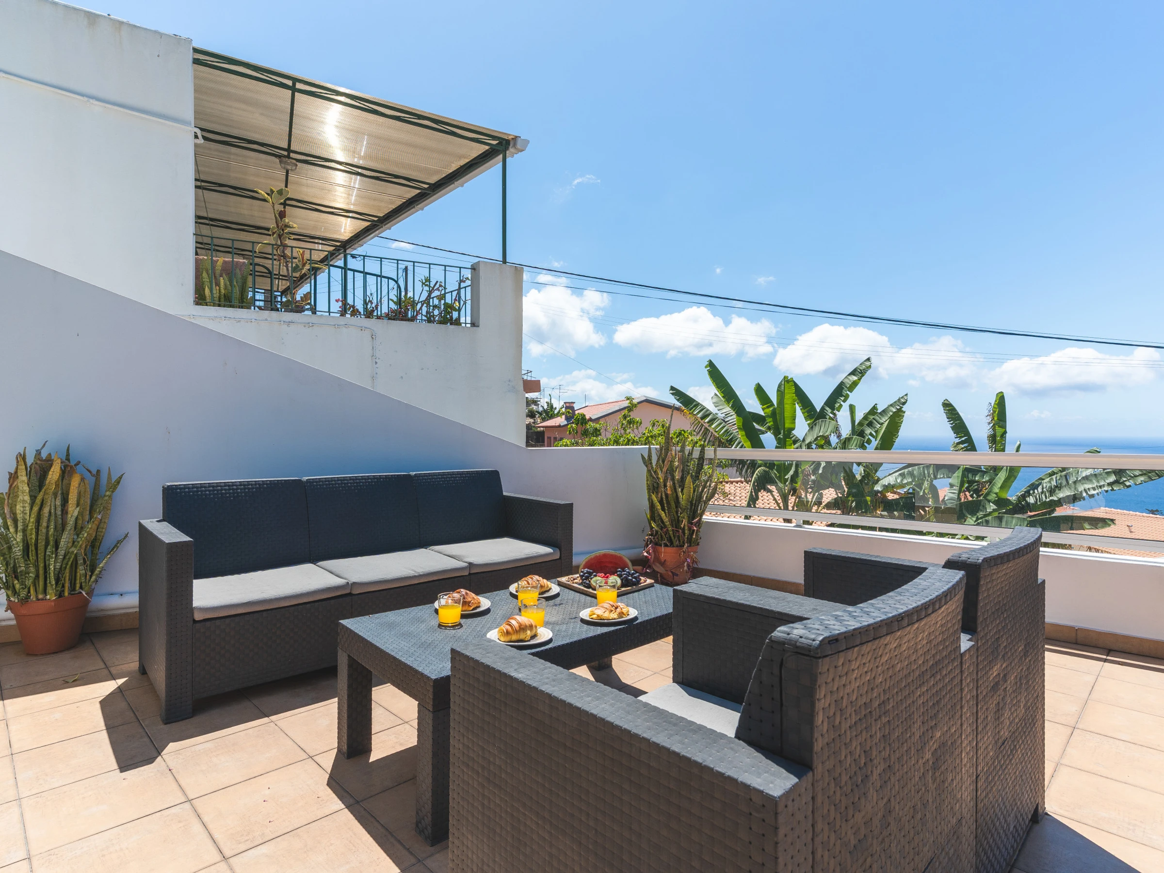 Draußen lädt ein privater Jacuzzi auf der Terrasse zum Entspannen ein, während Sie den Panoramablick auf Funchal genießen, und der Grill eignet sich perfekt für Mahlzeiten im Freien bei Madeiras angenehmem Klima. Das Haus verfügt außerdem über einen Waschbereich mit Waschmaschine und Trockner. Bettwäsche, Handtücher, Föhn, Babybett und Hochstuhl werden bereitgestellt.