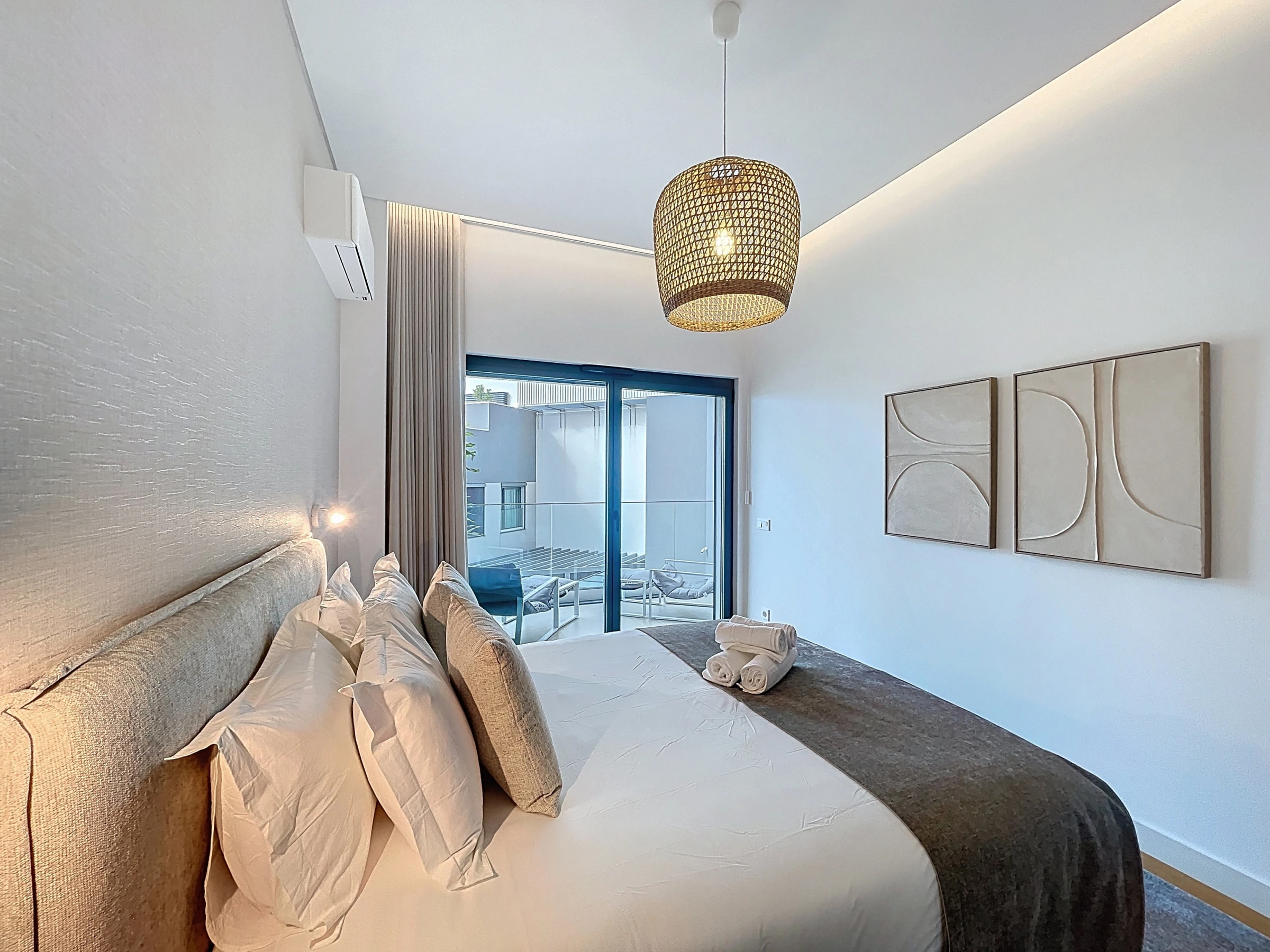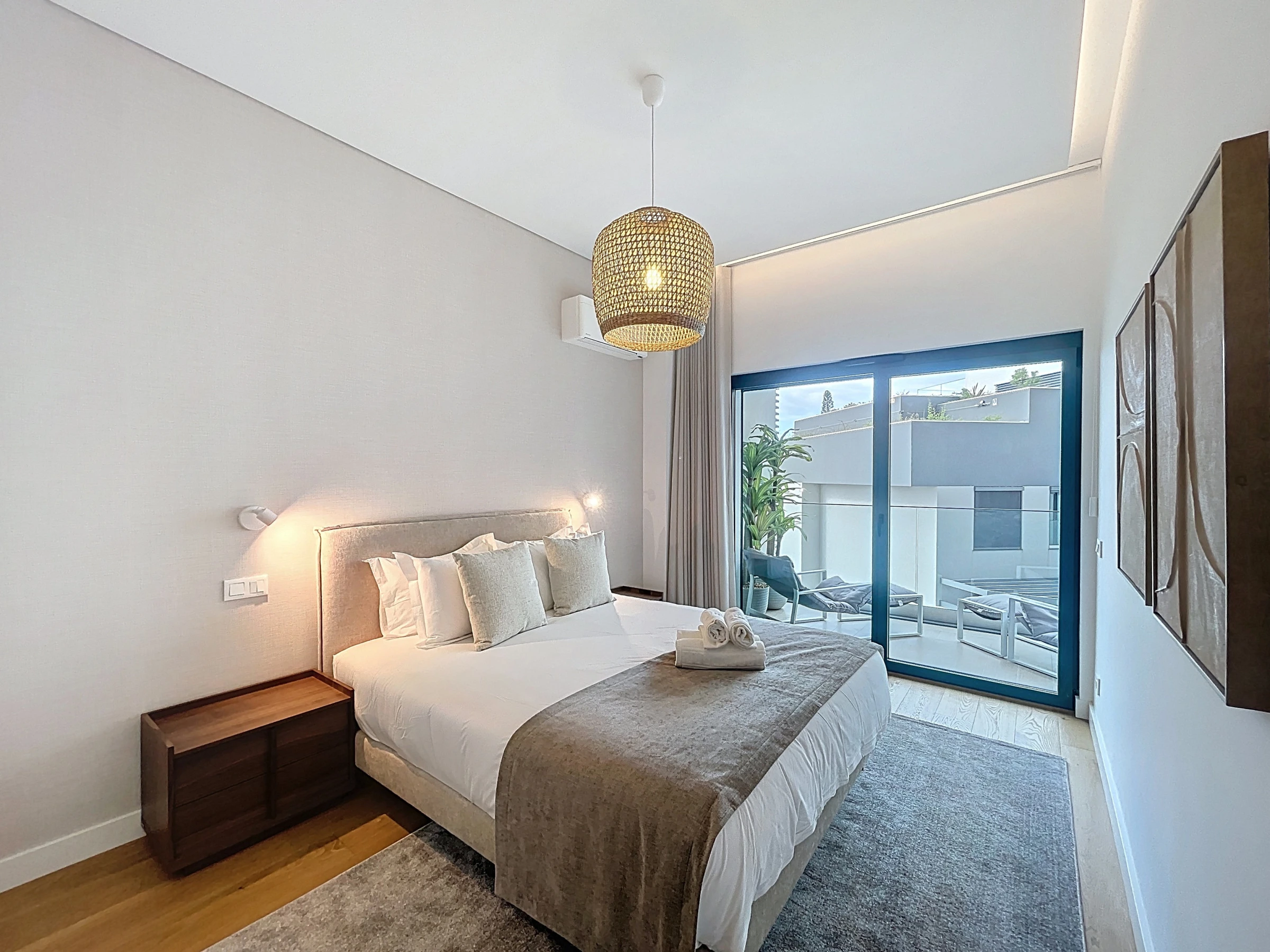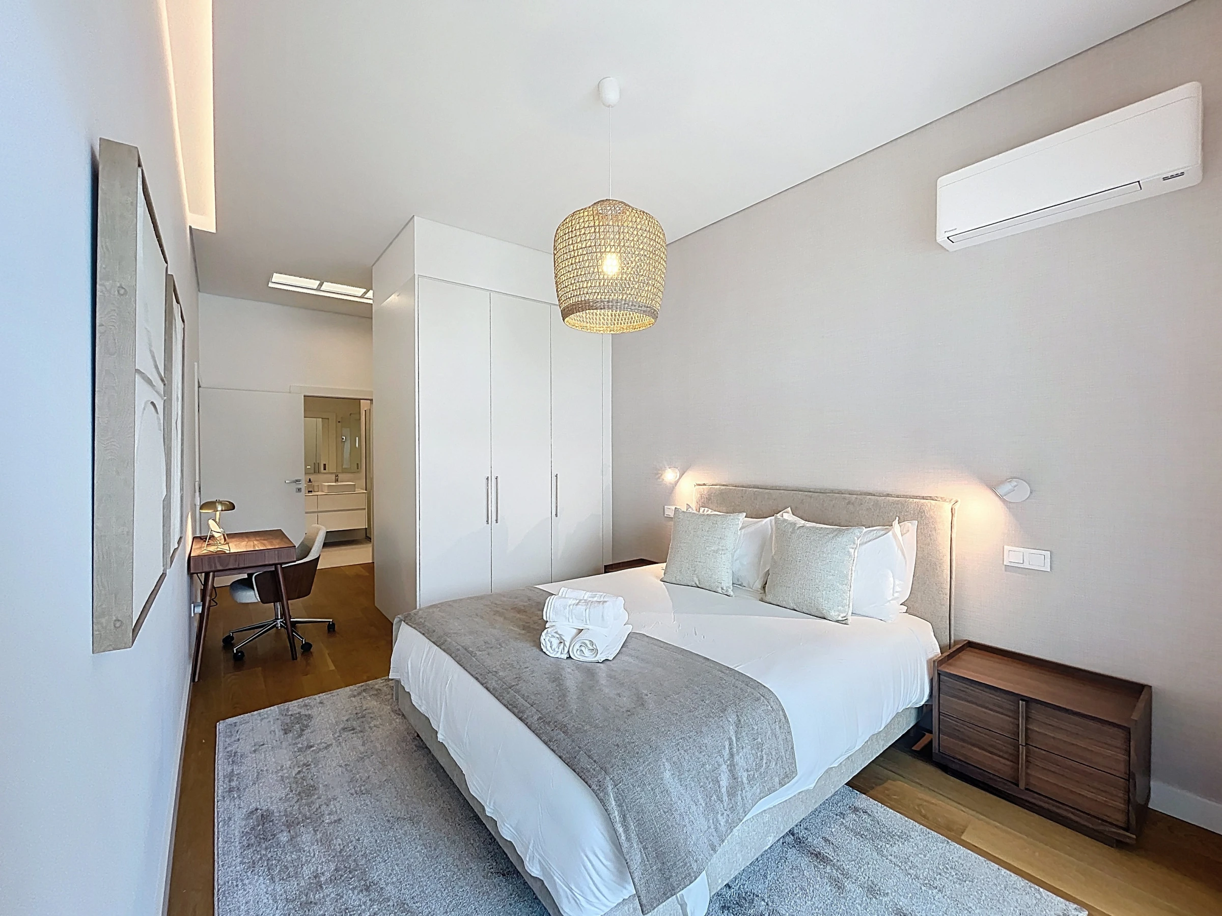 Die voll ausgestattete Küche umfasst einen Kühlschrank, Gefrierschrank, Backofen, Mikrowelle, Herd, Besteck, Teller und alle wesentlichen Utensilien, die zum Zubereiten von Mahlzeiten zu Hause benötigt werden. Eine Waschmaschine und ein Föhn sind ebenfalls verfügbar und sorgen für zusätzlichen Komfort während längerer Aufenthalte. Der Wohnbereich bietet einen Smart-TV mit Box und Klimaanlage und schafft so einen angenehmen Raum zum Entspannen.