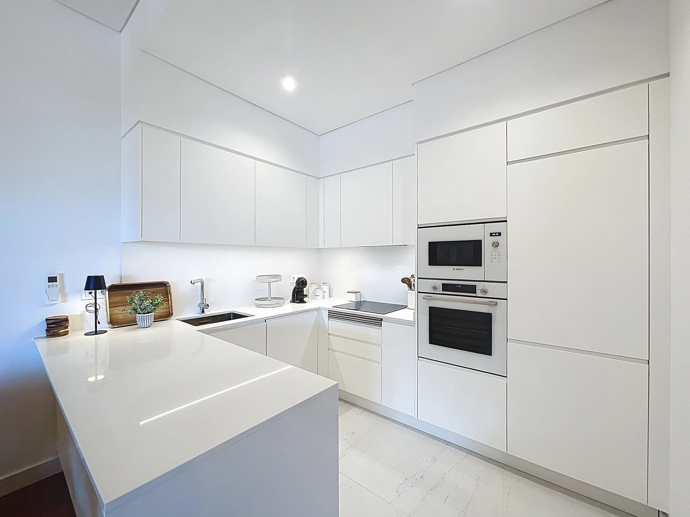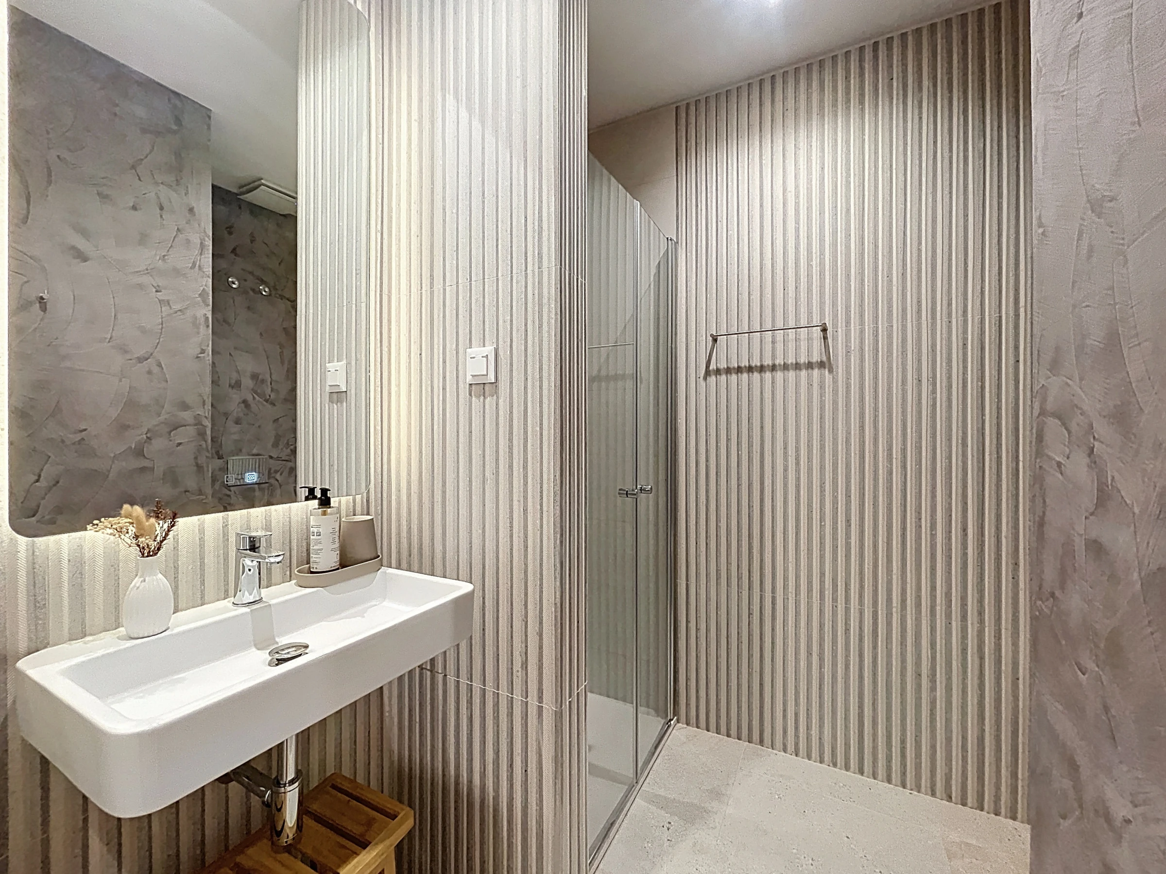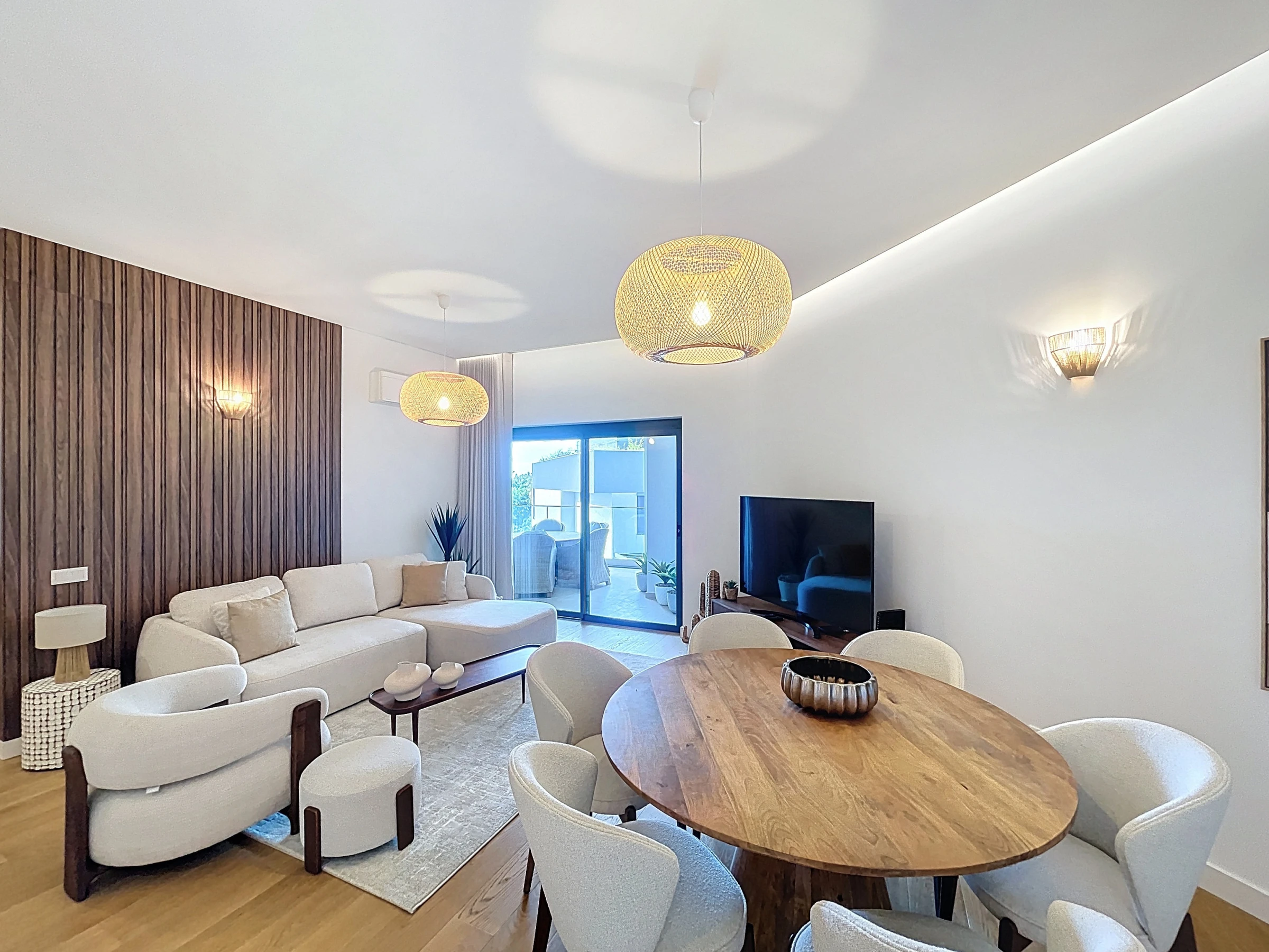 Die voll ausgestattete Küche umfasst einen Kühlschrank, Gefrierschrank, Backofen, Mikrowelle, Herd, Besteck, Teller und alle wesentlichen Utensilien, die zum Zubereiten von Mahlzeiten zu Hause benötigt werden. Eine Waschmaschine und ein Föhn sind ebenfalls verfügbar und sorgen für zusätzlichen Komfort während längerer Aufenthalte. Der Wohnbereich bietet einen Smart-TV mit Box und Klimaanlage und schafft so einen angenehmen Raum zum Entspannen.