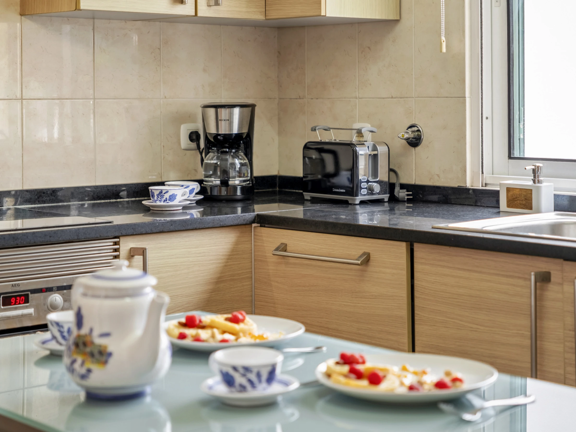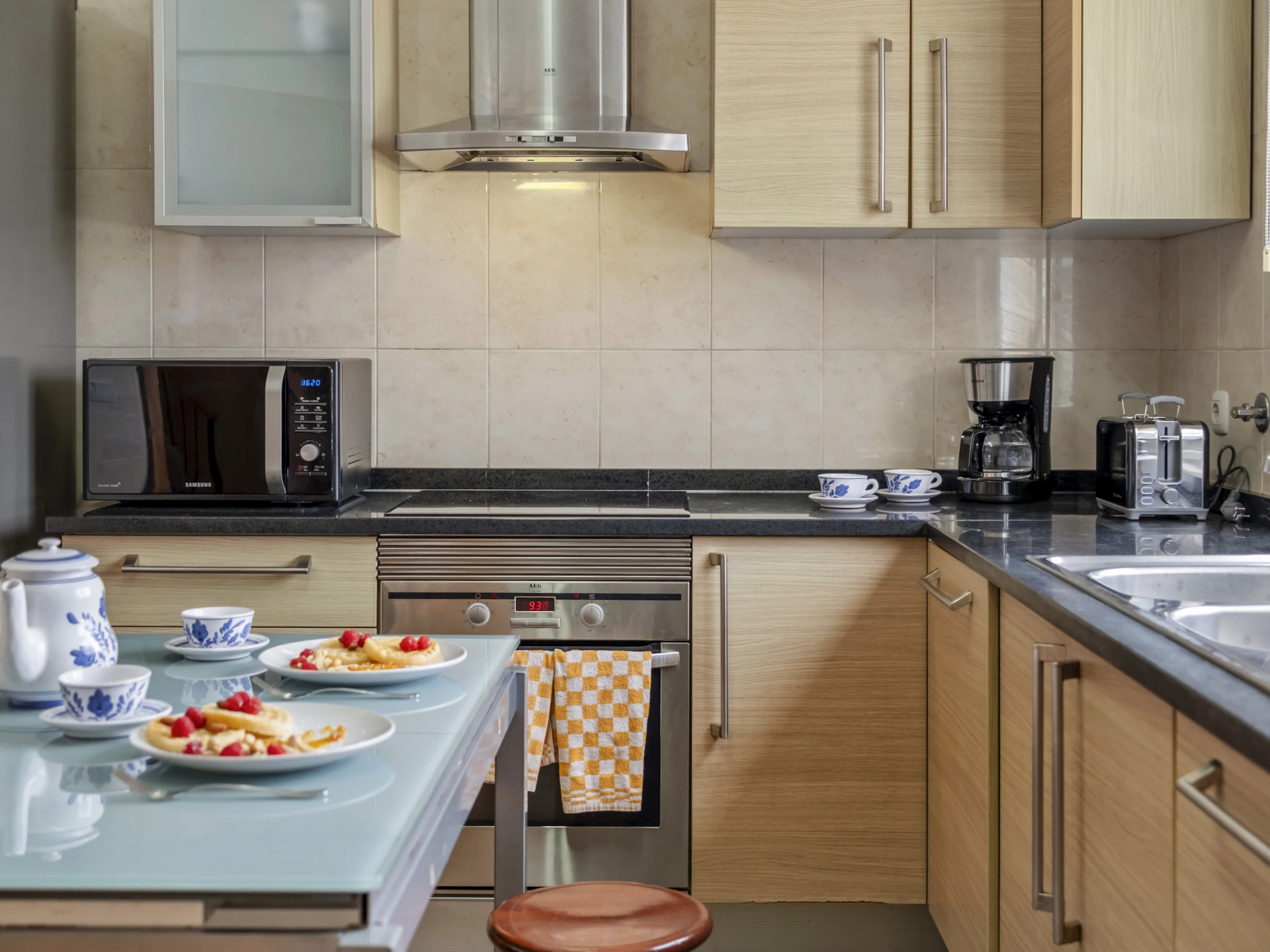 Dieses offene küche, mit induktions-kochfeld, ist ausgestattet in kühlschrank, mikrowelle, backofen, gefrierschrank, spülmaschine, geschirr/besteck, kochutensilien, kaffeemaschine, toaster und wasserkocher.