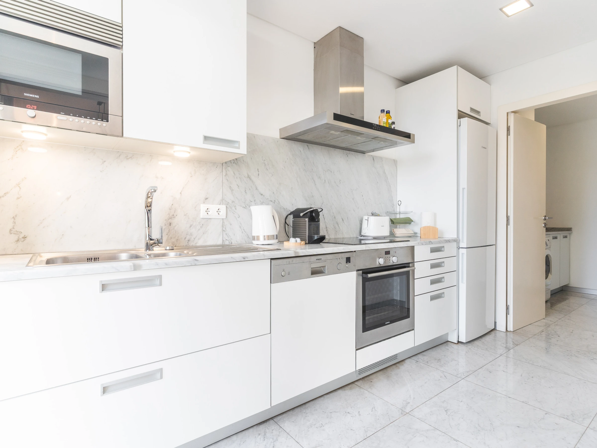 Die Küche ist vollständig ausgestattet mit allen wesentlichen Geräten und Utensilien, einschließlich Kühlschrank, Gefrierschrank, Backofen, Mikrowelle, Herd, Besteck, Tellern und allem, was zum Zubereiten von Heimgerichten benötigt wird. Eine Waschmaschine und ein Föhn stehen den Gästen ebenfalls zur Verfügung. Für Familien, die mit kleinen Kindern reisen, können auf Anfrage ein Babybett und ein Hochstuhl bereitgestellt werden.