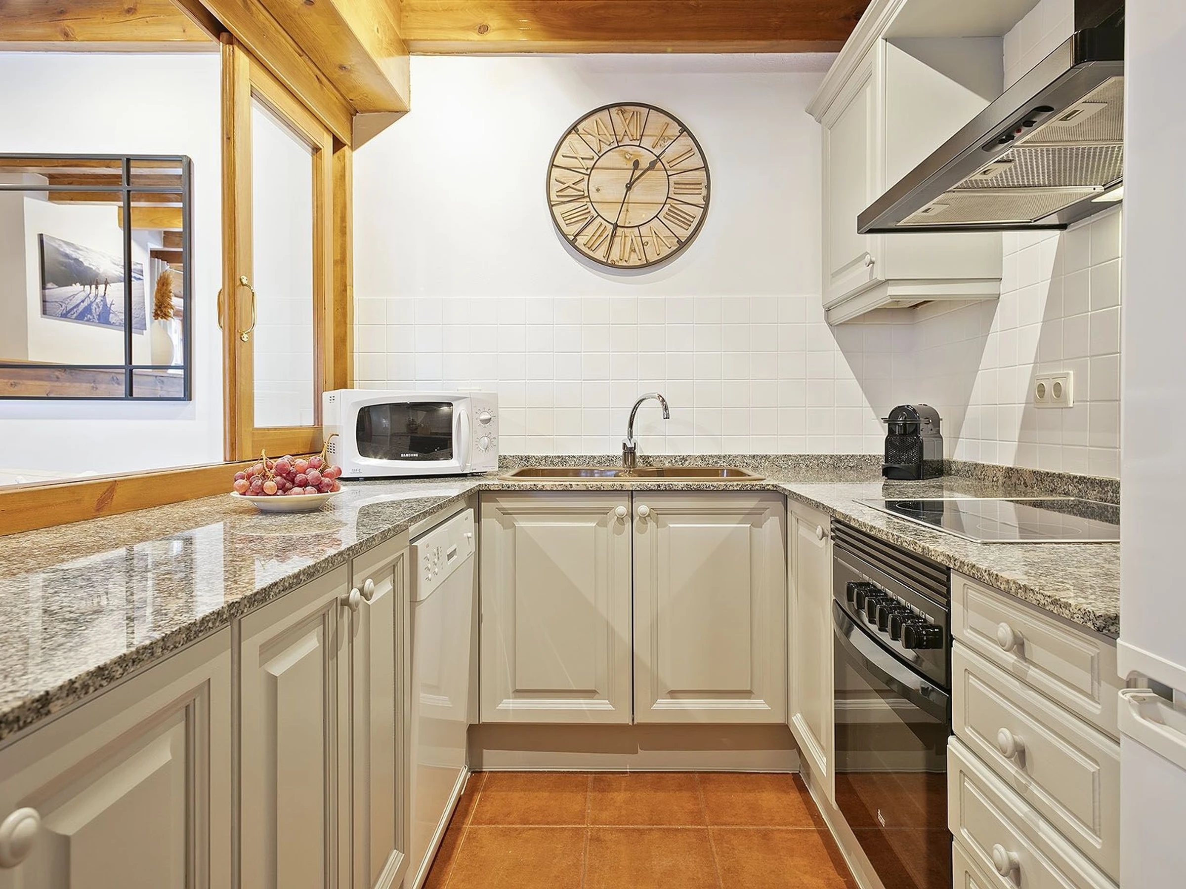 Dieses küche, ist ausgestattet in kühlschrank, mikrowelle, backofen, gefrierschrank, spülmaschine, kochutensilien, kaffeemaschine, toaster, wasserkocher und saftpresse.
