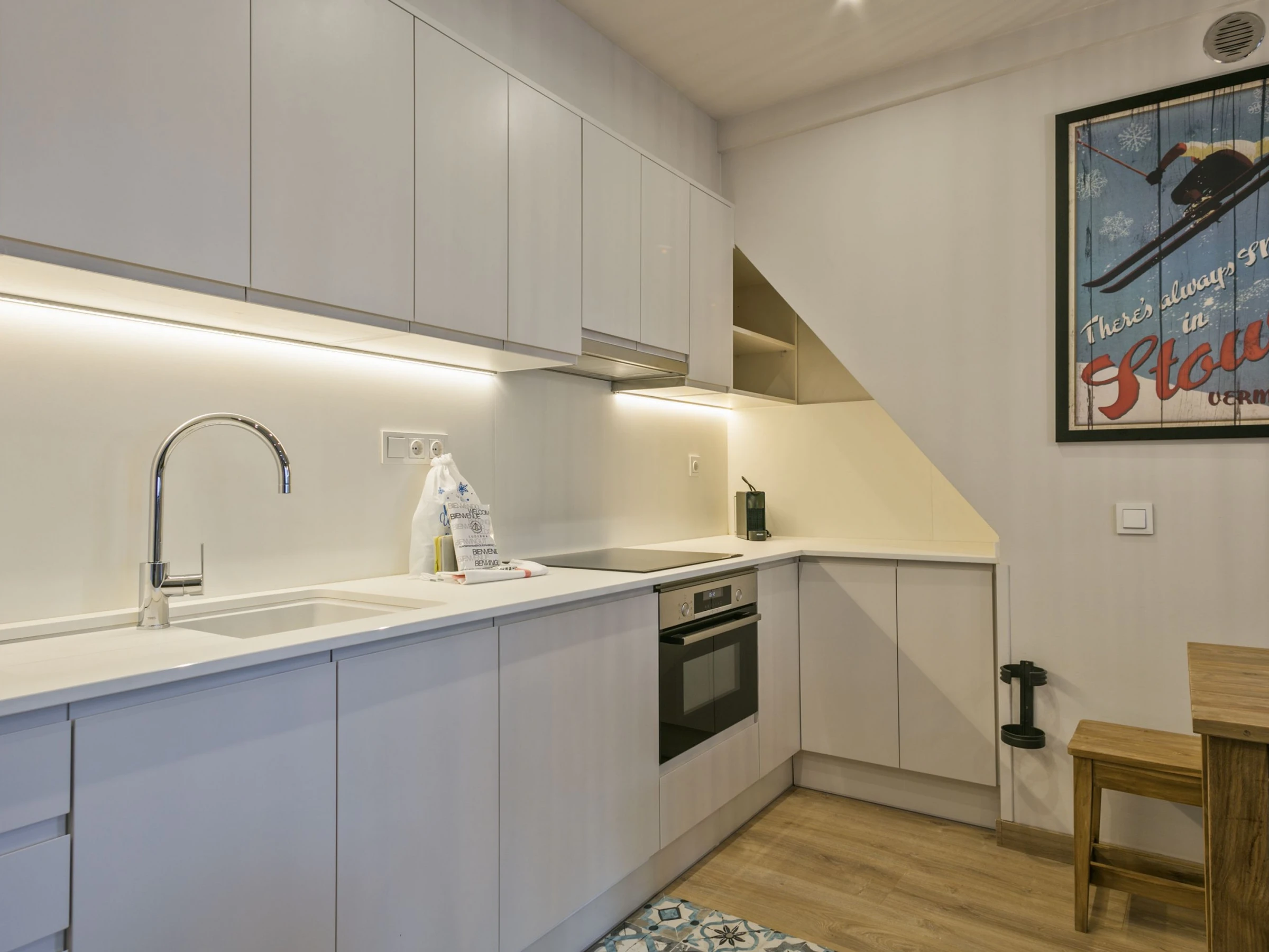 Dieses küche, ist ausgestattet in kühlschrank, gefrierschrank, spülmaschine, kochutensilien, kaffeemaschine, toaster, wasserkocher und saftpresse.