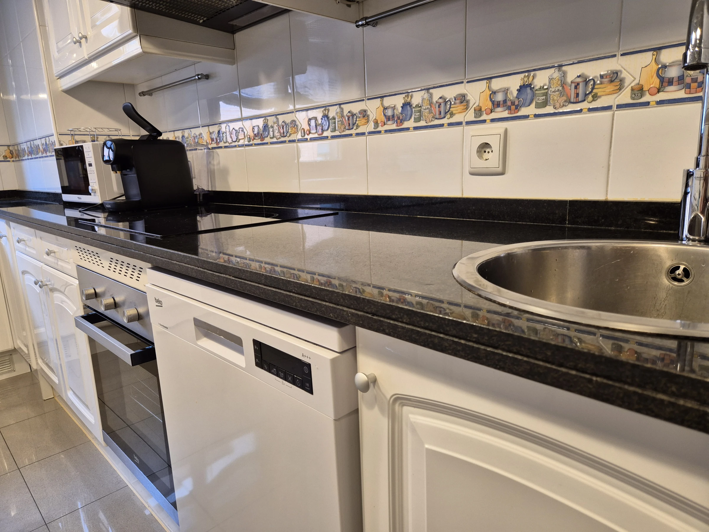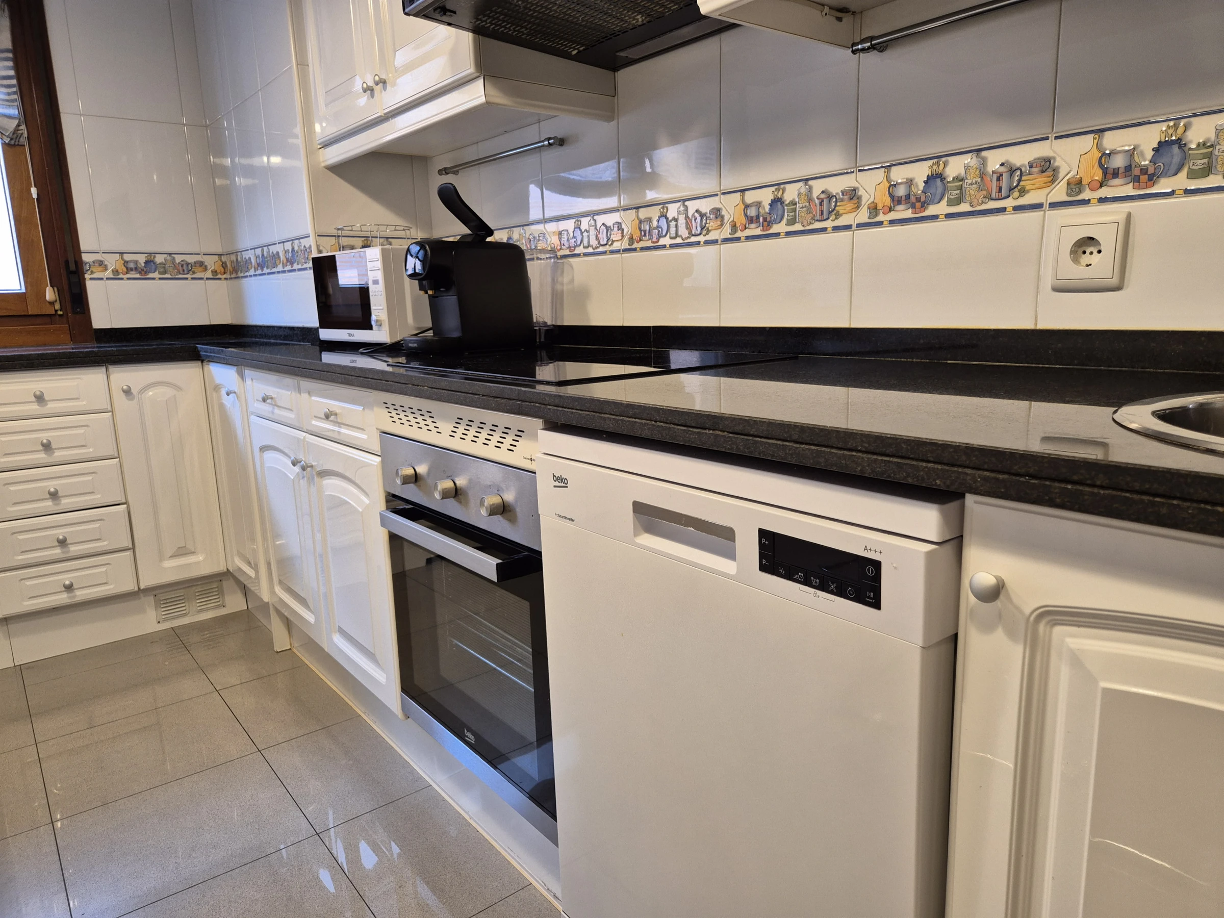 La cocina independiente, de vitrocerámica, está completamente equipada con nevera, microondas, horno, congelador, lavavajillas, utensilios de cocina, cafetera, tostadora y exprimidor, perfecta para disfrutar de una estancia práctica y confortable.