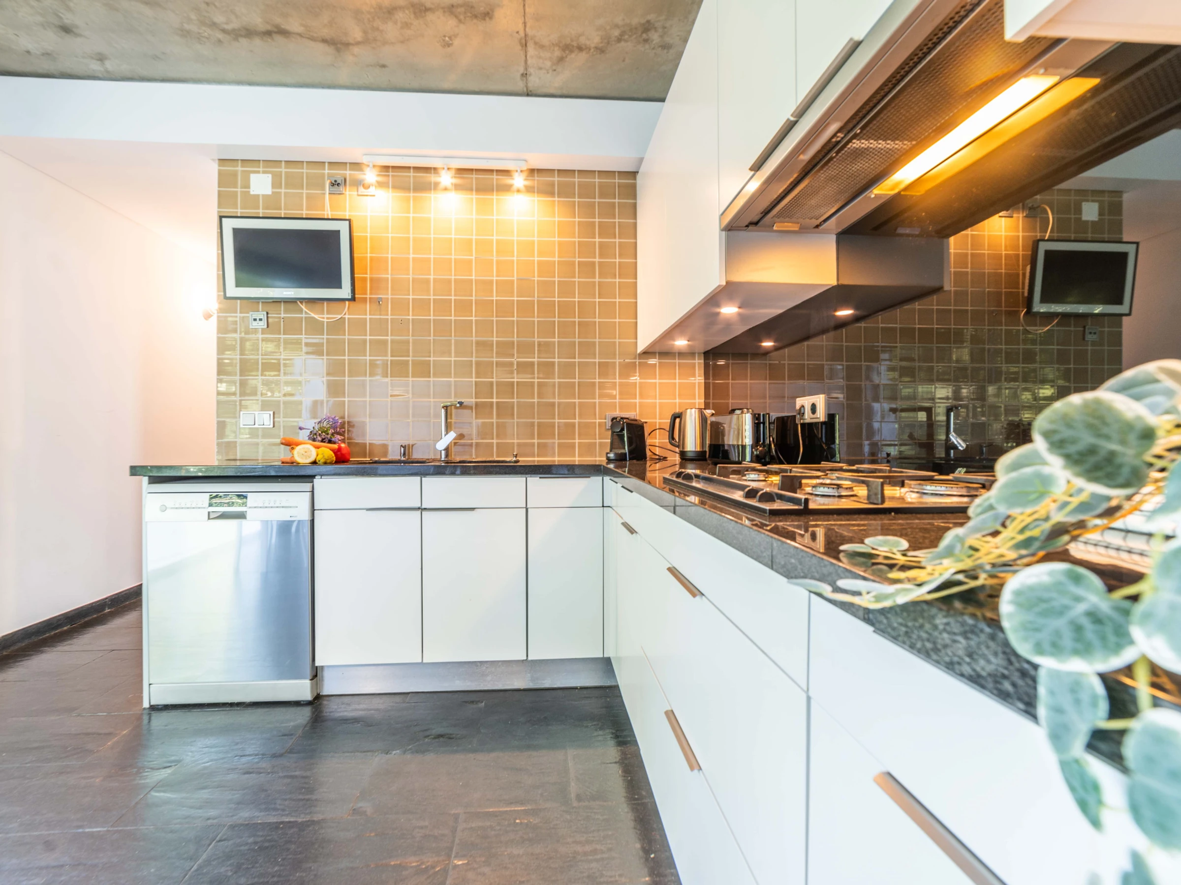 Dieses offene küche, mit gas-kochfeld, ist ausgestattet in kühlschrank, mikrowelle, backofen, gefrierschrank, spülmaschine, geschirr/besteck, kochutensilien, kaffeemaschine, toaster und wasserkocher.