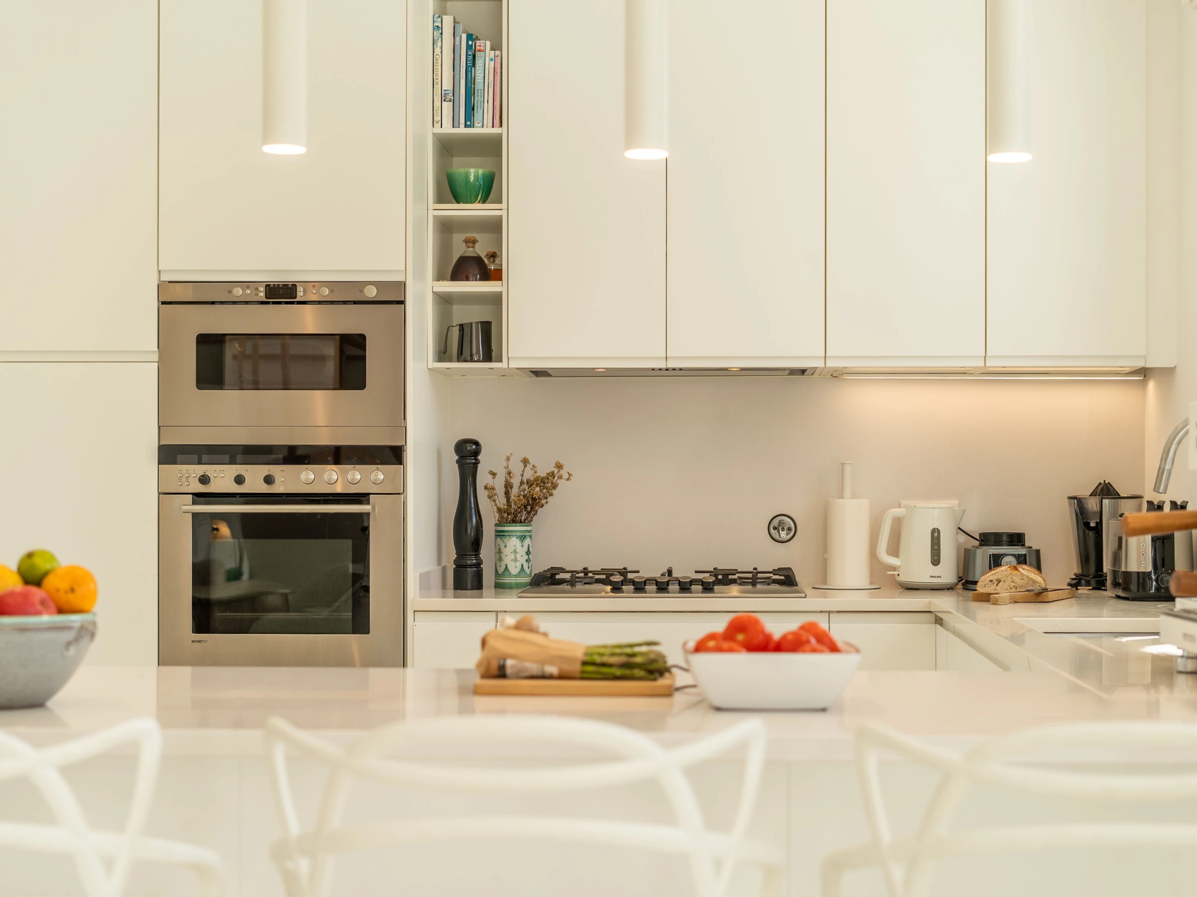 Dieses küche, ist ausgestattet in kühlschrank, mikrowelle, backofen, gefrierschrank, spülmaschine, geschirr/besteck, kochutensilien, kaffeemaschine, toaster, wasserkocher und saftpresse.