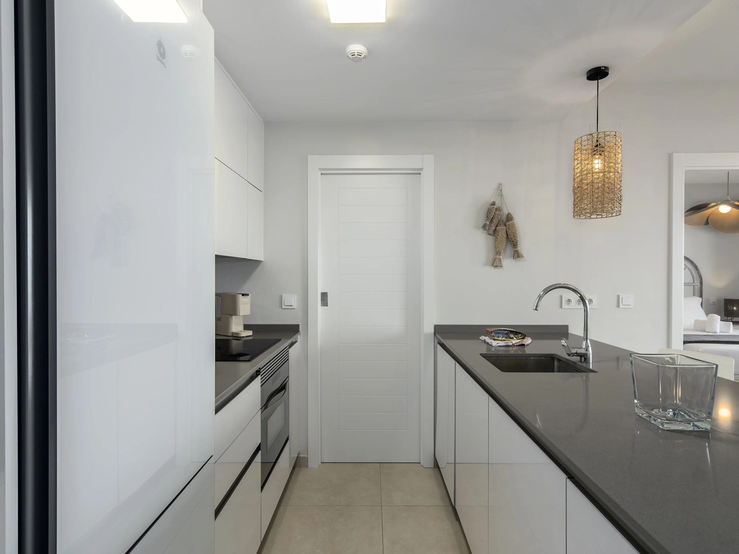 Die Wohnung verfügt über zwei Schlafzimmer, die bis zu 4 Personen bequem beherbergen können, mit einer Aufteilung von einem Doppelbett und zwei Einzelbetten. Es gibt zwei vollständige Badezimmer mit Dusche, was das Zusammenleben während des Urlaubs erleichtert. Die offene Küche ist komplett ausgestattet mit modernen Haushaltsgeräten wie Waschmaschine, Geschirrspüler, Ofen, Mikrowelle und Kaffeemaschine, die es ermöglichen, köstliche Mahlzeiten zuzubereiten.