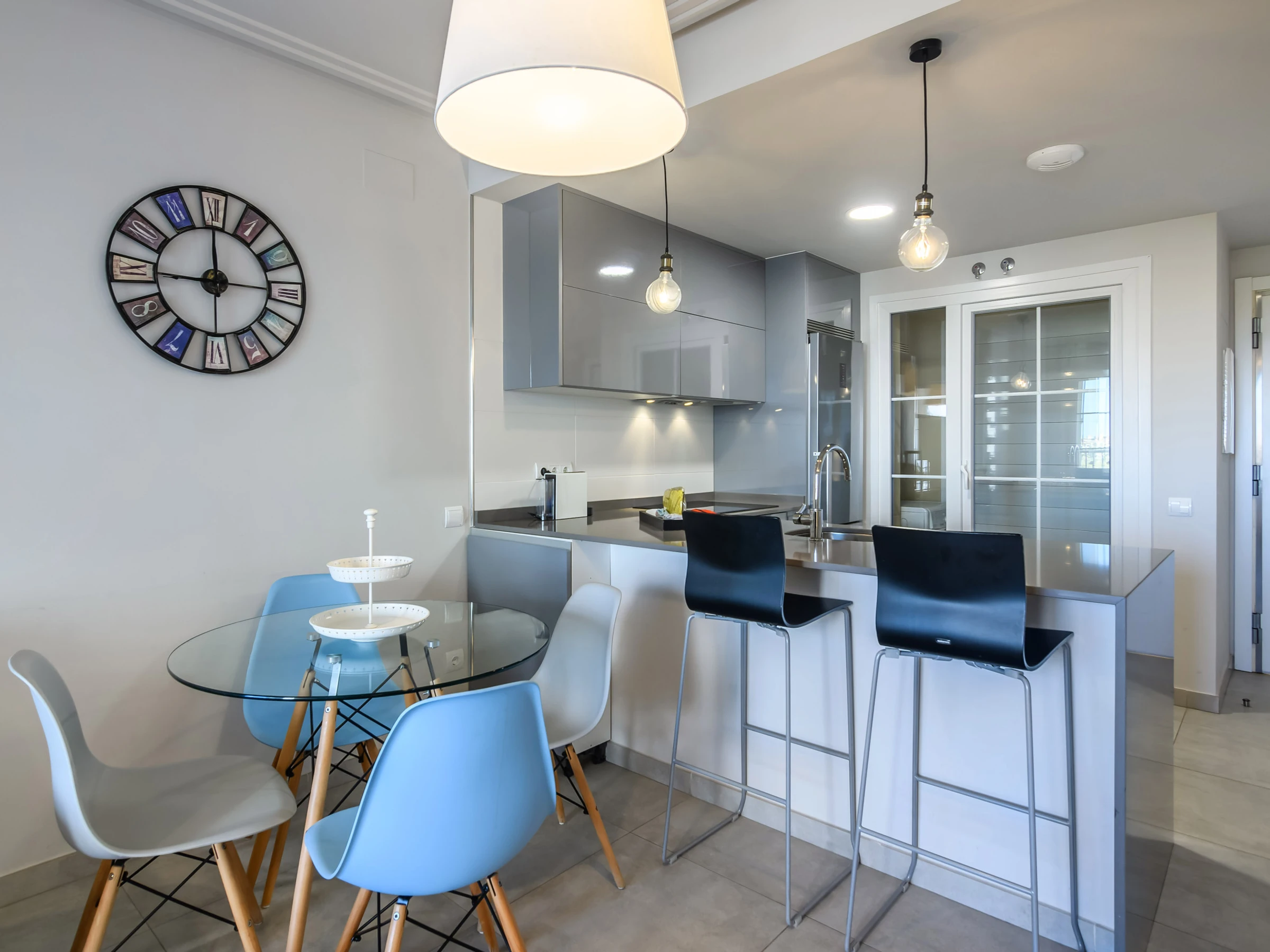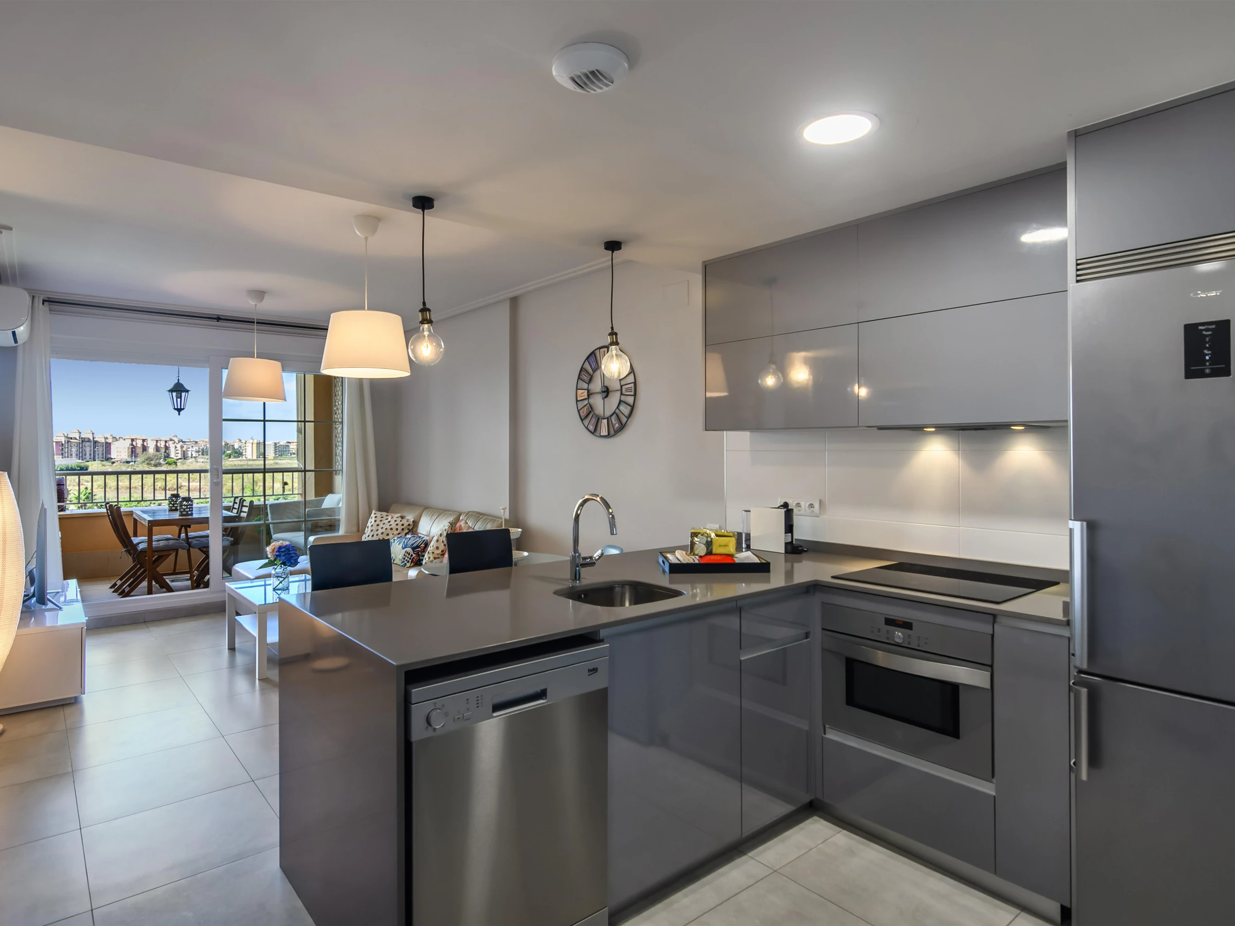 Dieses offene küche, mit ceranfeld, ist ausgestattet in kühlschrank, mikrowelle, backofen, gefrierschrank, spülmaschine, geschirr/besteck, kochutensilien, kaffeemaschine, toaster und saftpresse.