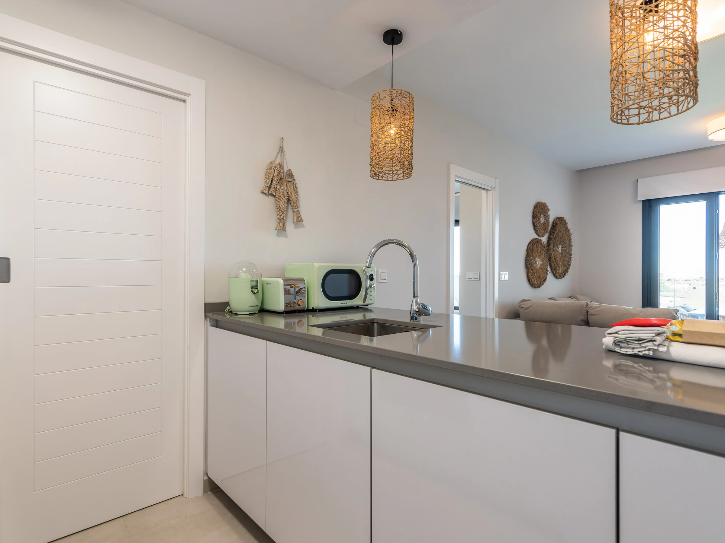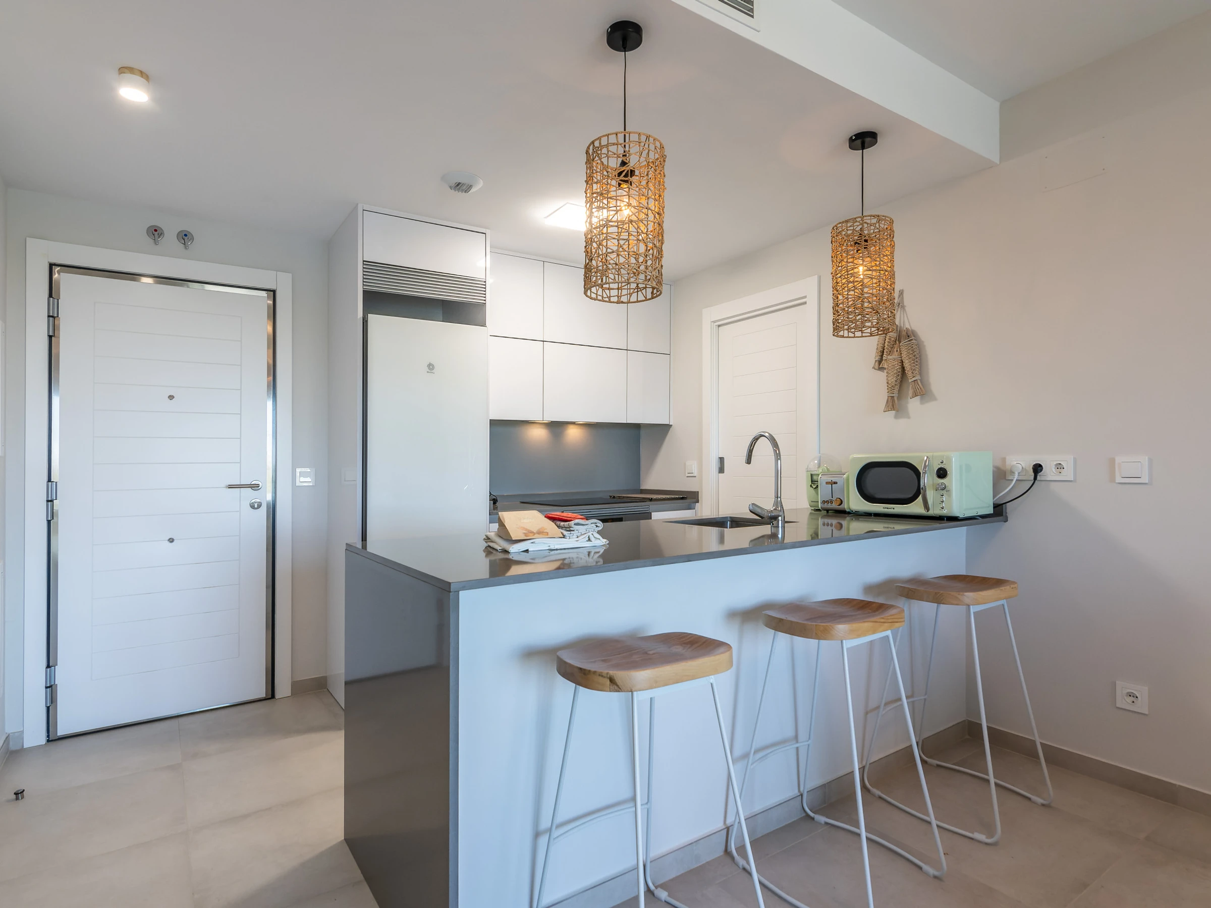 Dieses offene küche, mit ceranfeld, ist ausgestattet in kühlschrank, mikrowelle, backofen, gefrierschrank, spülmaschine, geschirr/besteck, kochutensilien, kaffeemaschine, toaster, wasserkocher und saftpresse.