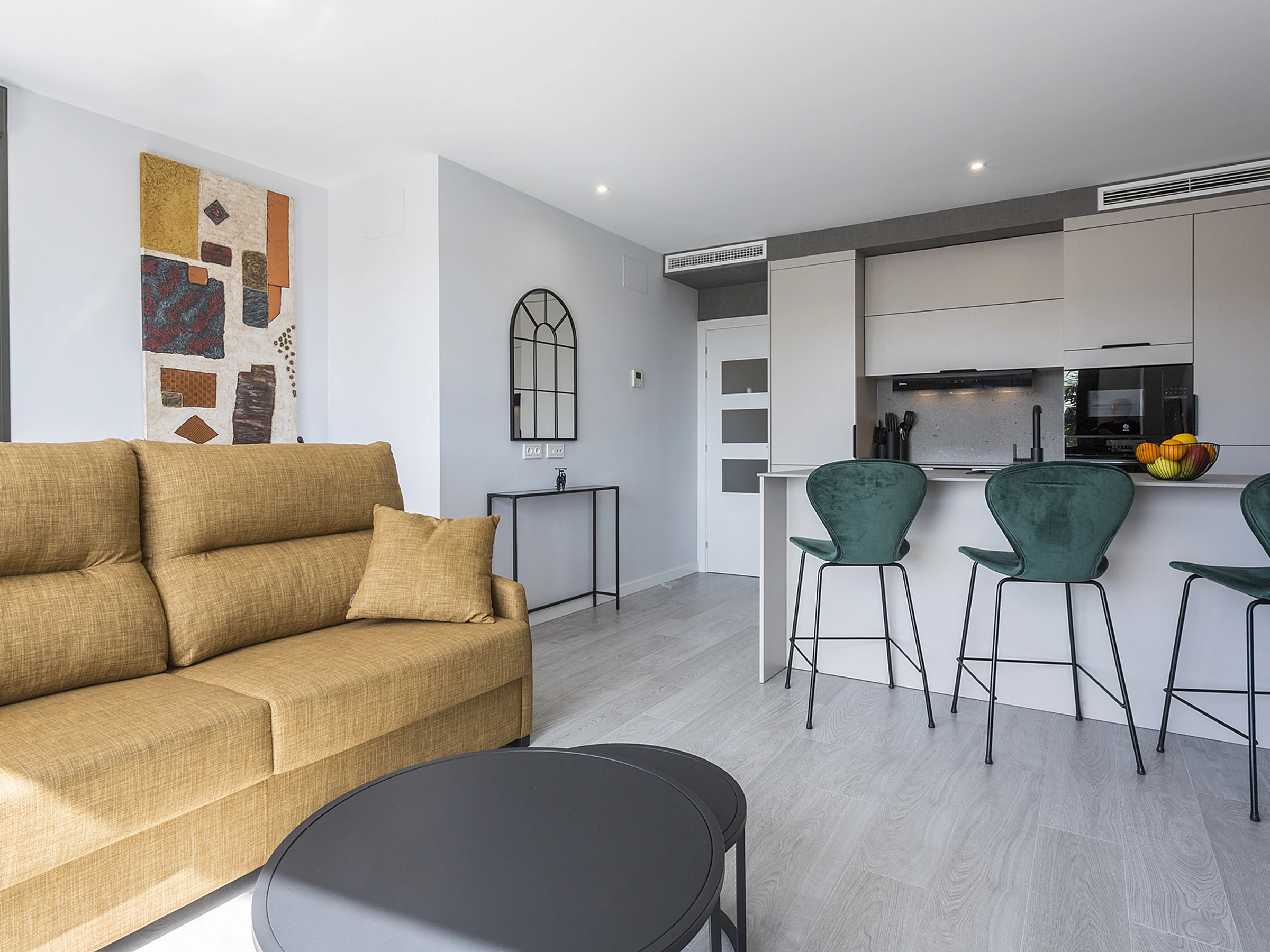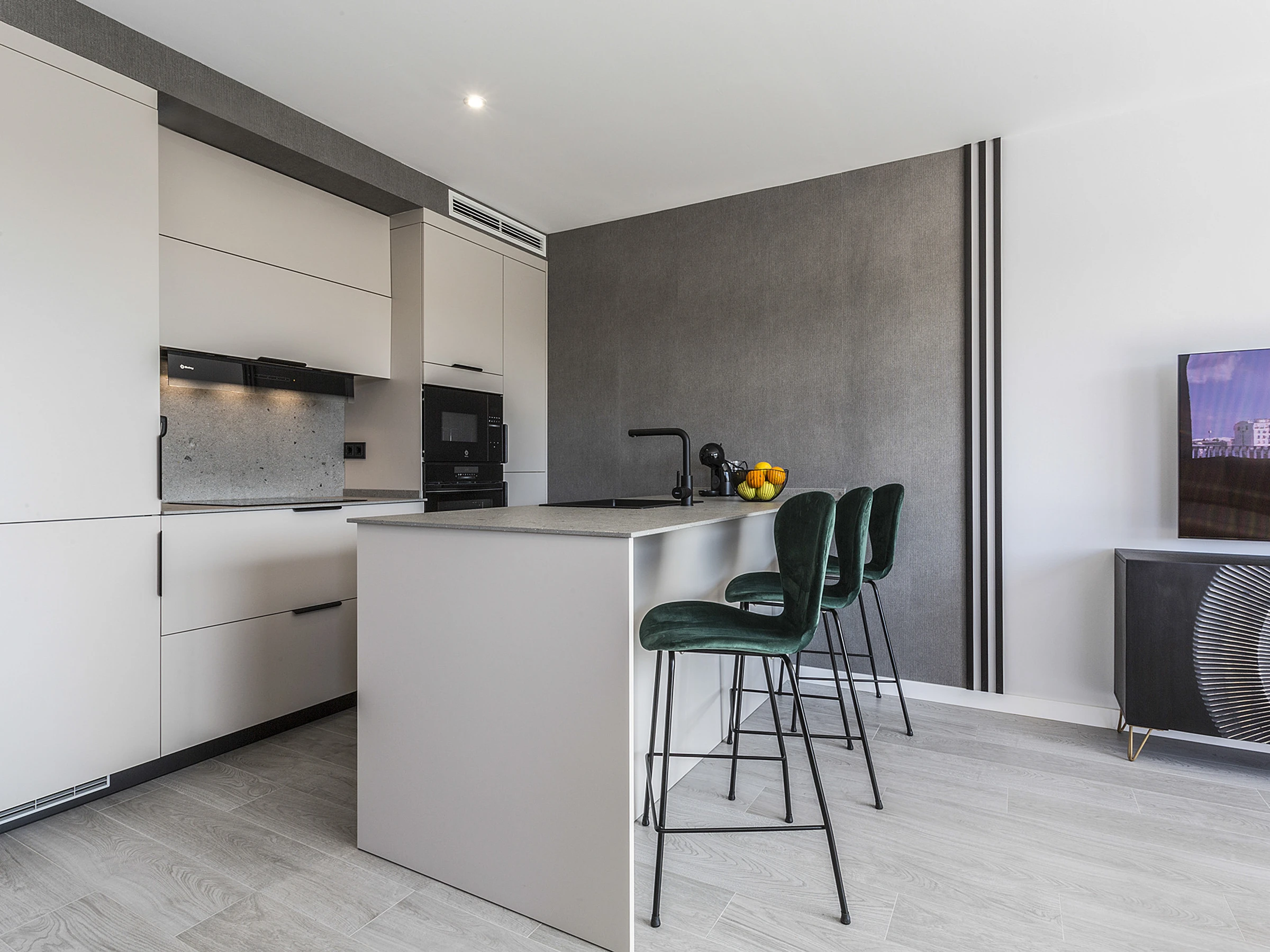 Dieses offene küche, mit induktions-kochfeld, ist ausgestattet in kühlschrank, mikrowelle, backofen, gefrierschrank, spülmaschine, geschirr/besteck, kochutensilien, kaffeemaschine, friteuse, toaster und saftpresse.